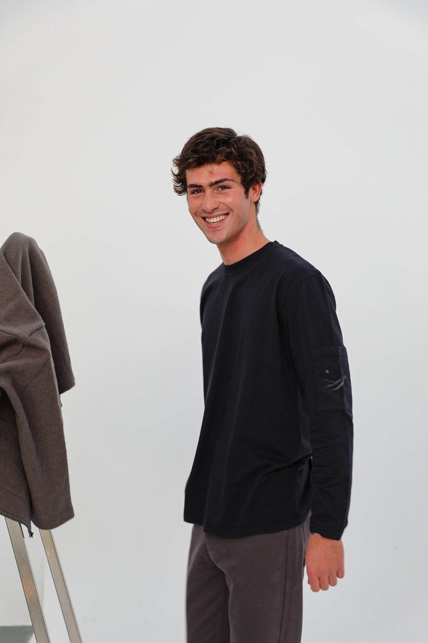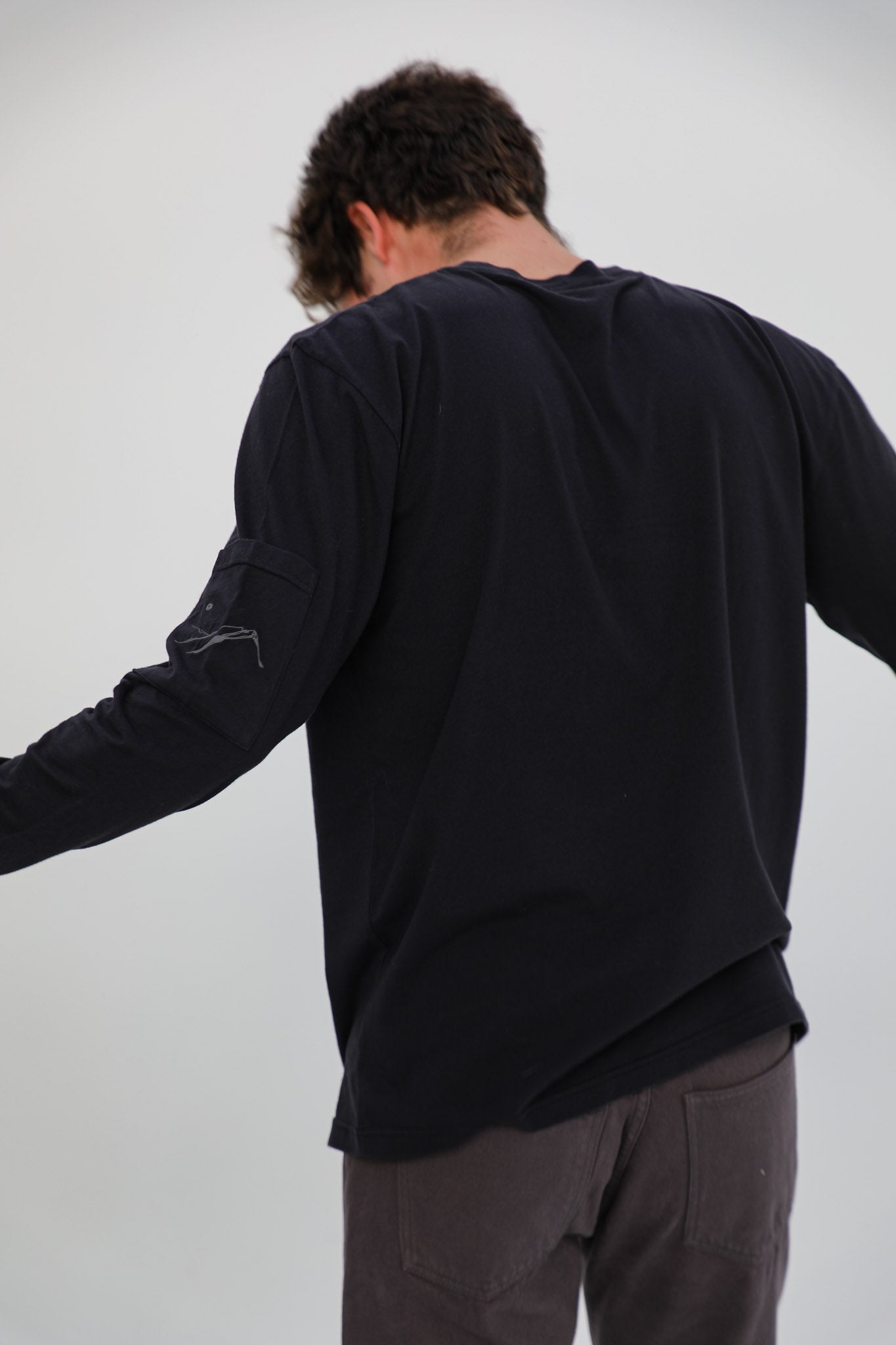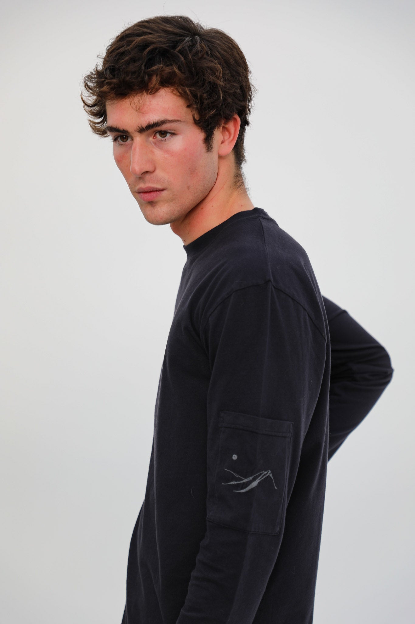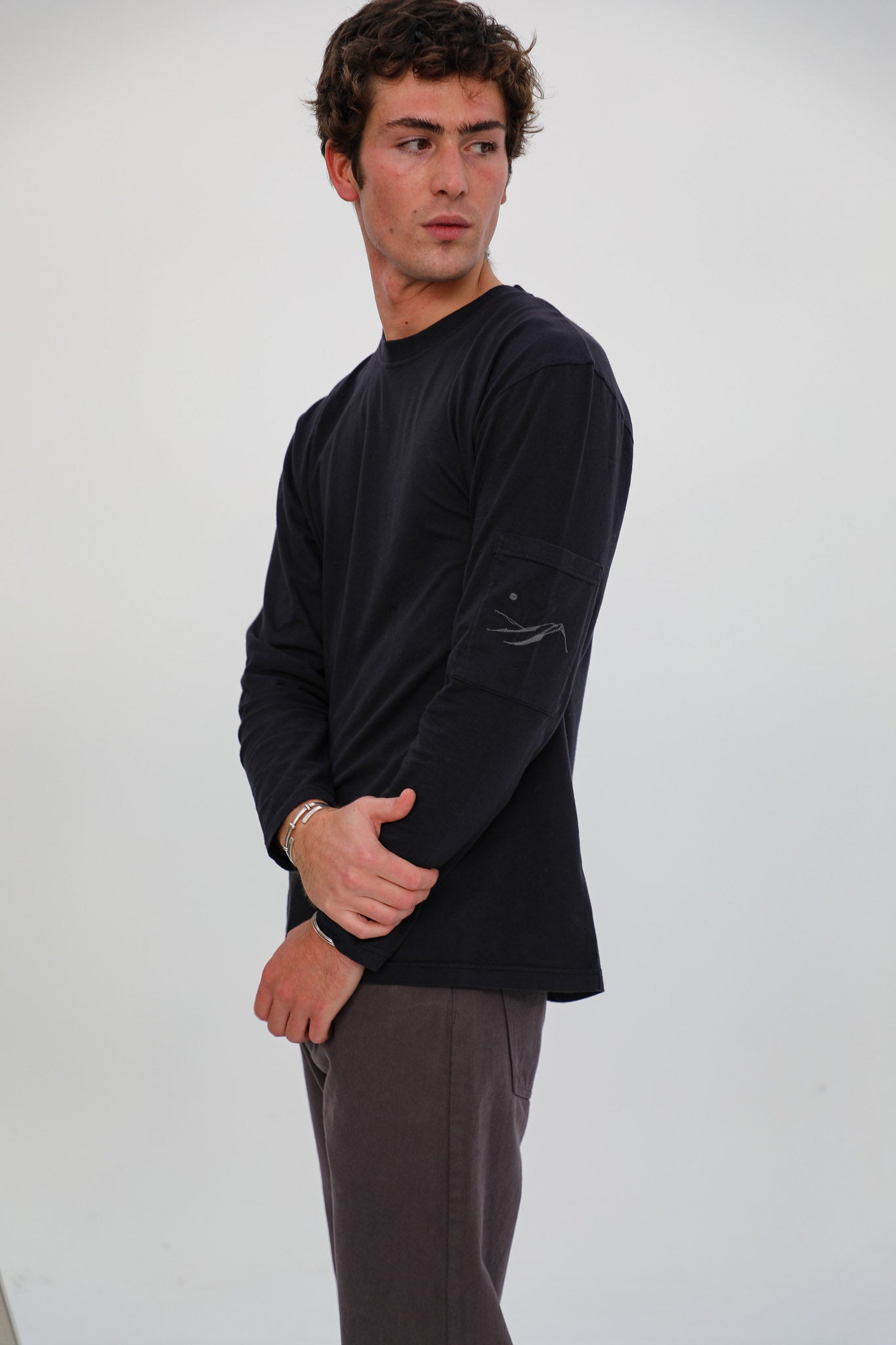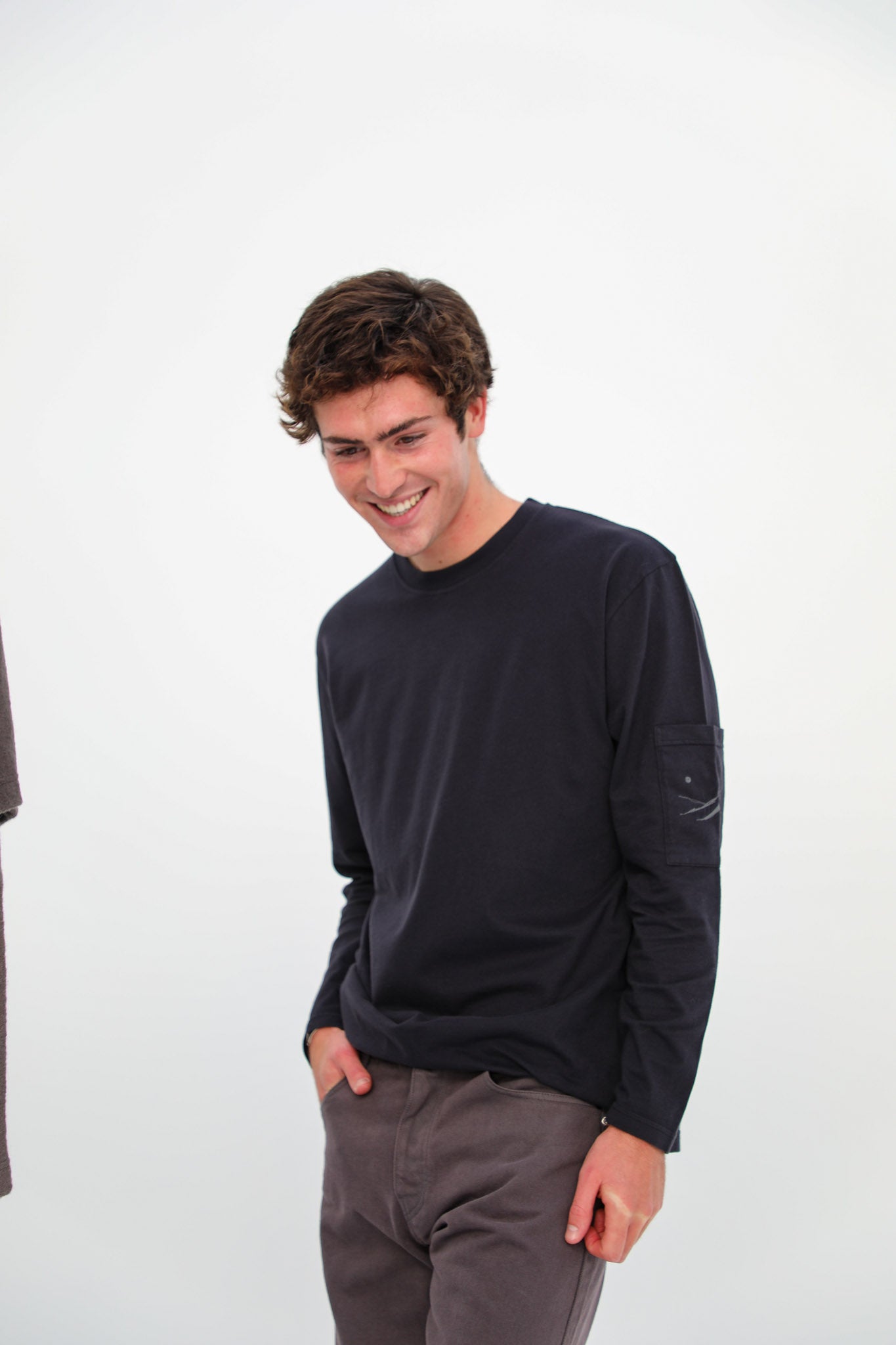 Explore our navy soft long sleeve t-shirt, designed for comfort and functionality. This stylish piece features a practical side pocket, blending casual elegance with everyday practicality.