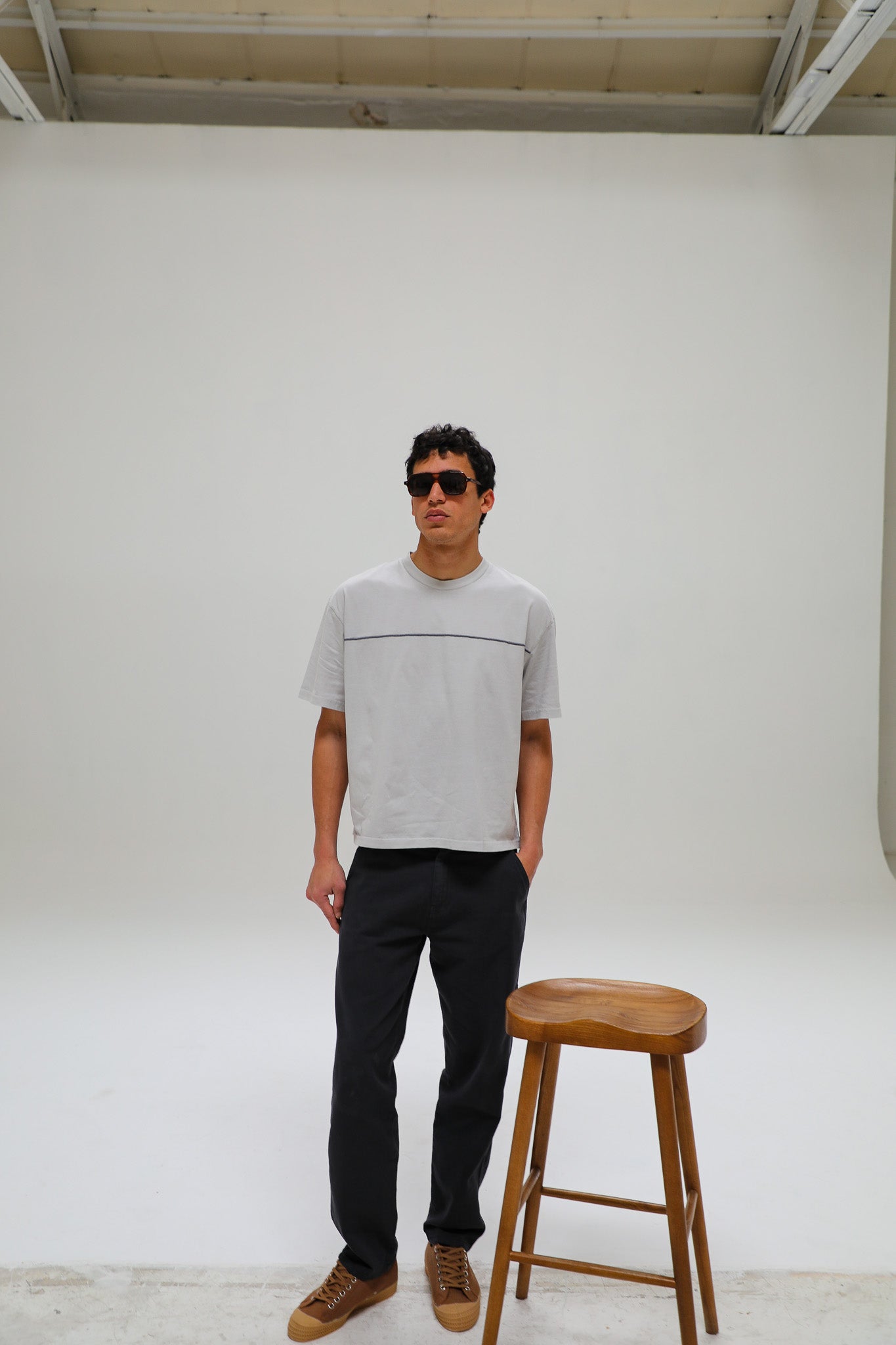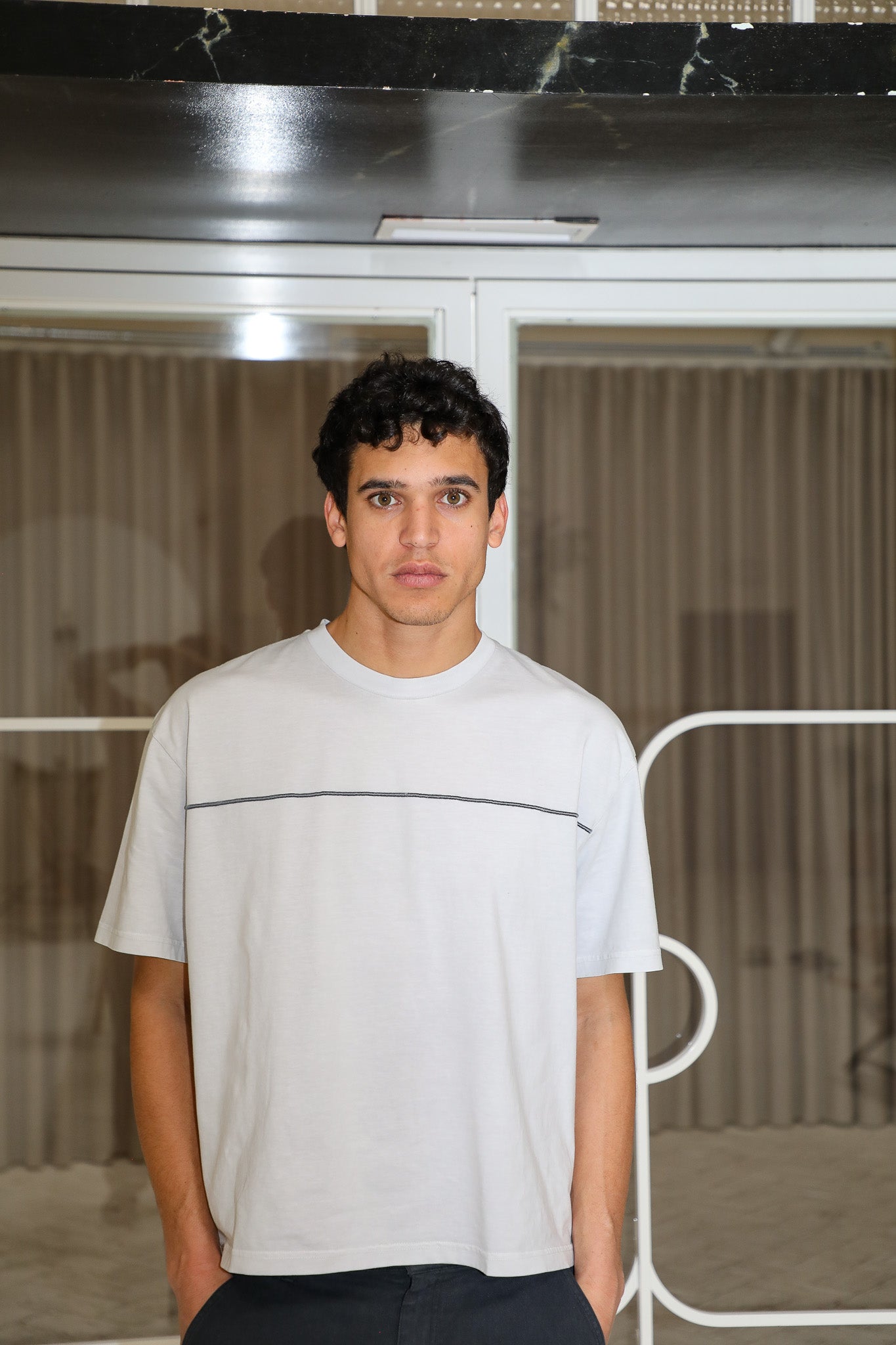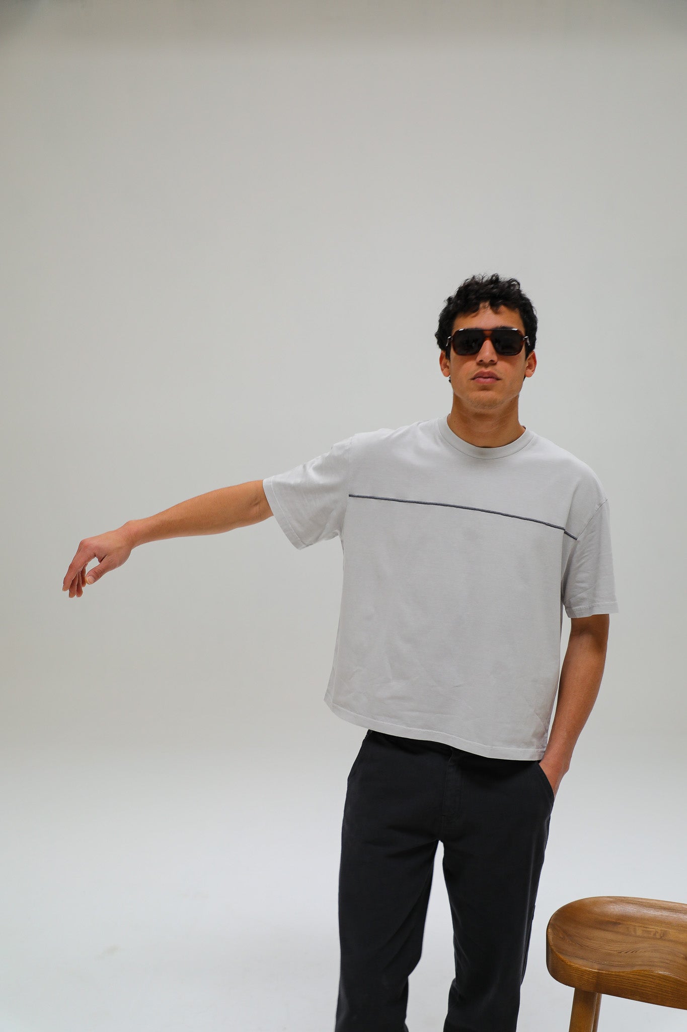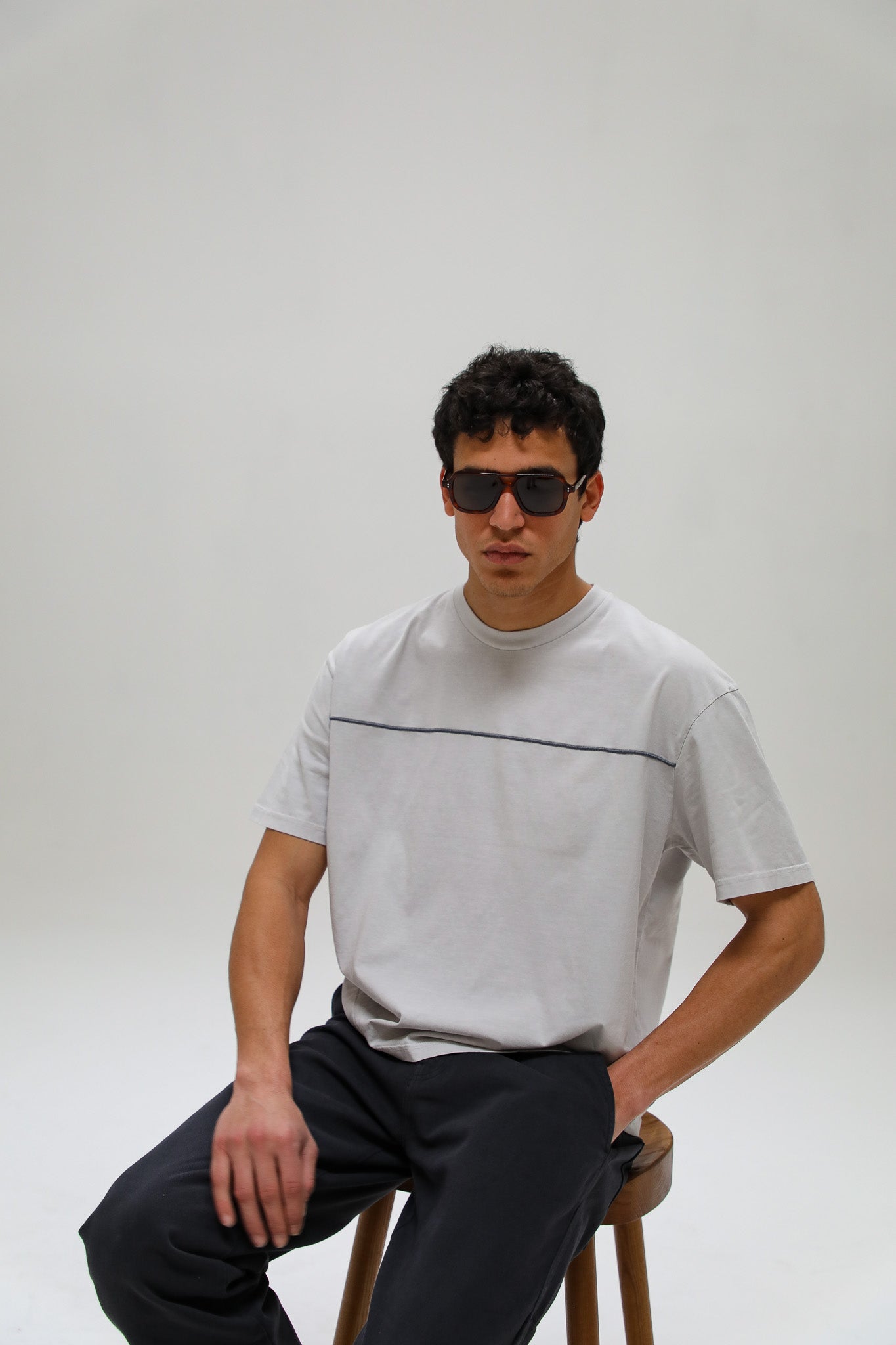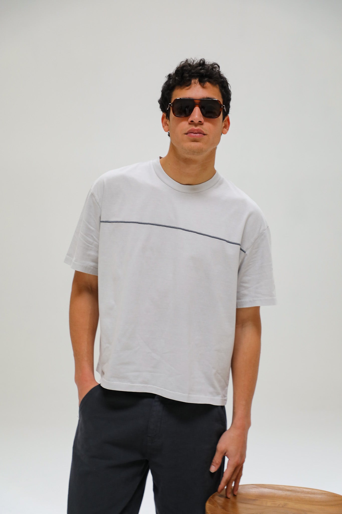 Our grey t-shirt, featuring a cool embroidered line detail across chest, vintage styling, and a washed finish for a timeless look.