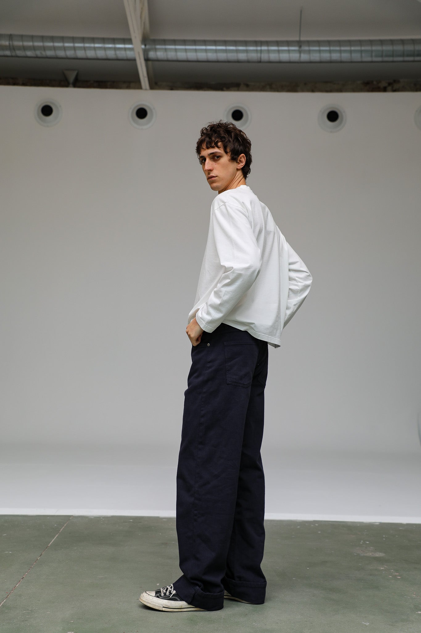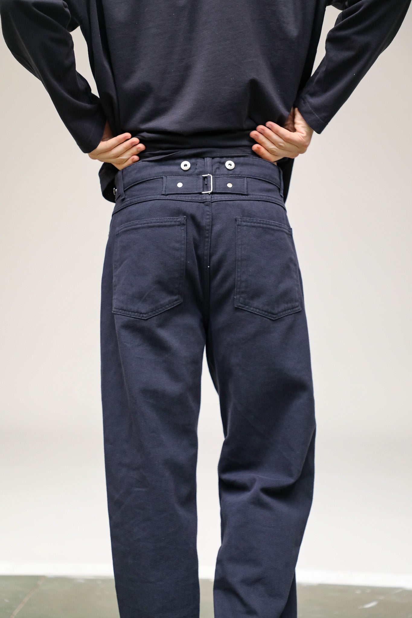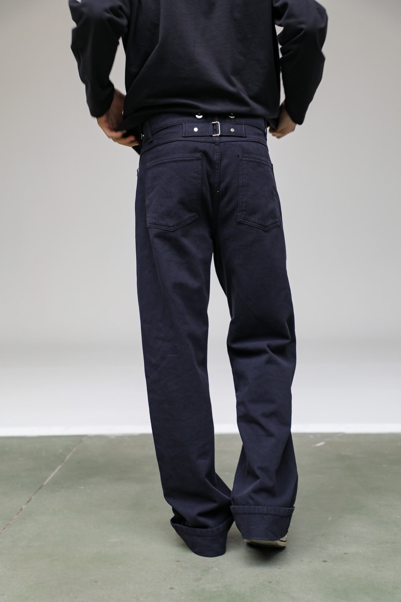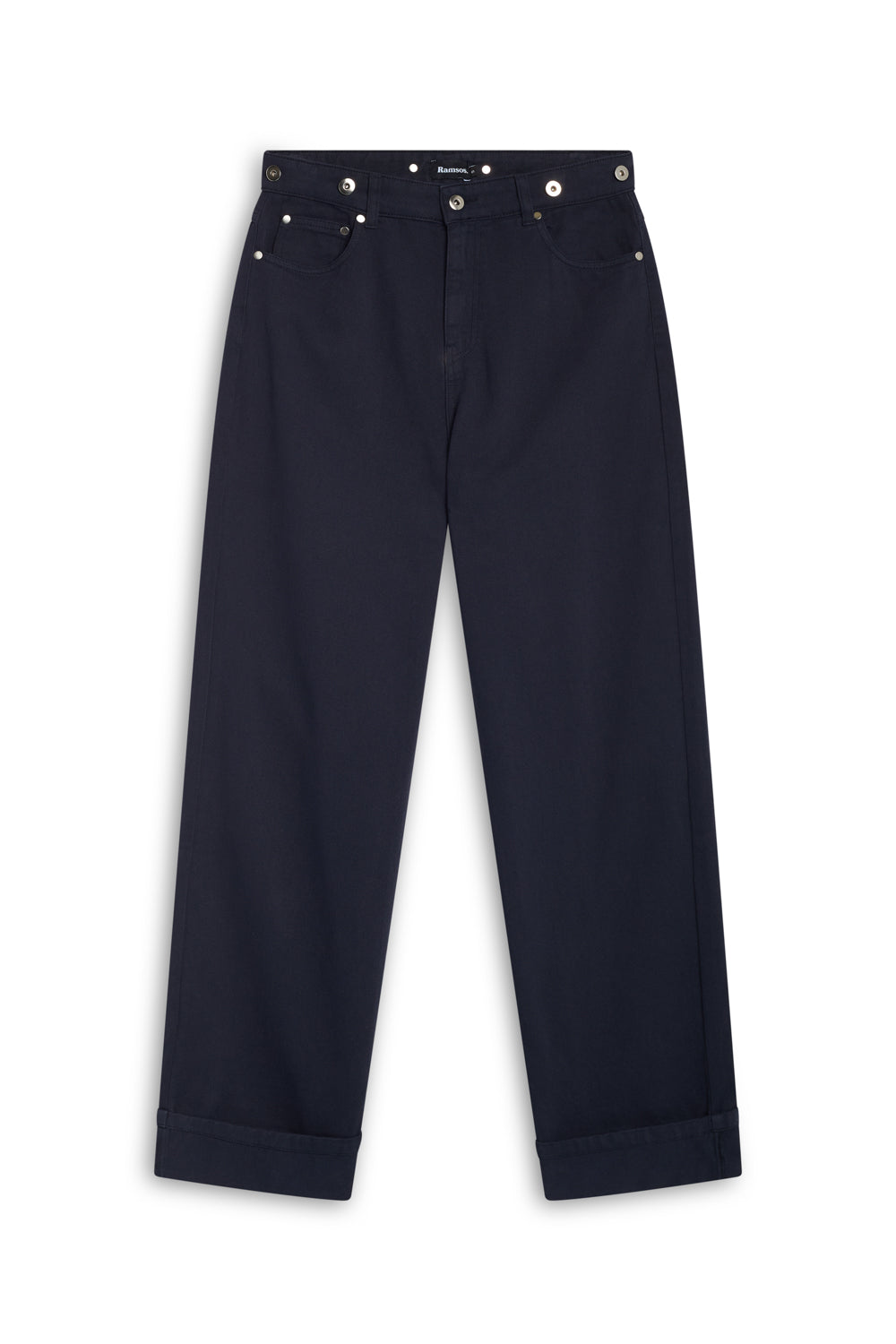 Dark navy straight-leg pants featuring decorative button details along the waistband and a buckle detail at the back.