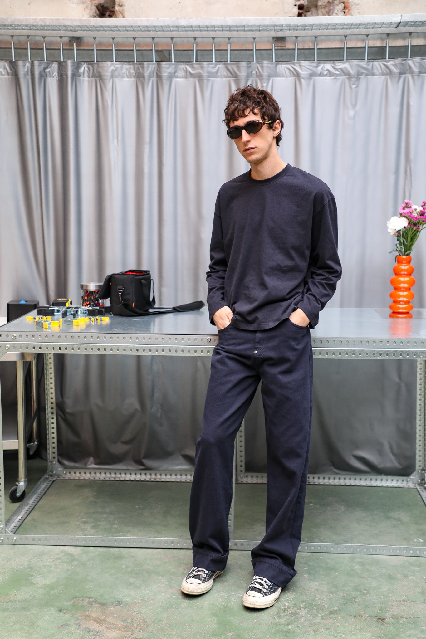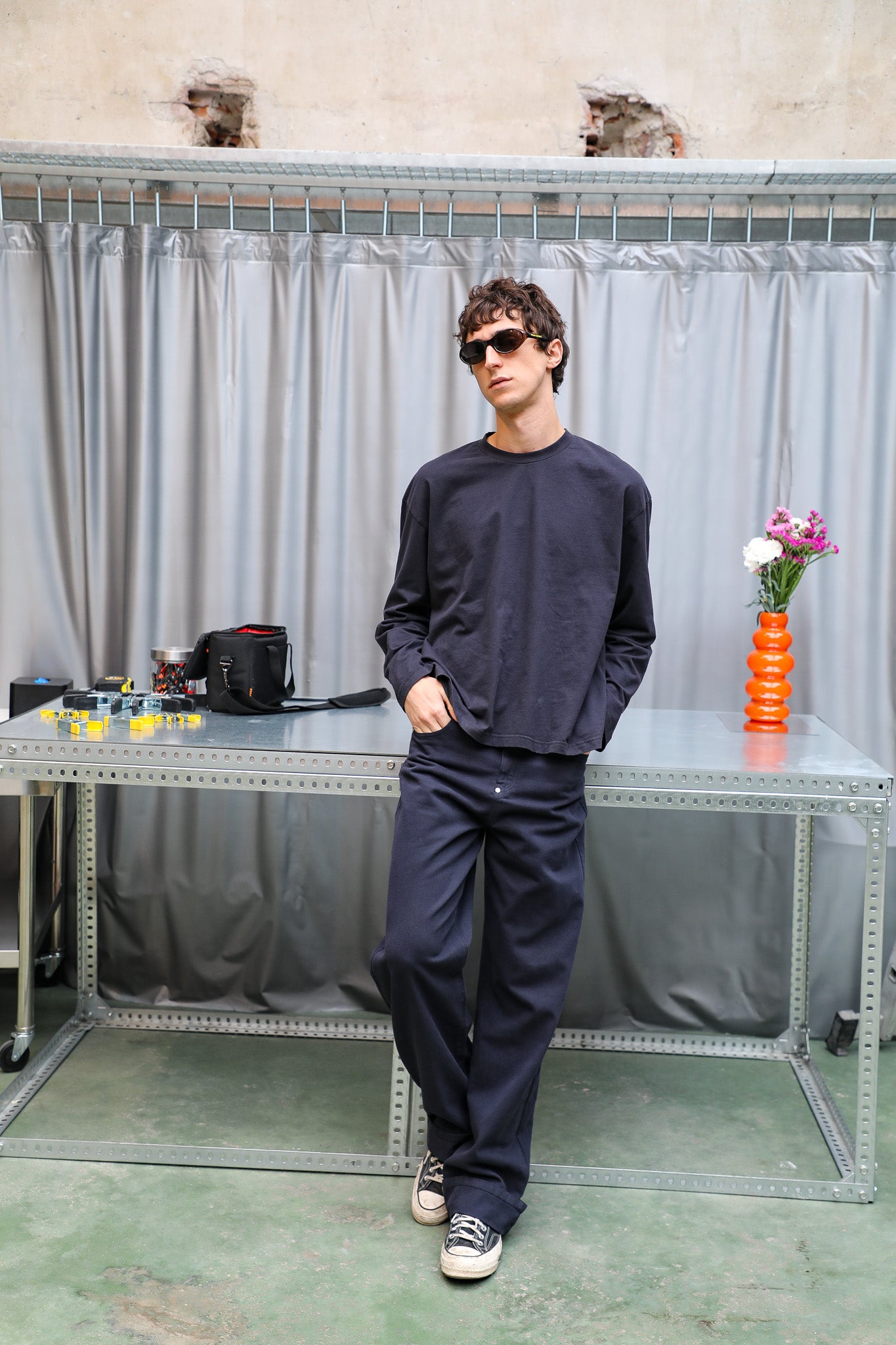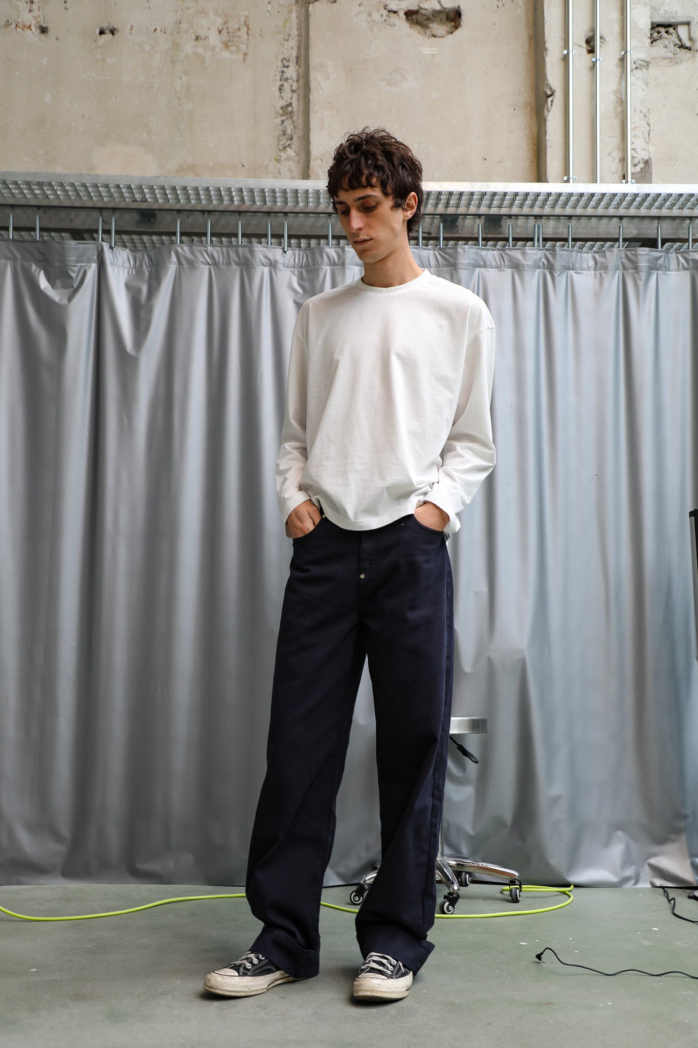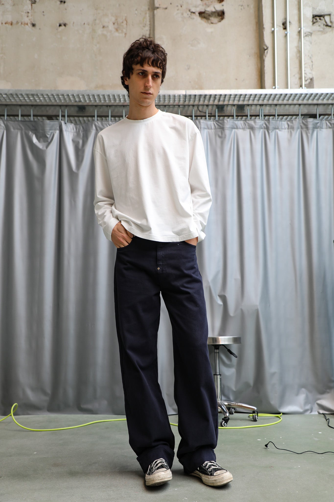 Dark navy straight-leg pants featuring decorative button details along the waistband and a buckle detail at the back.