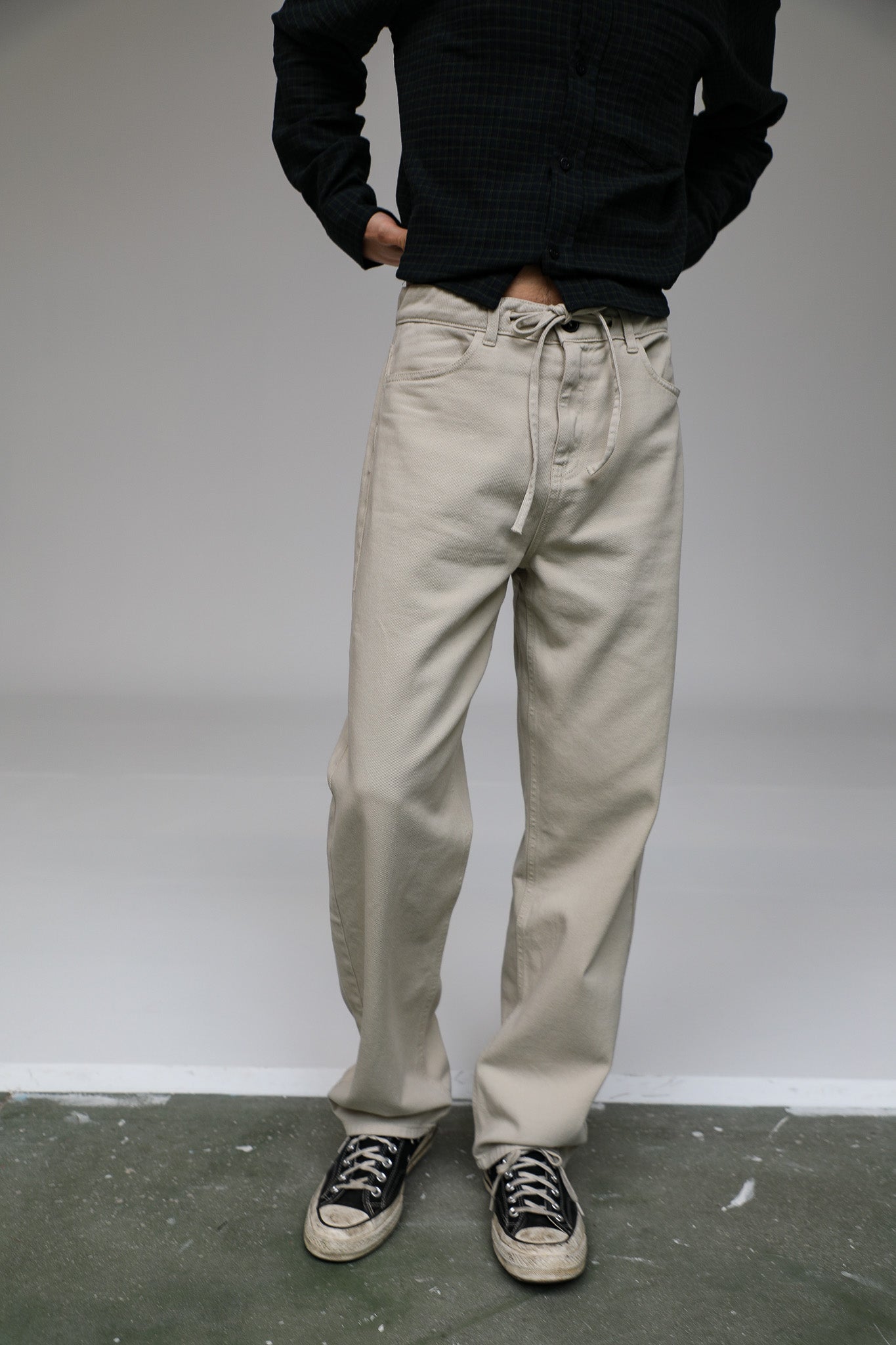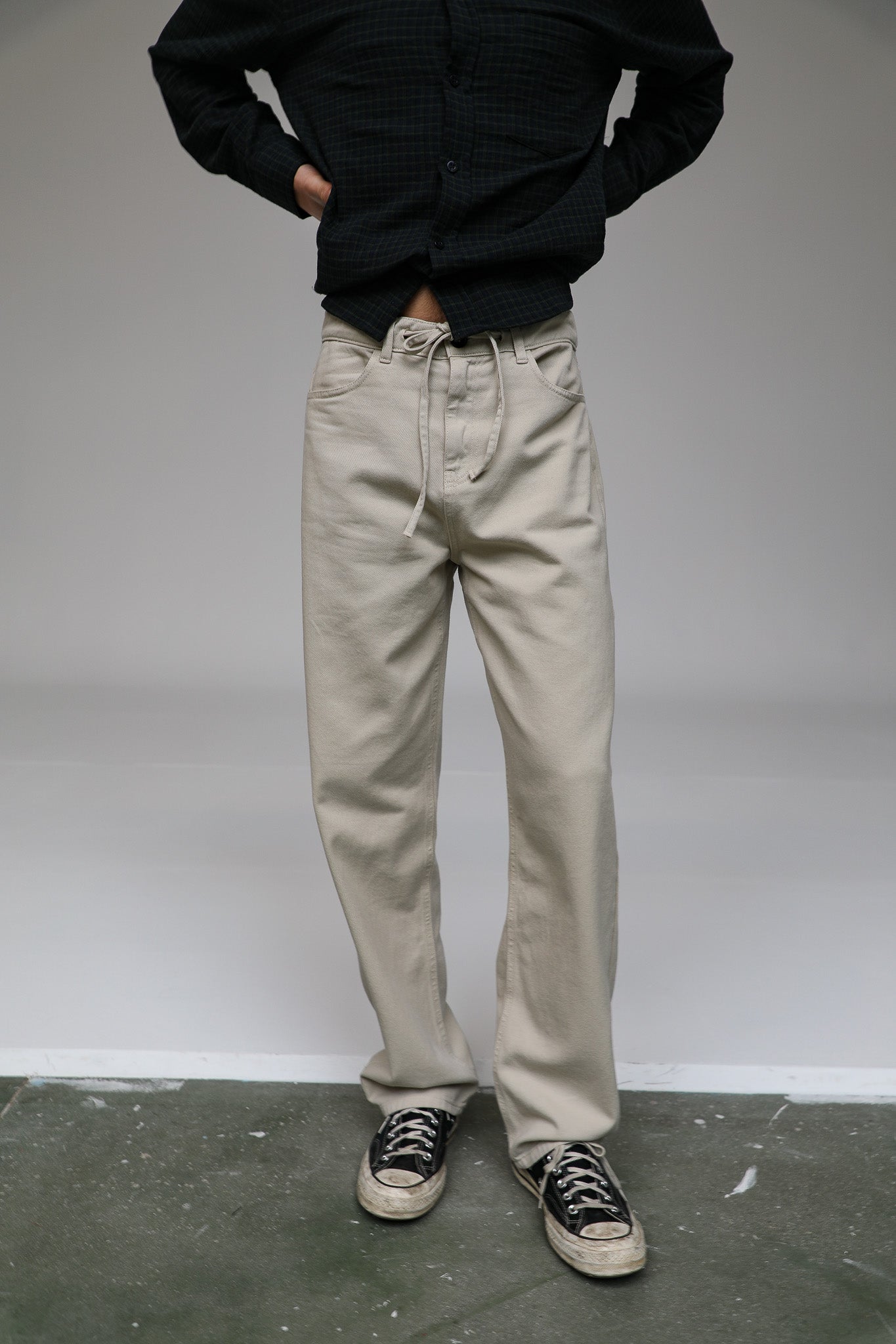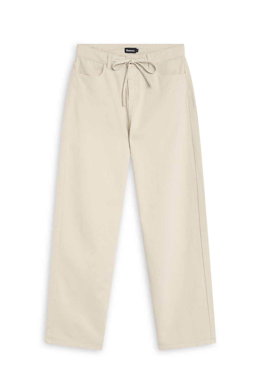 Beige straight-leg pants featuring a button-and-tie waist detail. This design includes two side pockets and two back pockets for a functional, tailored look.