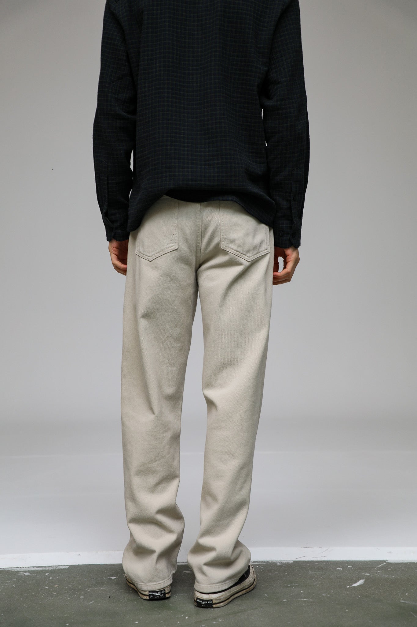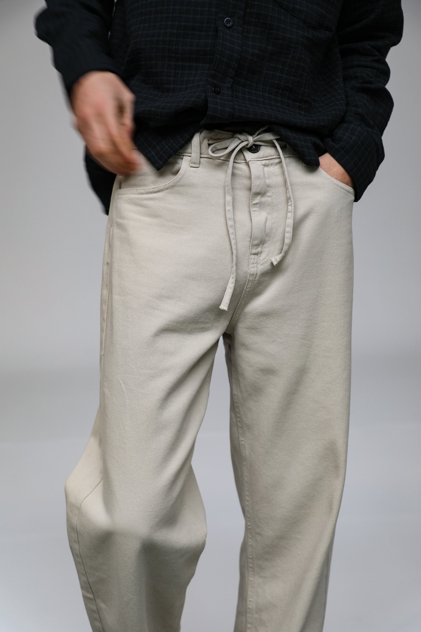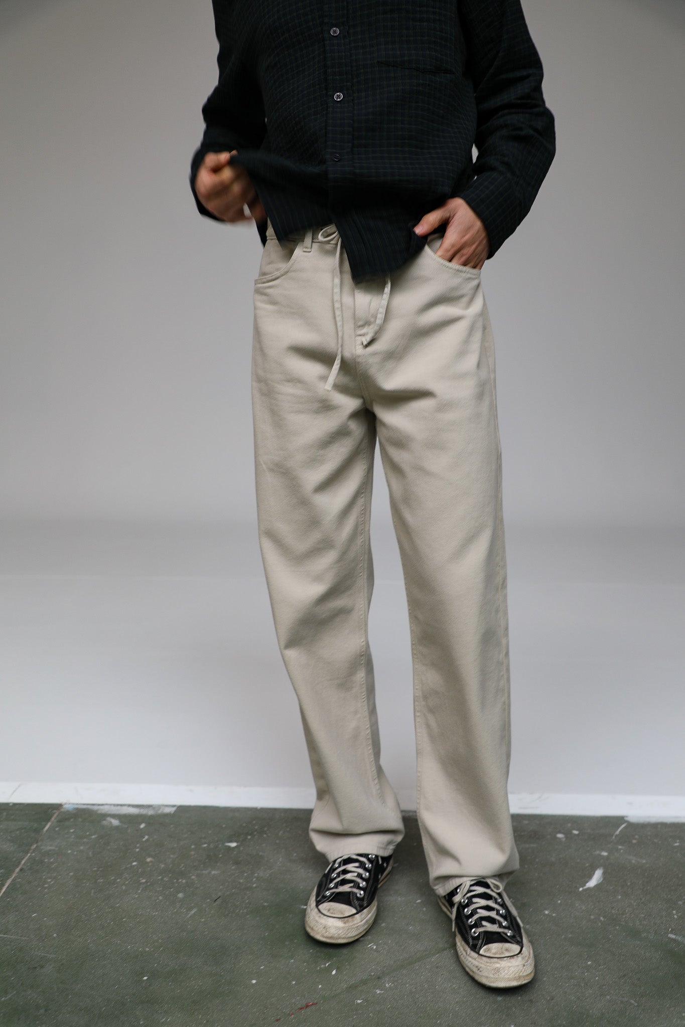 Beige straight-leg pants featuring a button-and-tie waist detail. This design includes two side pockets and two back pockets for a functional, tailored look.