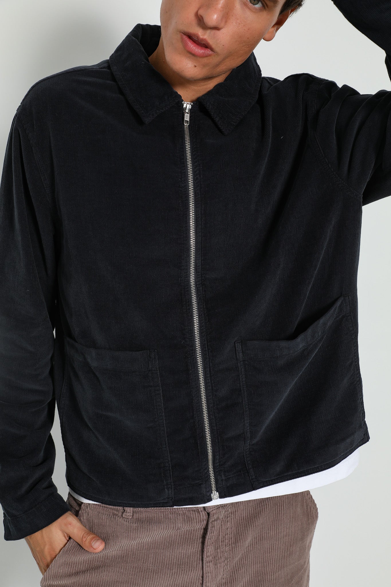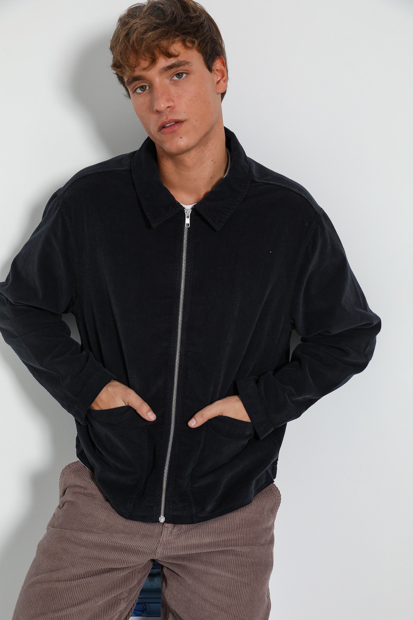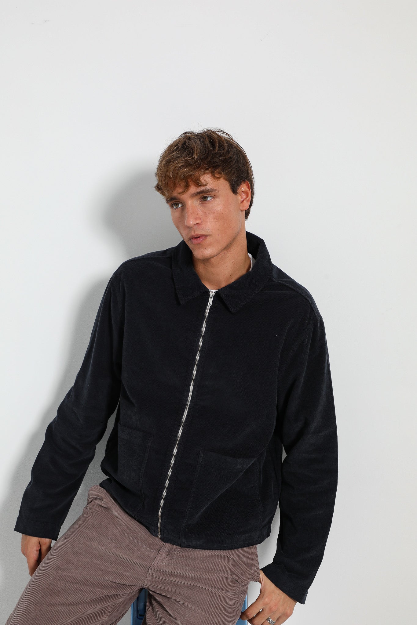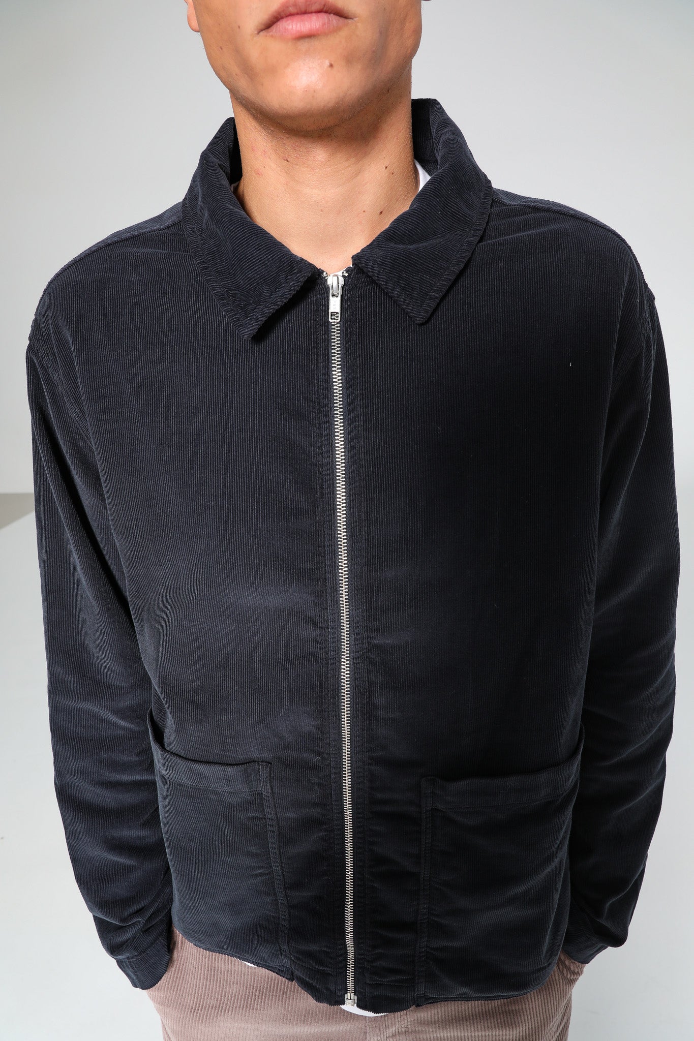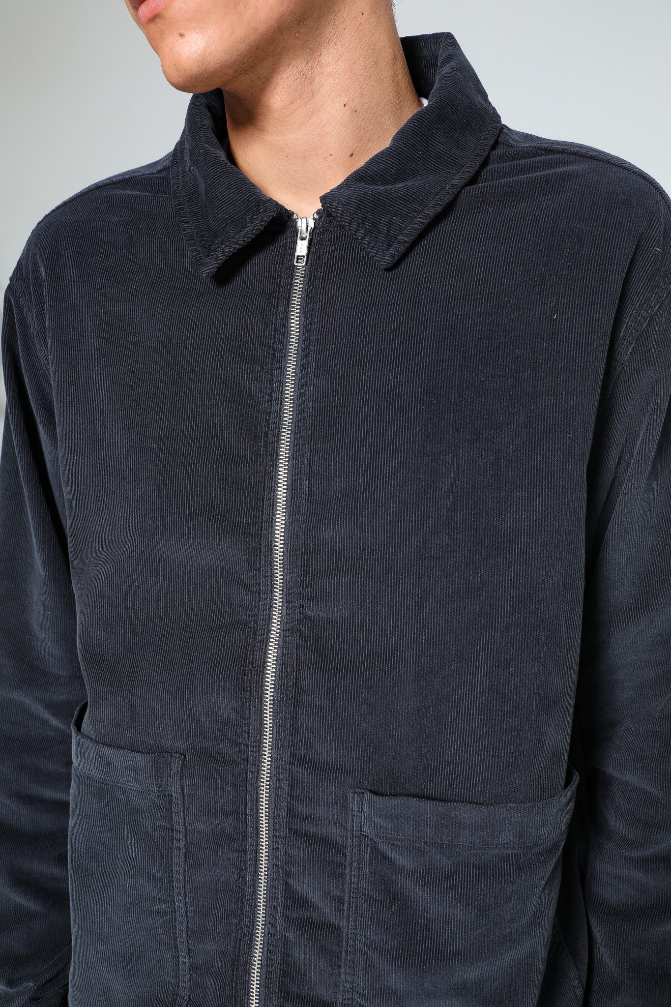 Corduroy flow jacket with zip in dark navy.