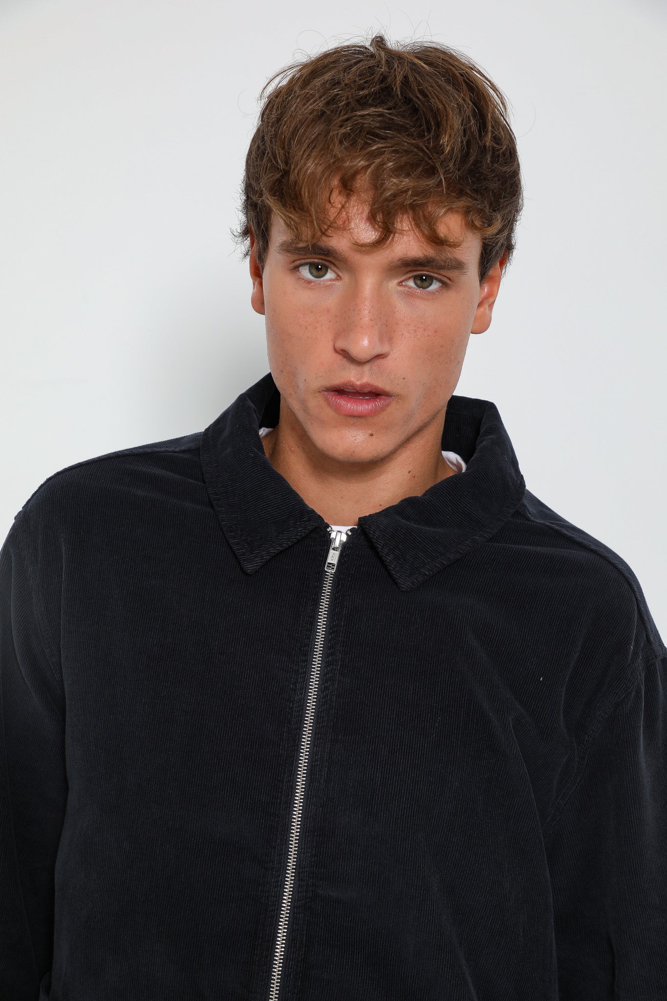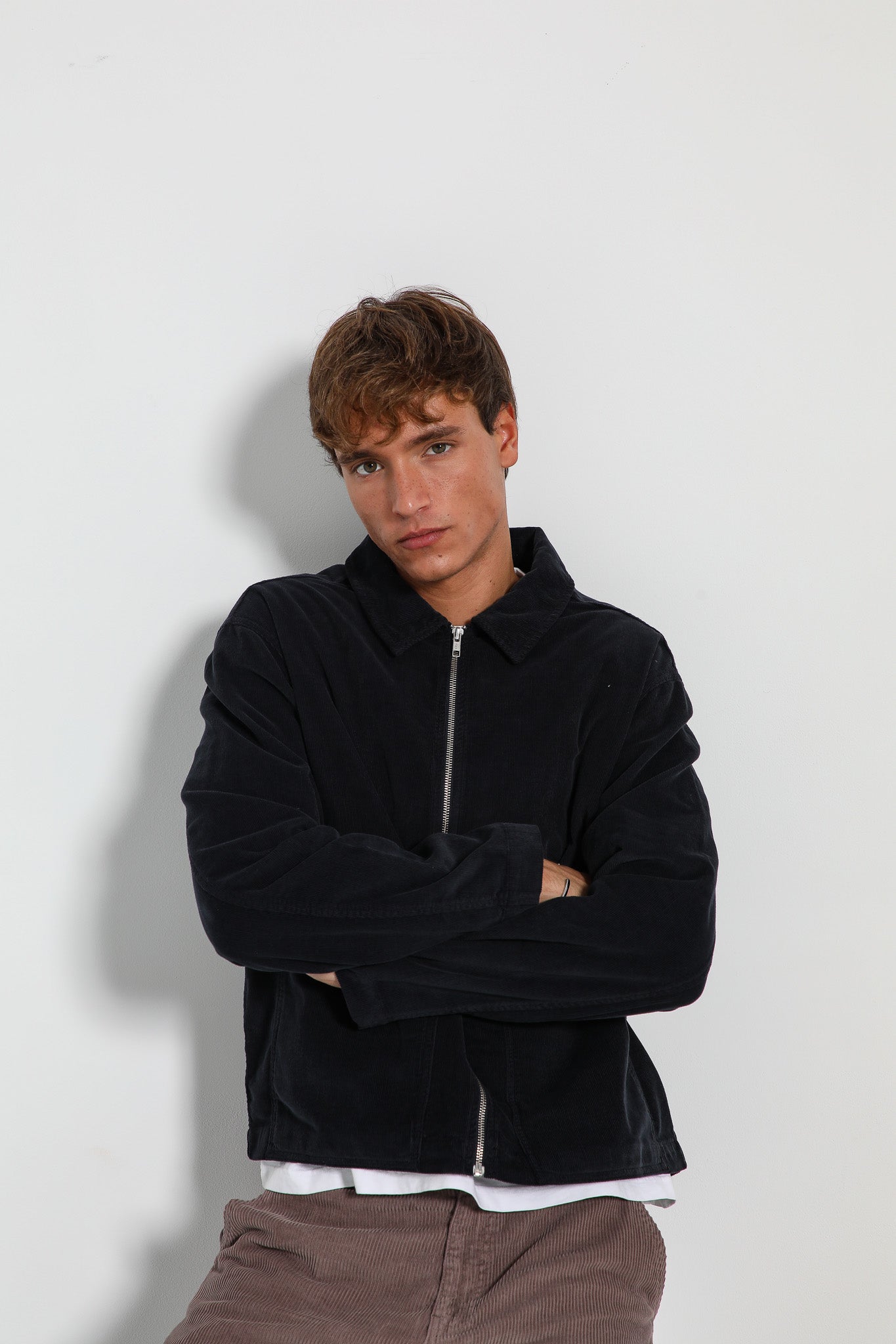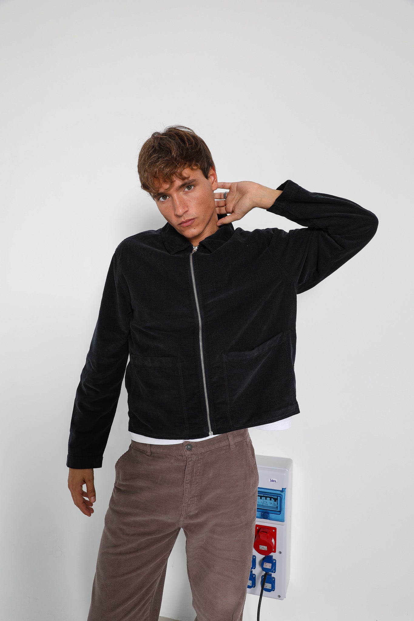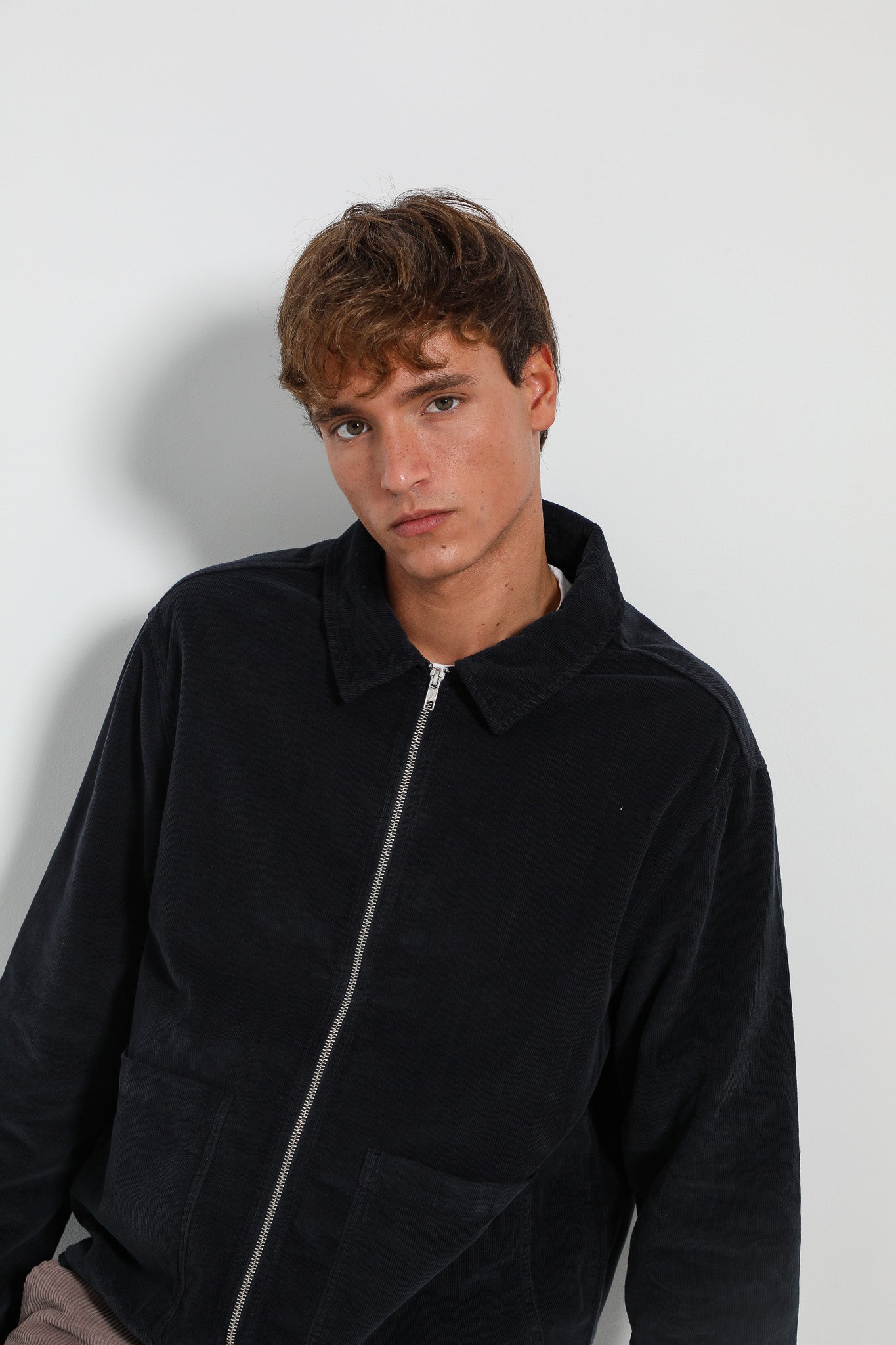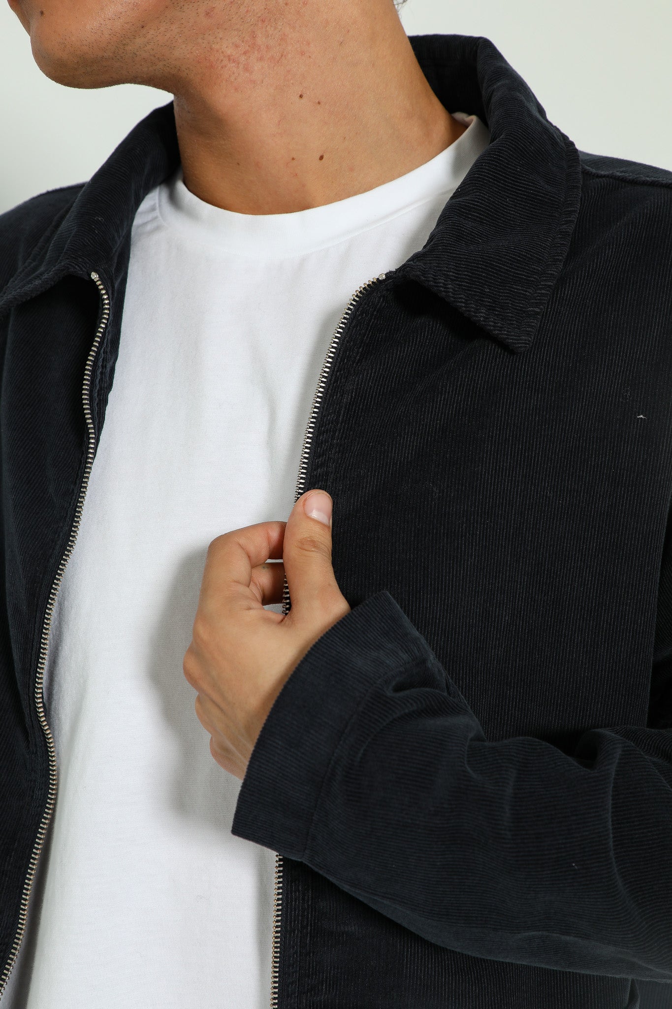 Corduroy flow jacket with zip in dark navy.