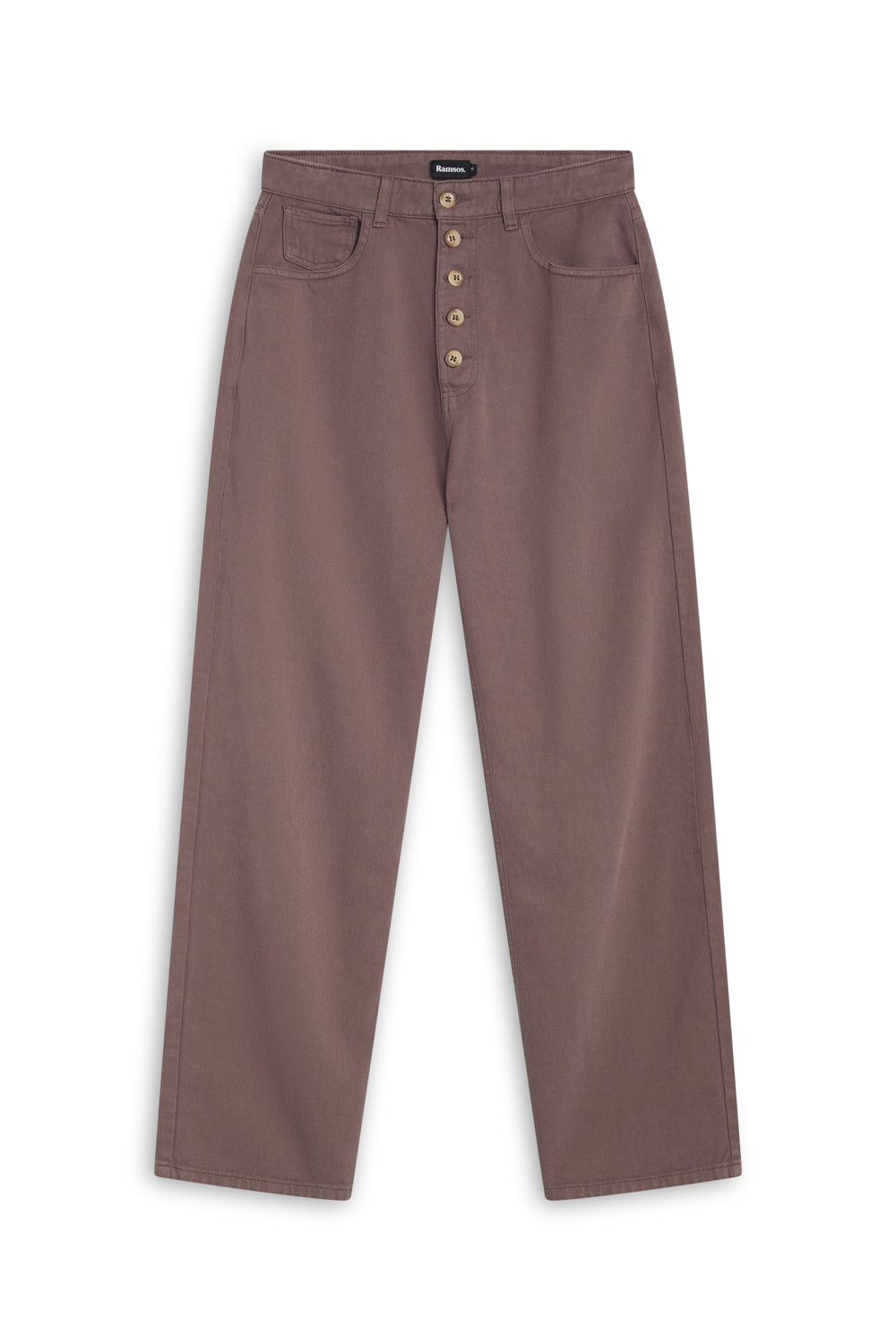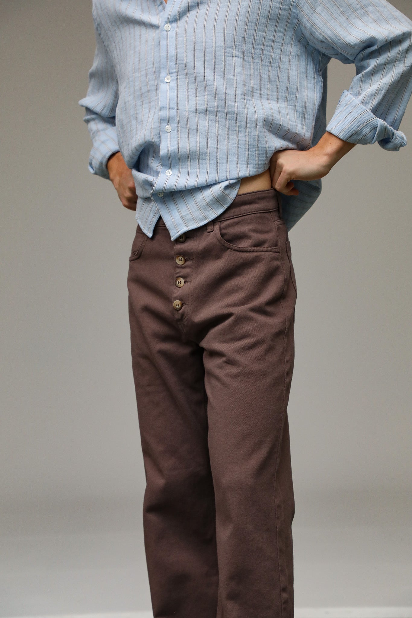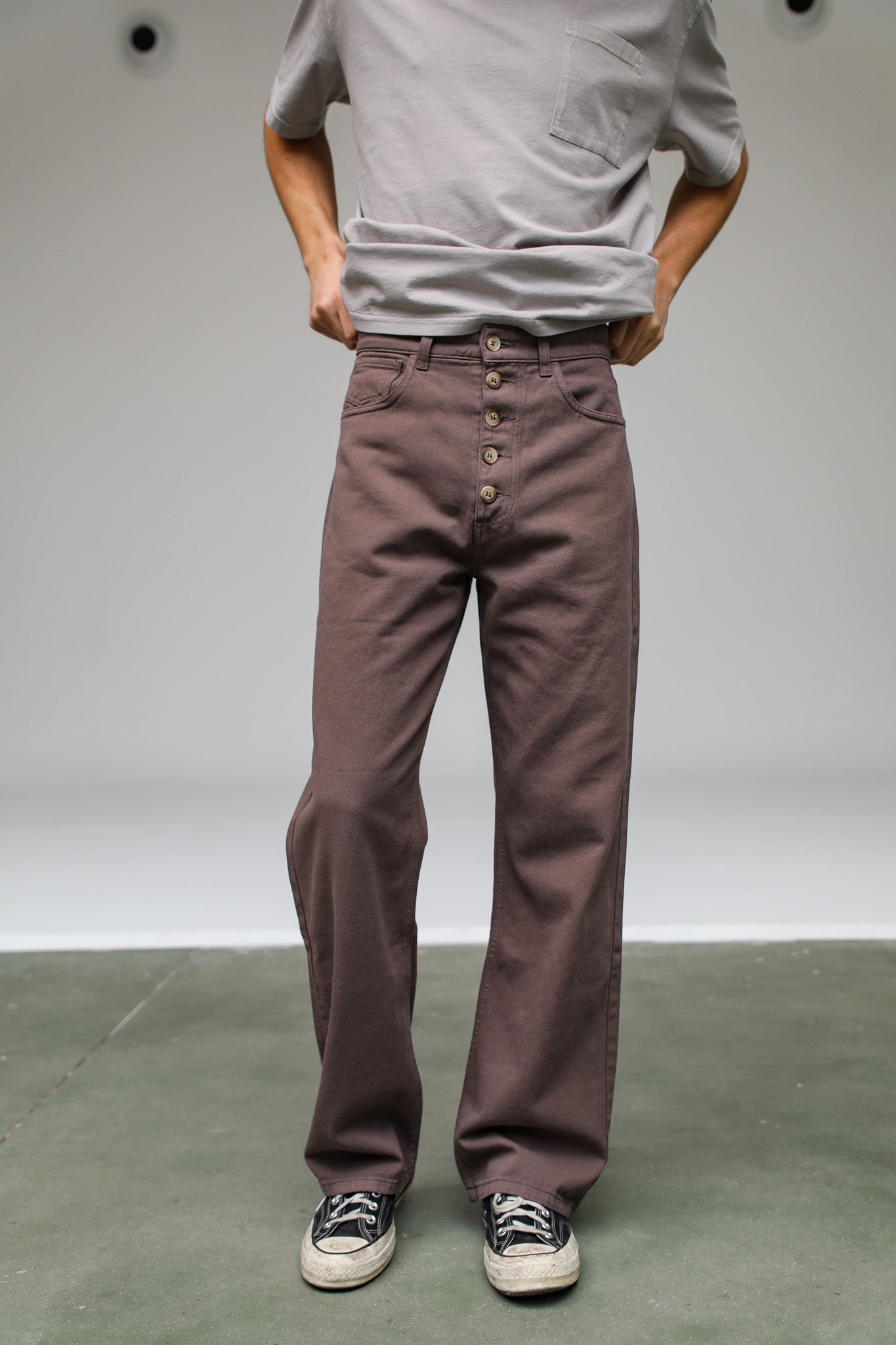 Wide-leg taupe pants featuring a relaxed fit and front buttons. These trousers offer a loose, flowing silhouette with a high-waisted, button-down detail.
