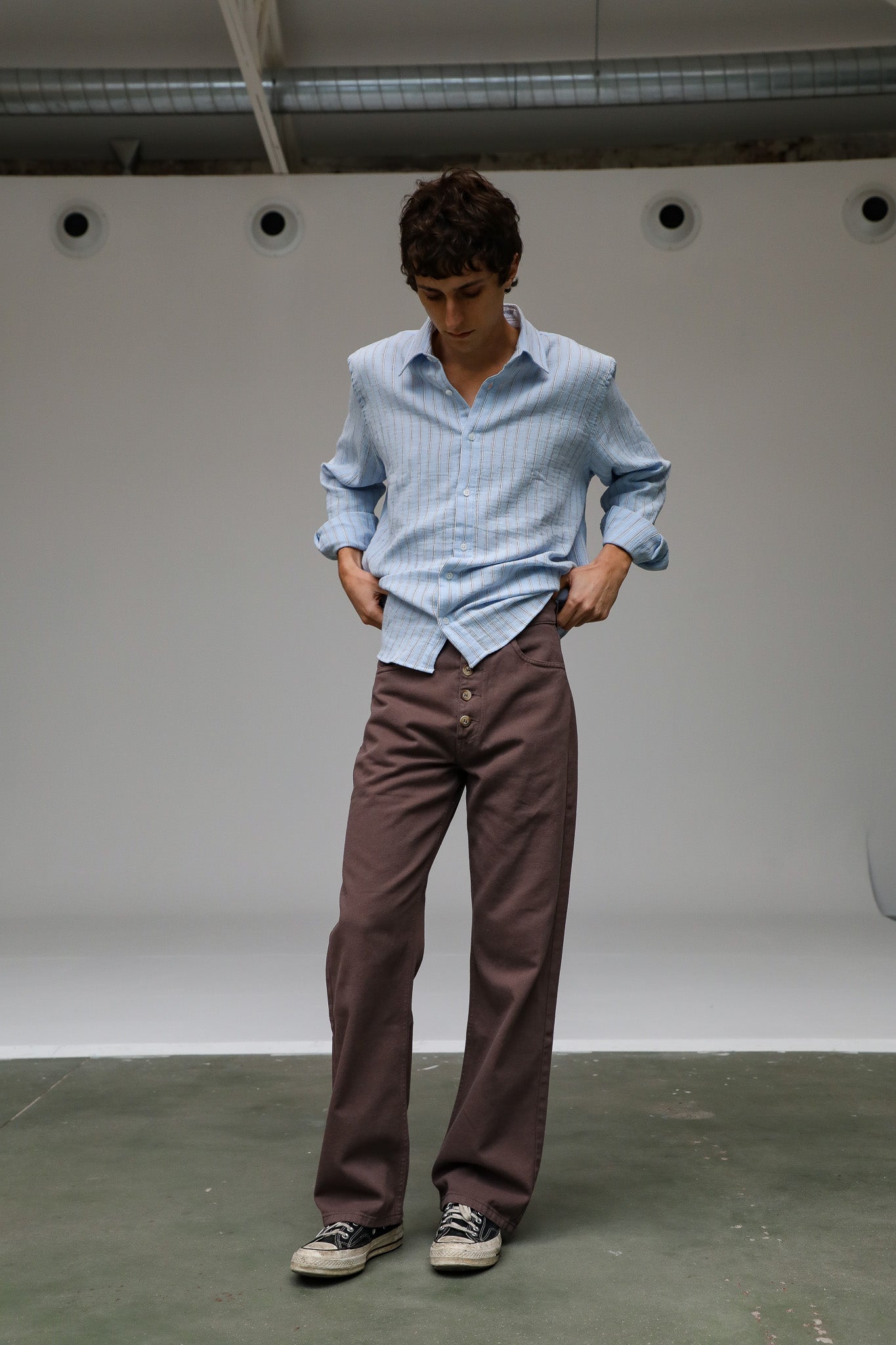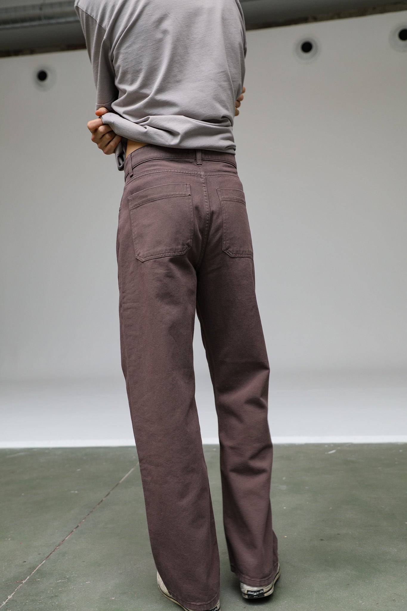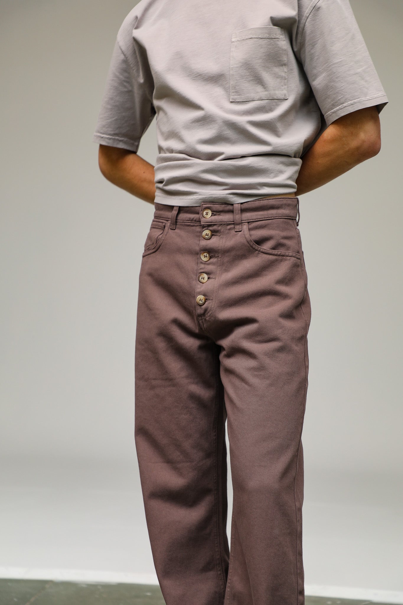 Wide-leg taupe pants featuring a relaxed fit and front buttons. These trousers offer a loose, flowing silhouette with a high-waisted, button-down detail.
