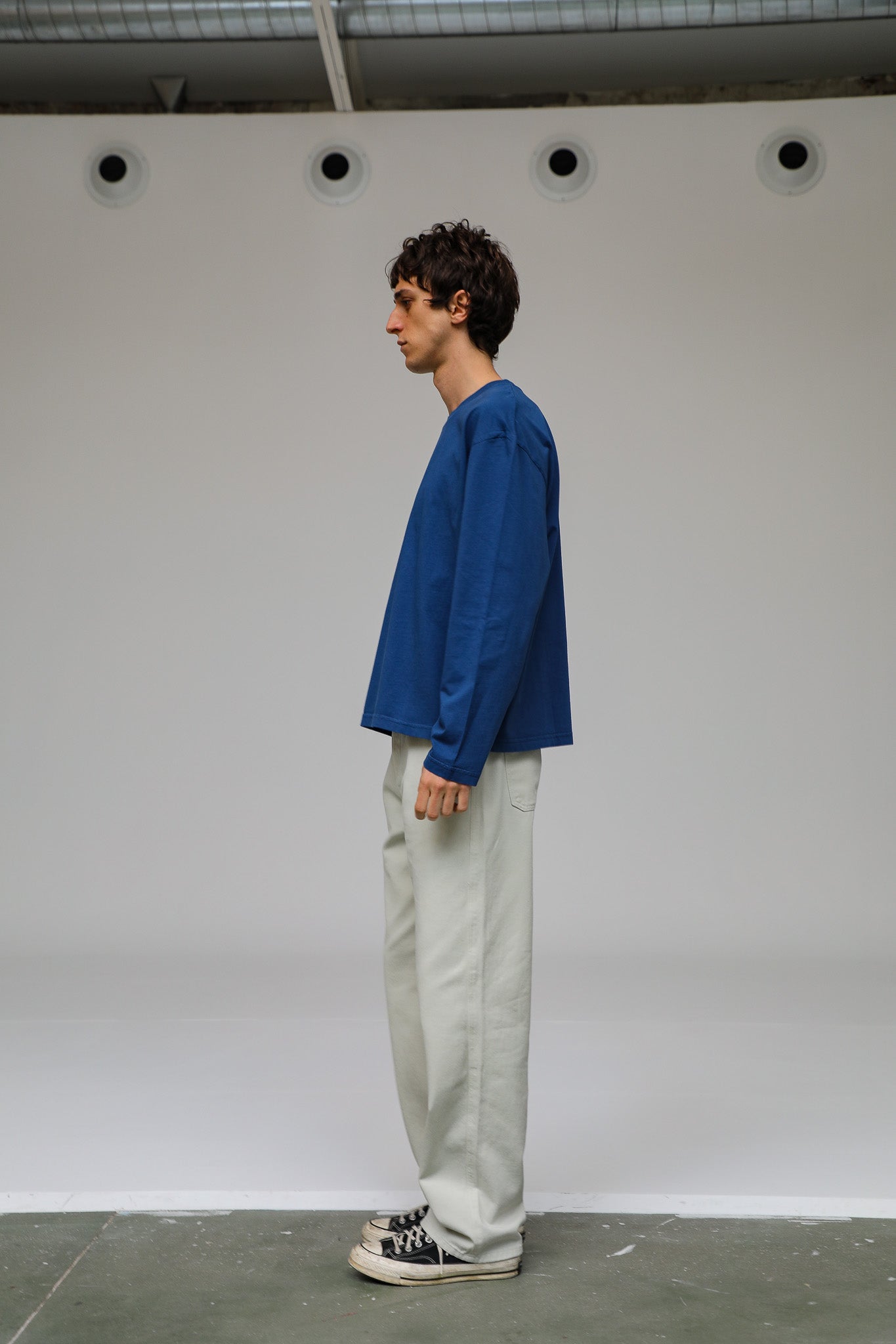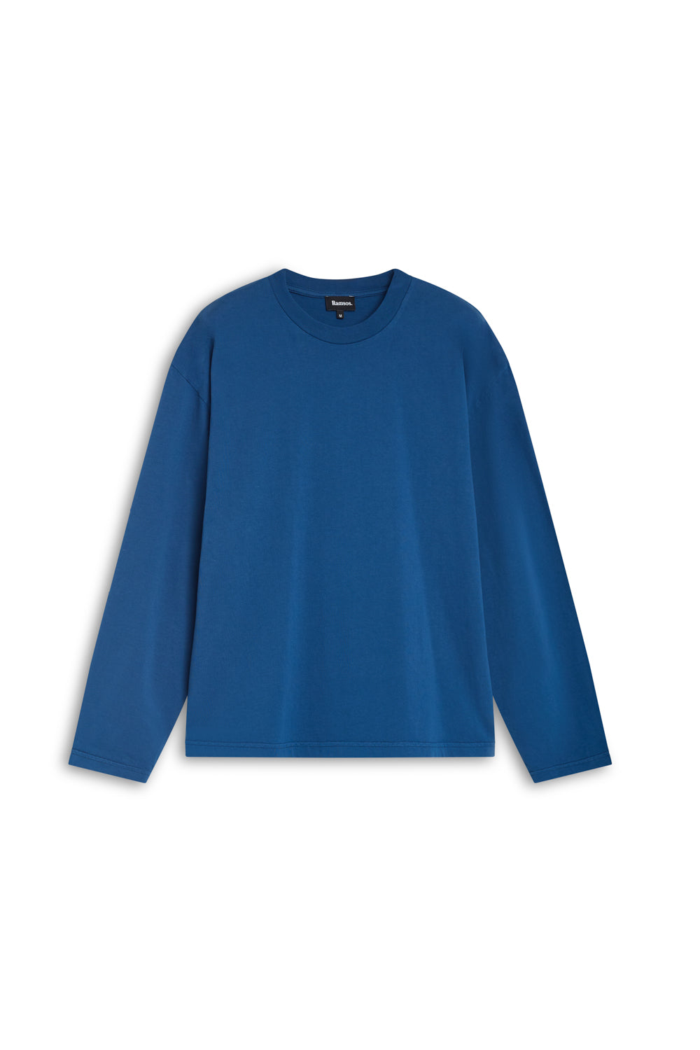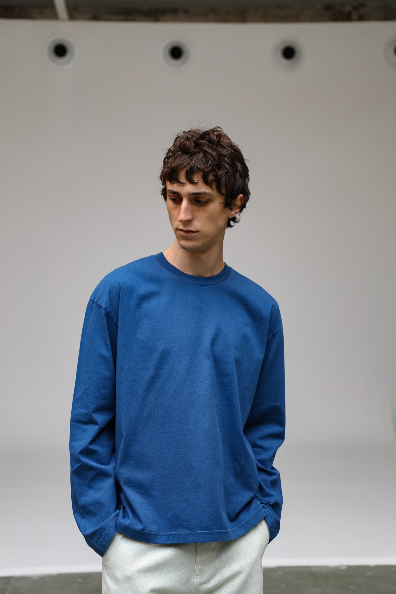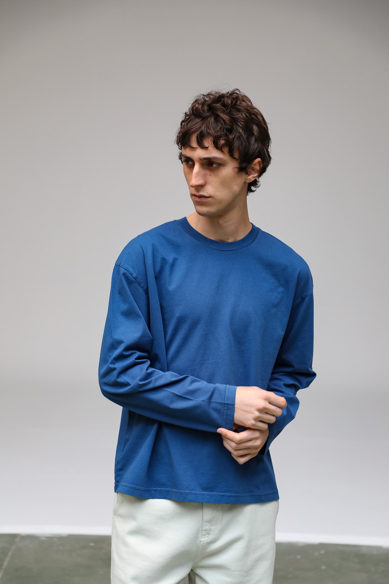 Men’s wide-fit blue T-shirt in organic cotton, designed with long sleeves, a chest pocket, a cropped length.