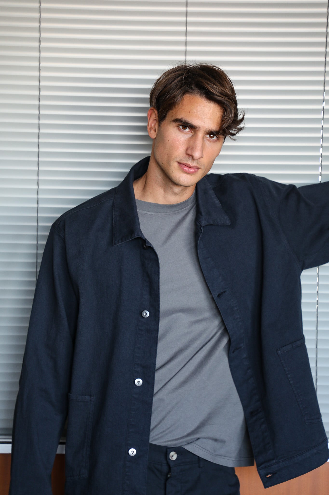 Navy button-down jacket featuring a classic design with a tailored fit. Made from 100% cotton, this jacket offers both comfort and style. The model is 1.89 m tall and wears size L.