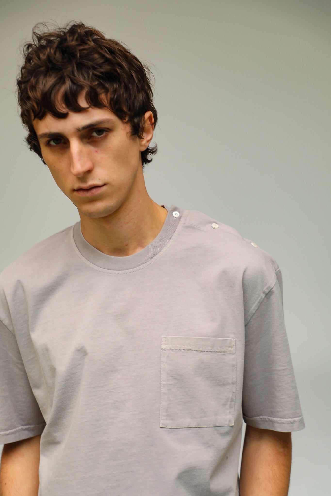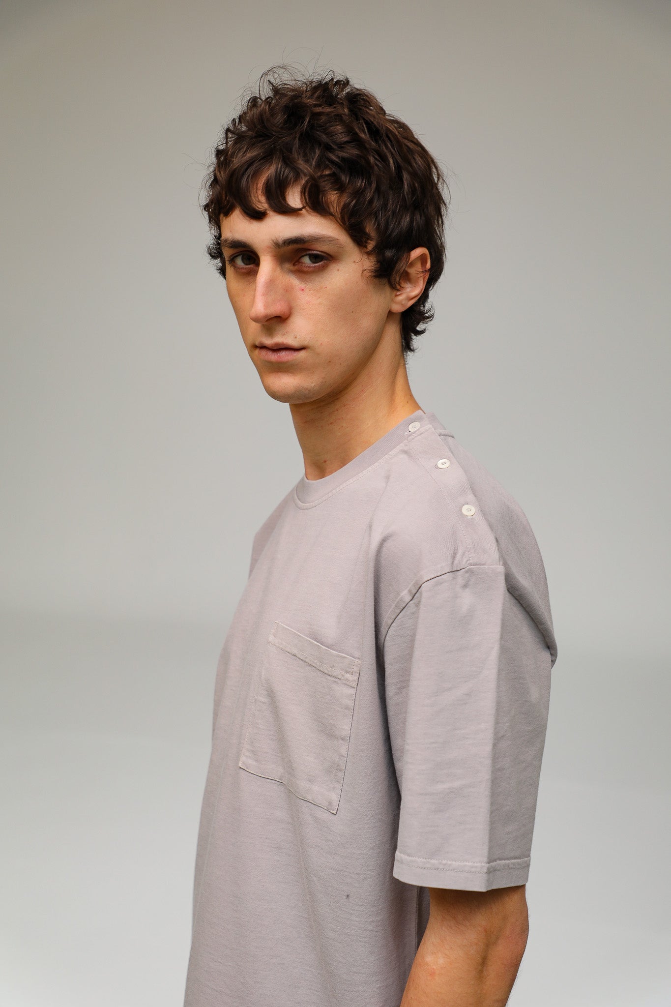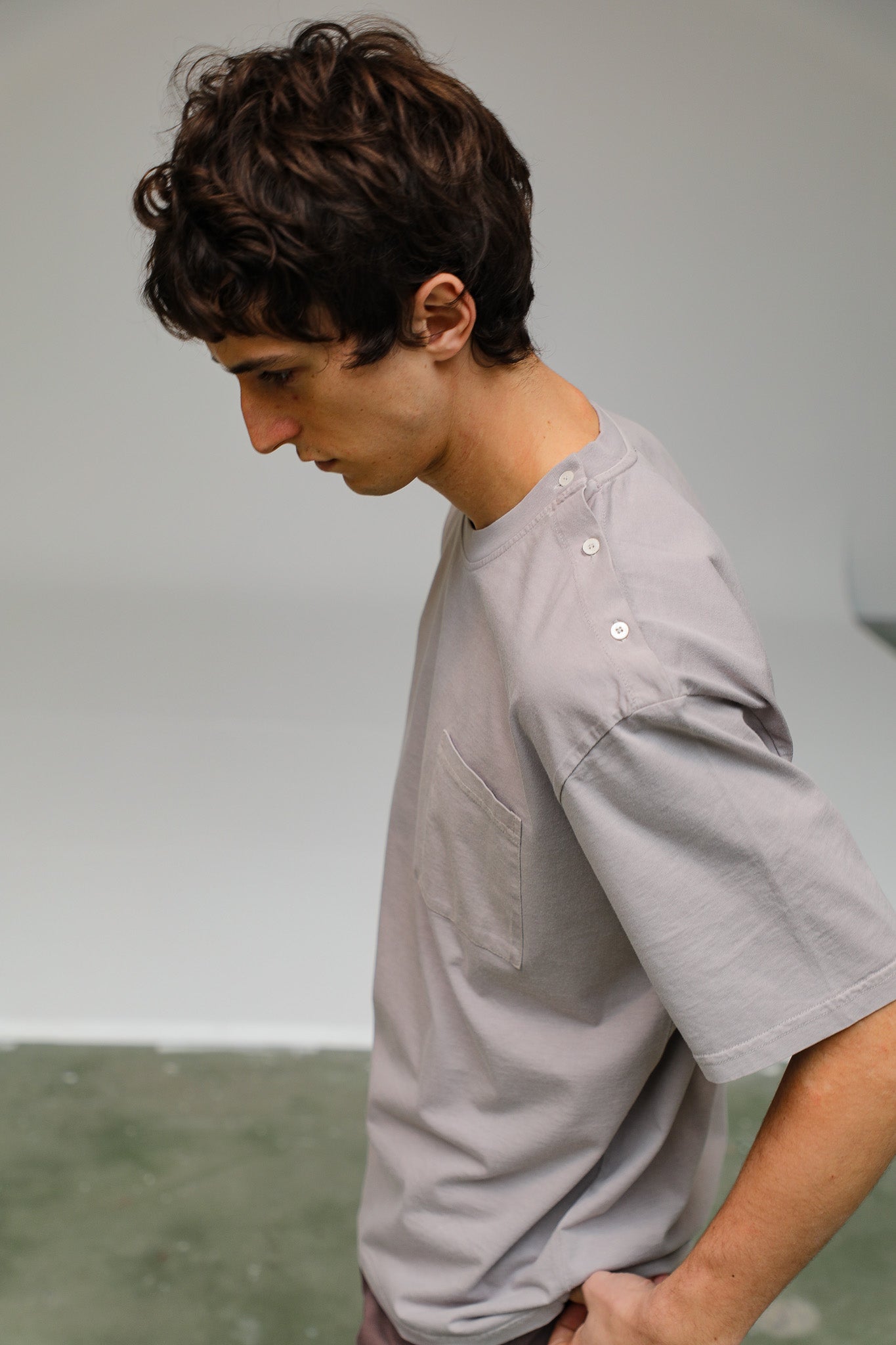 Light grey cotton tee featuring short sleeves and button details at the shoulder.