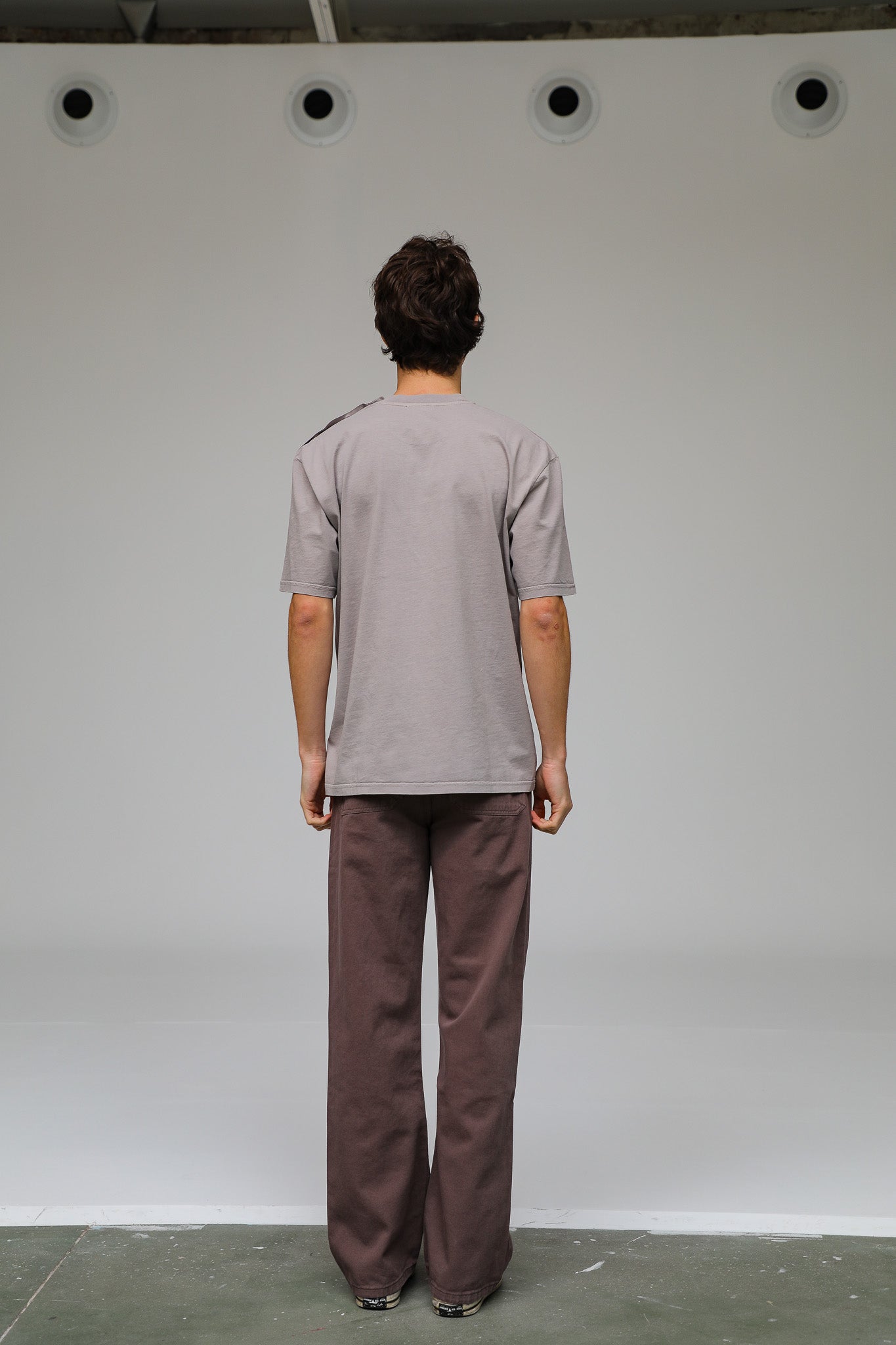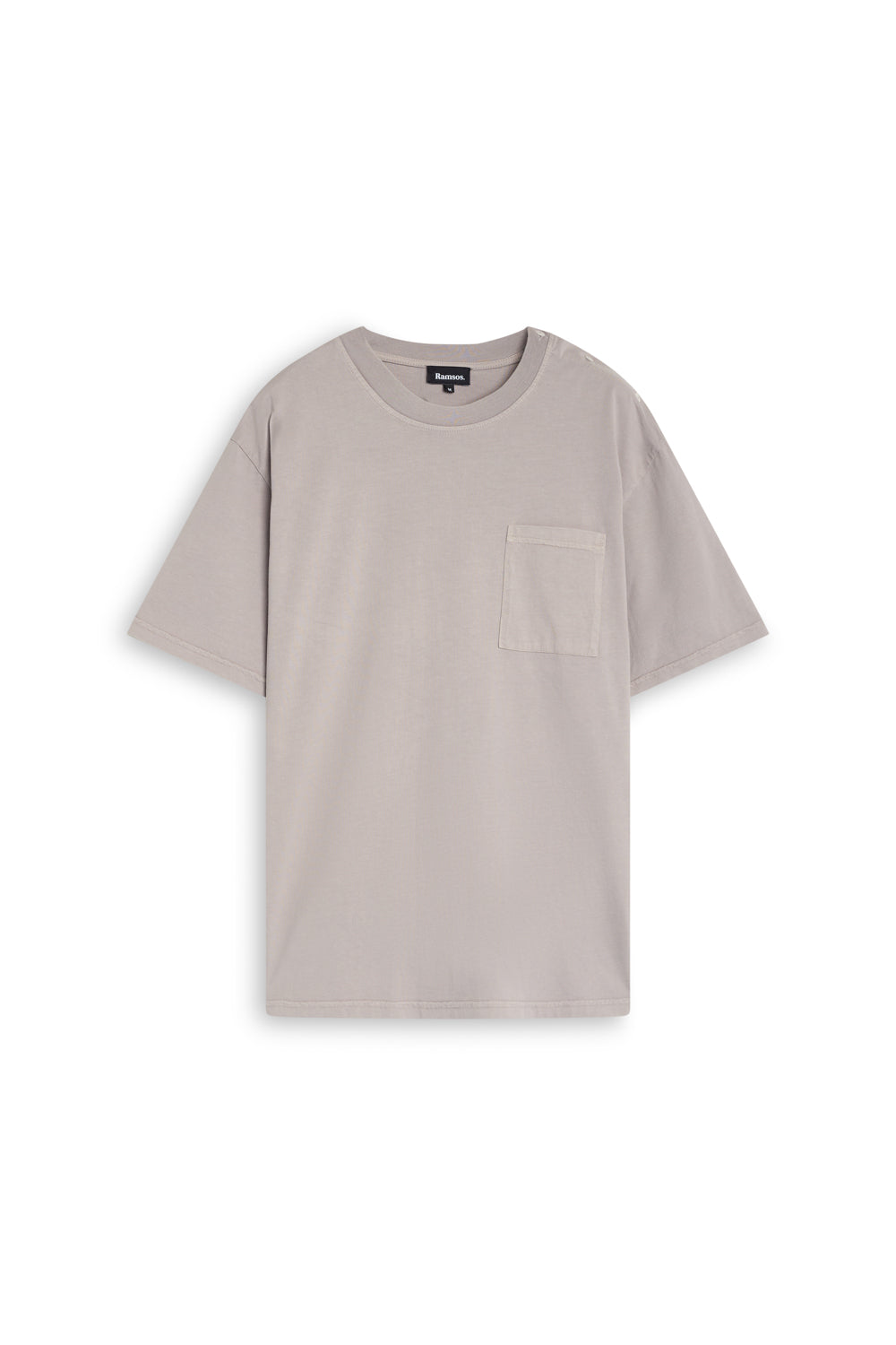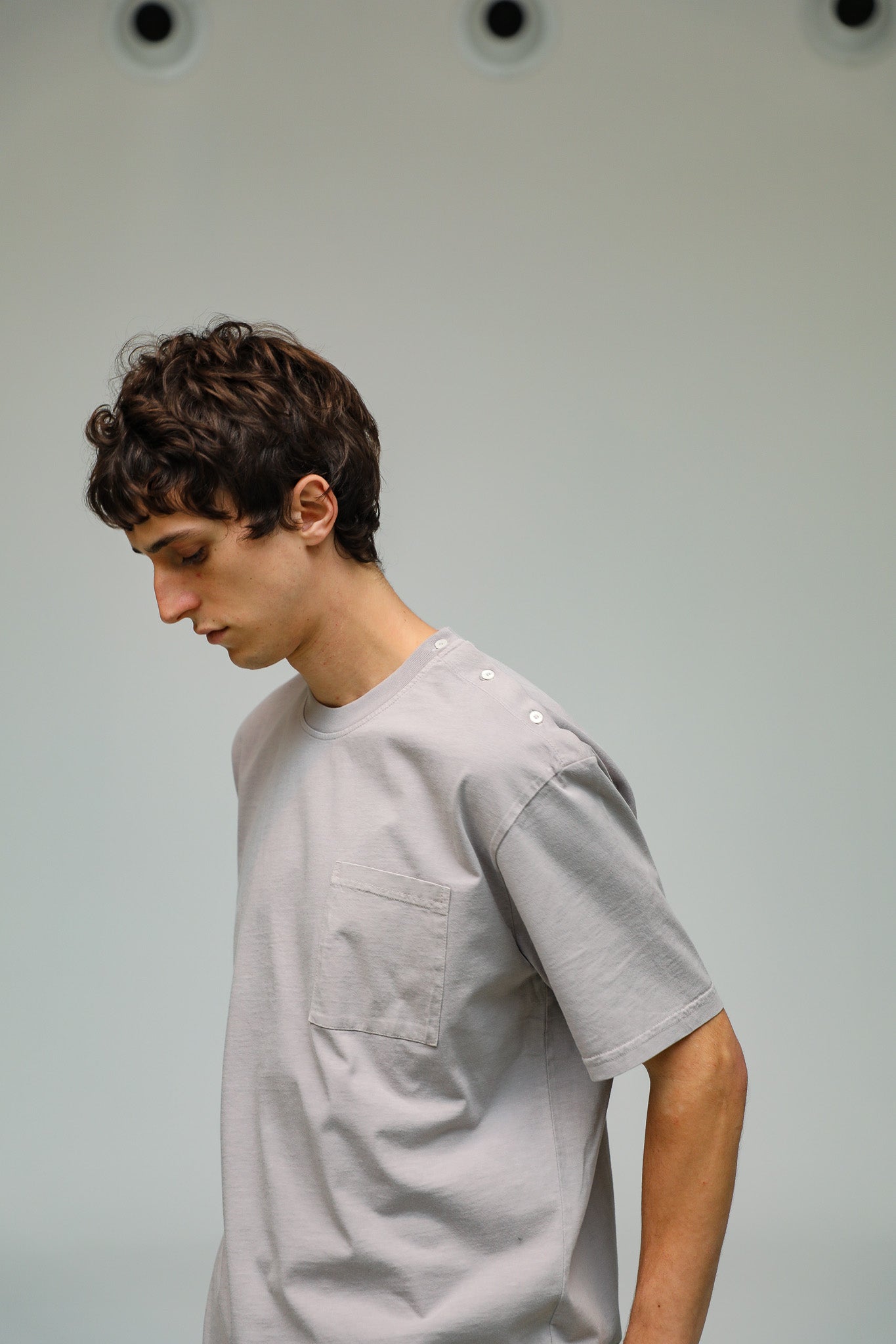 Light grey cotton tee featuring short sleeves and button details at the shoulder.