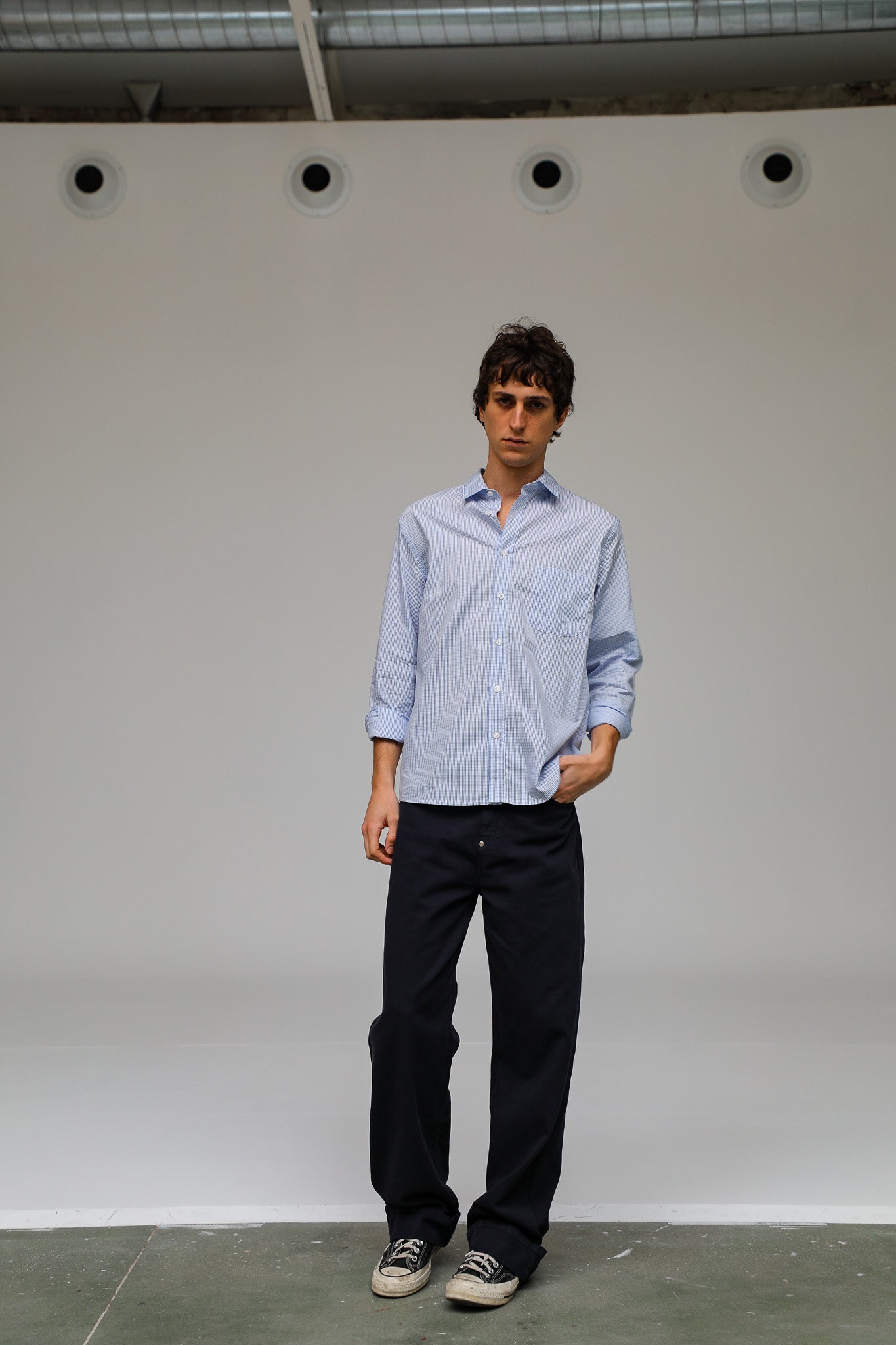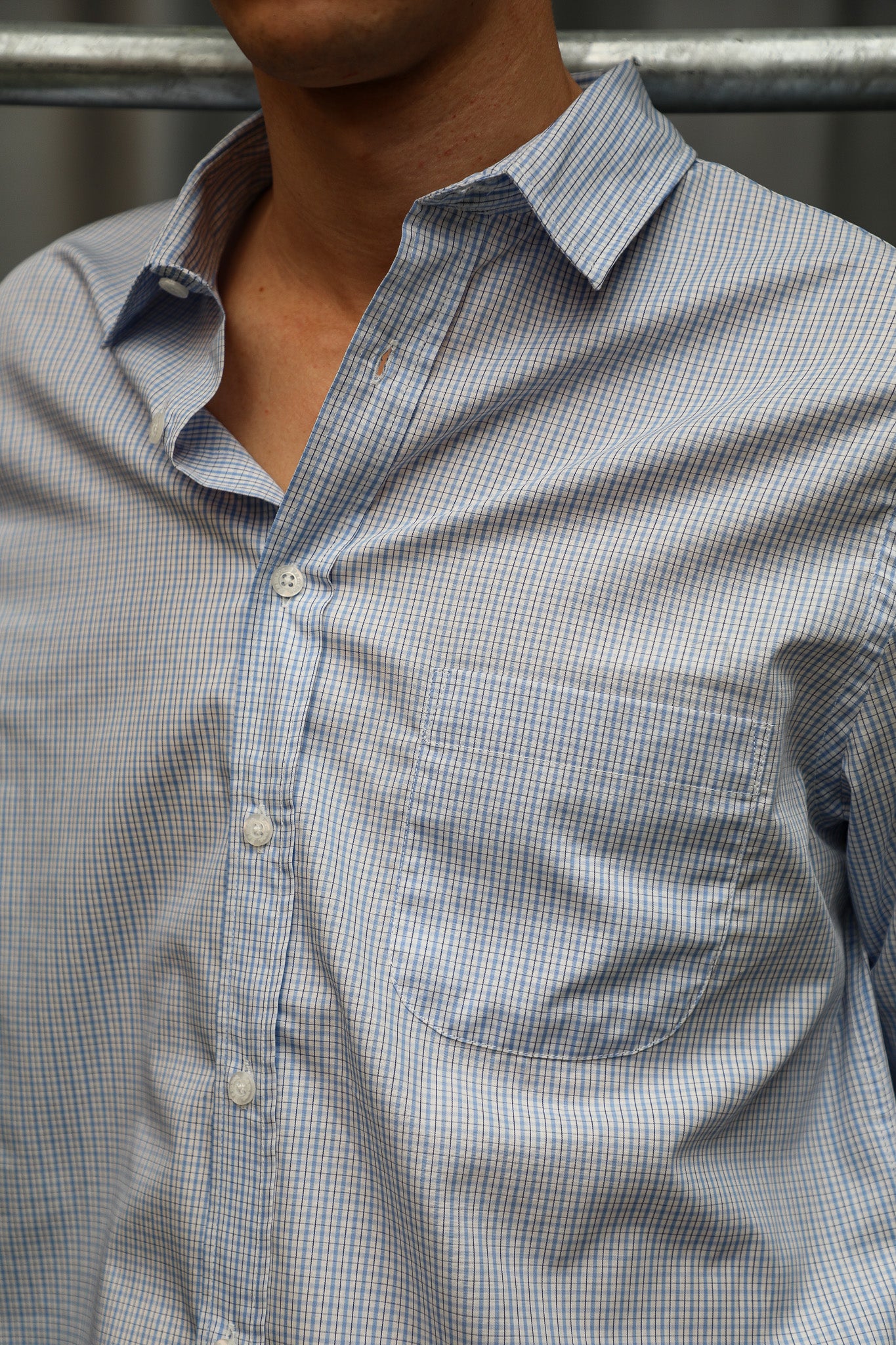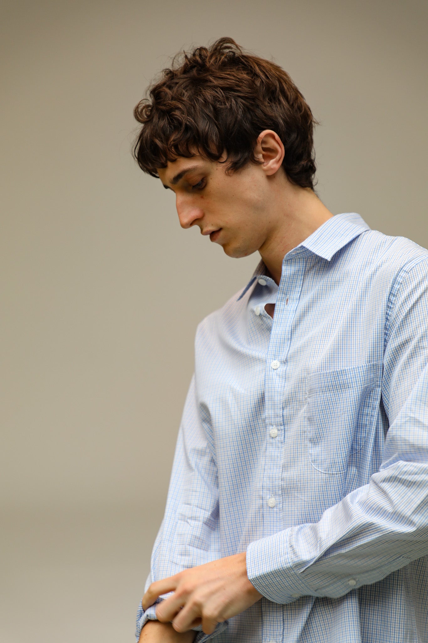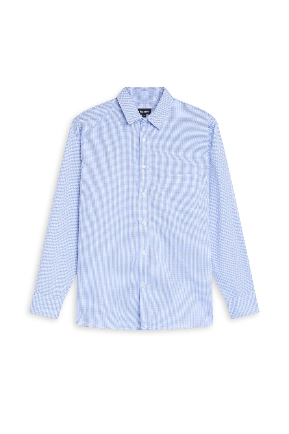 A regular-fit white shirt featuring a blue square pattern. It has a standard button-down front and a classic, straight silhouette