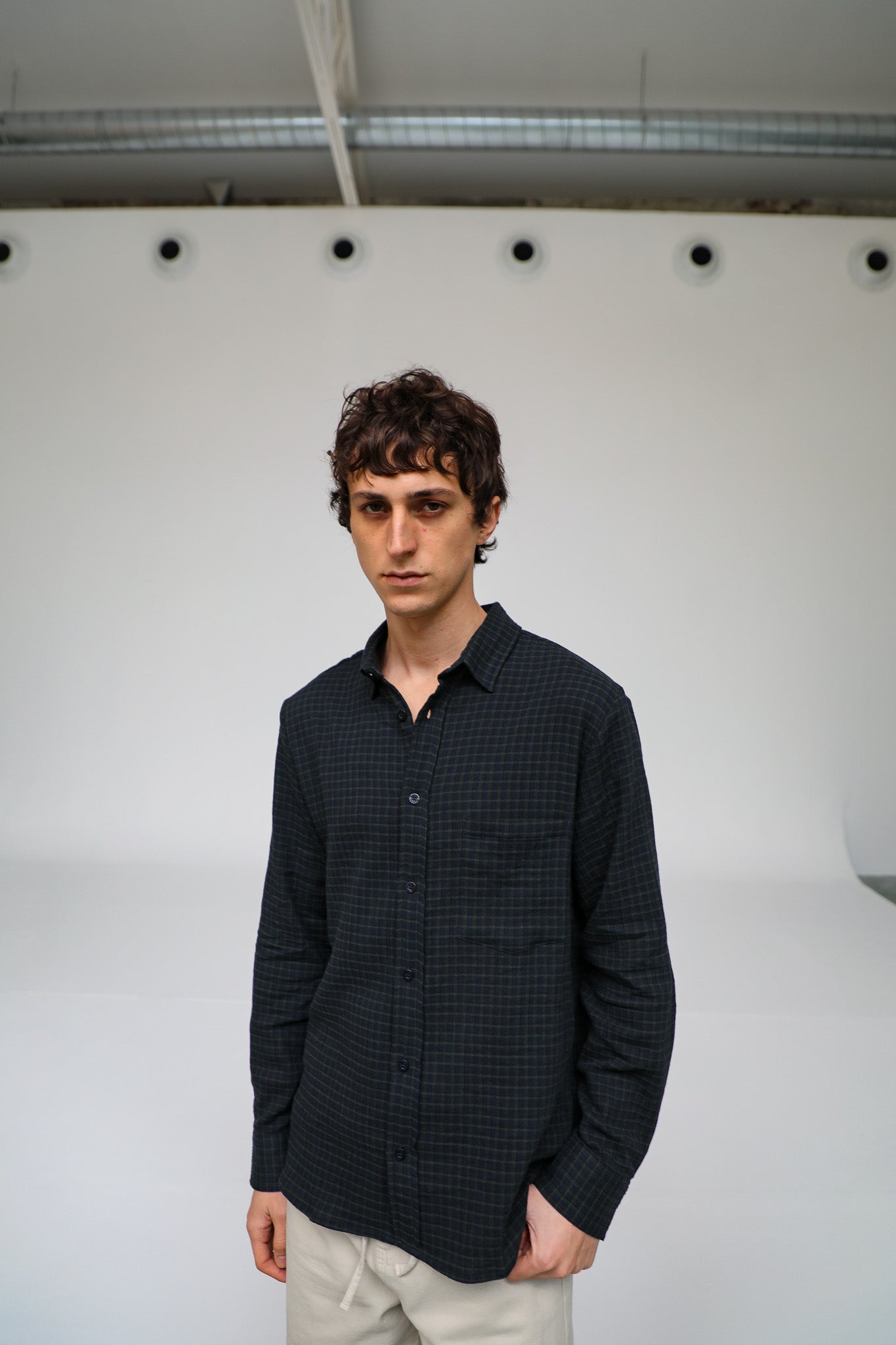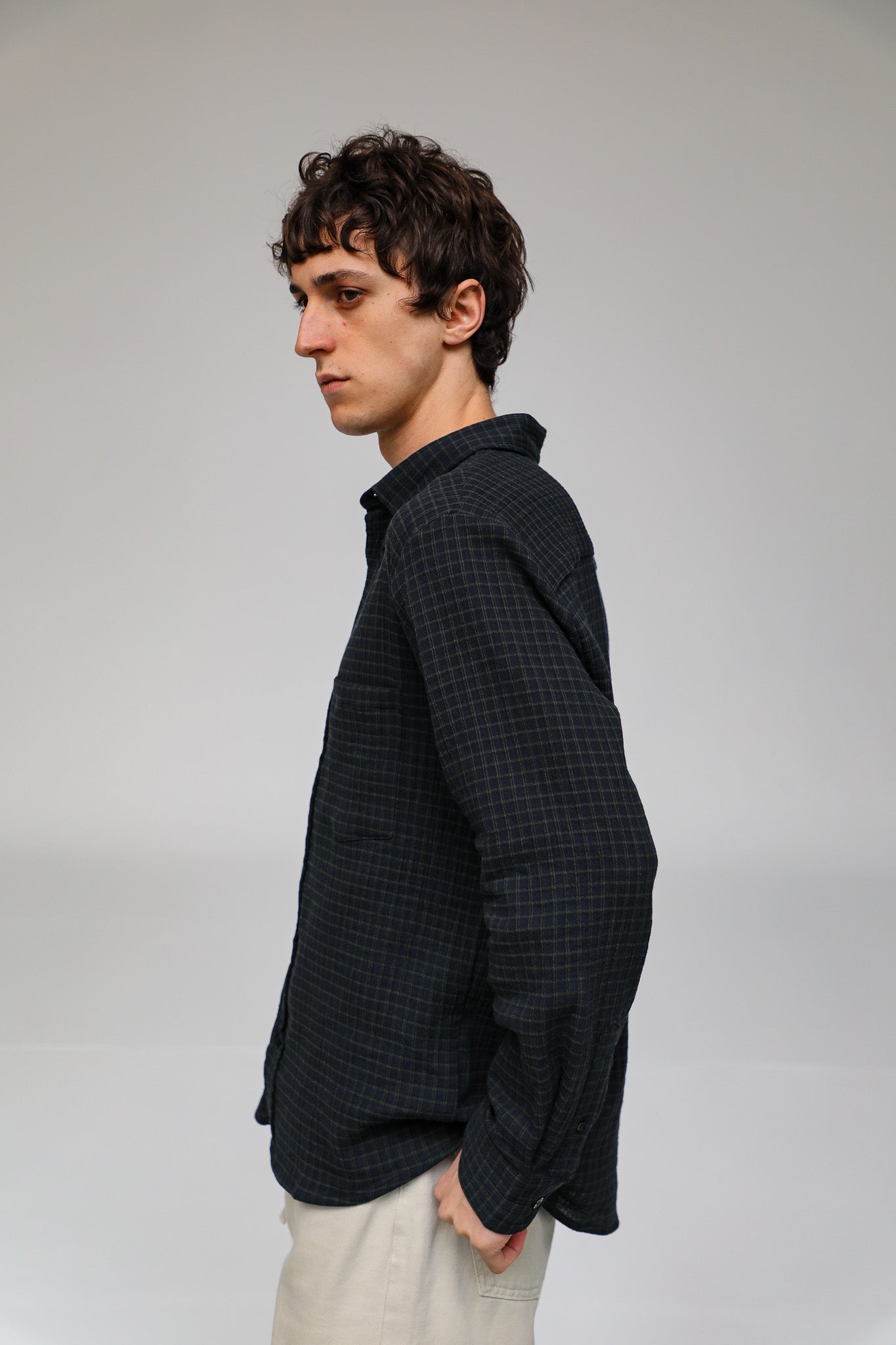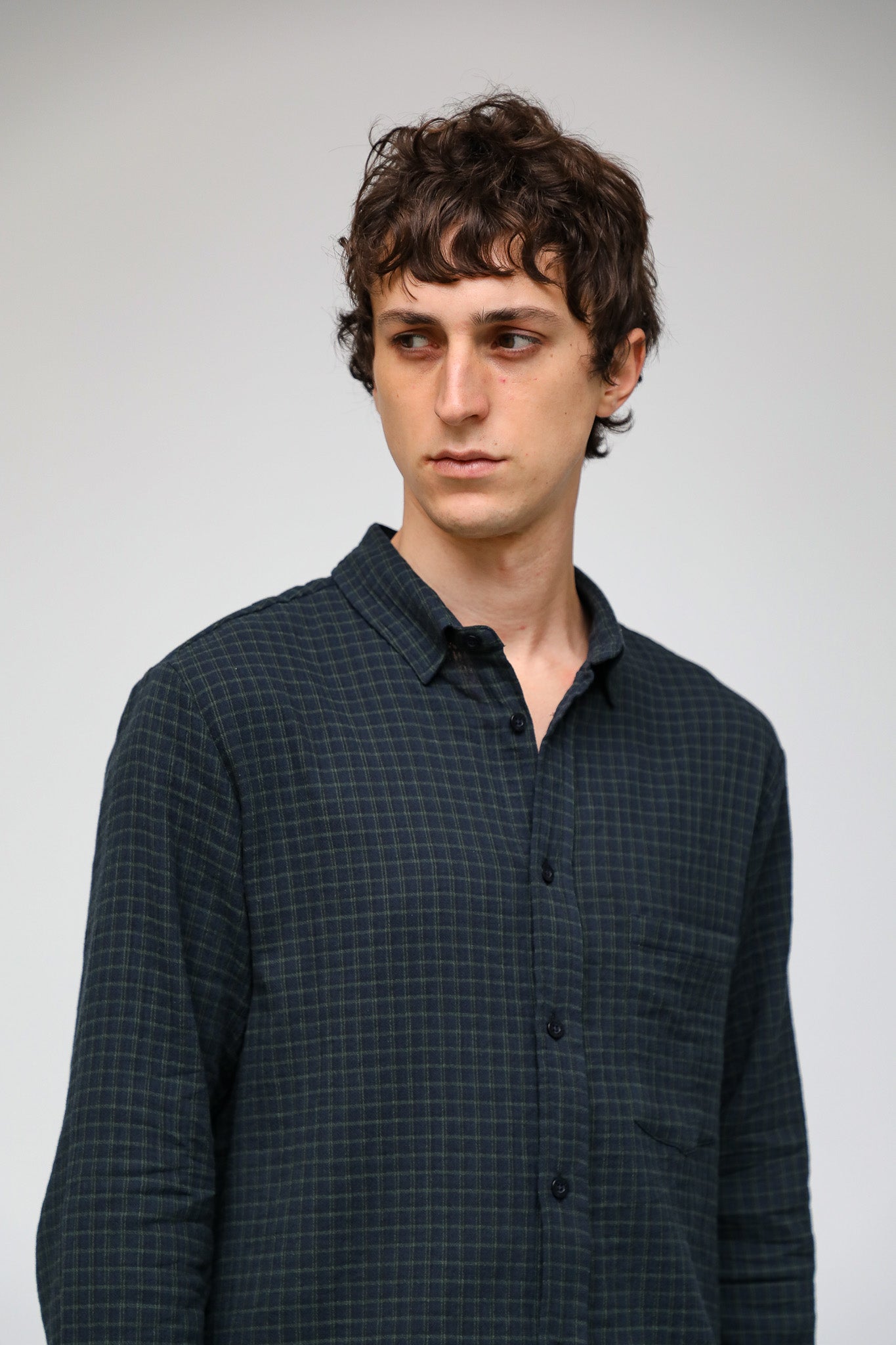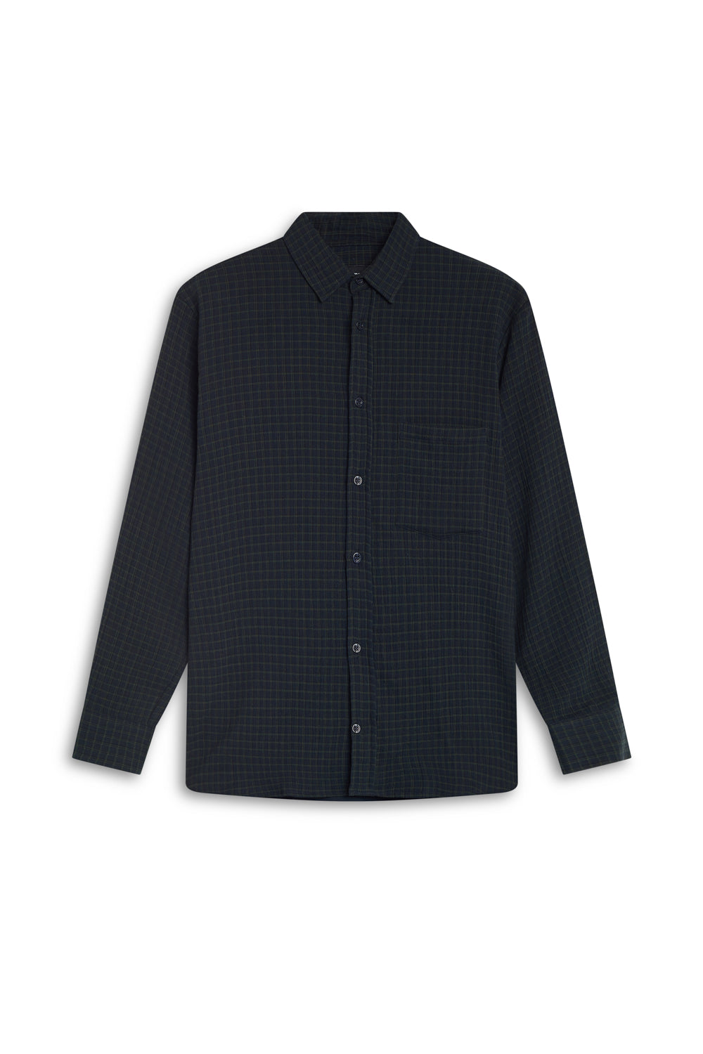 A regular-fit button-down in dark navy and green square check. It has a classic straight silhouette and a standard collar.