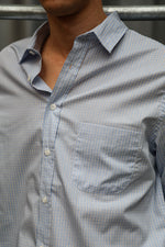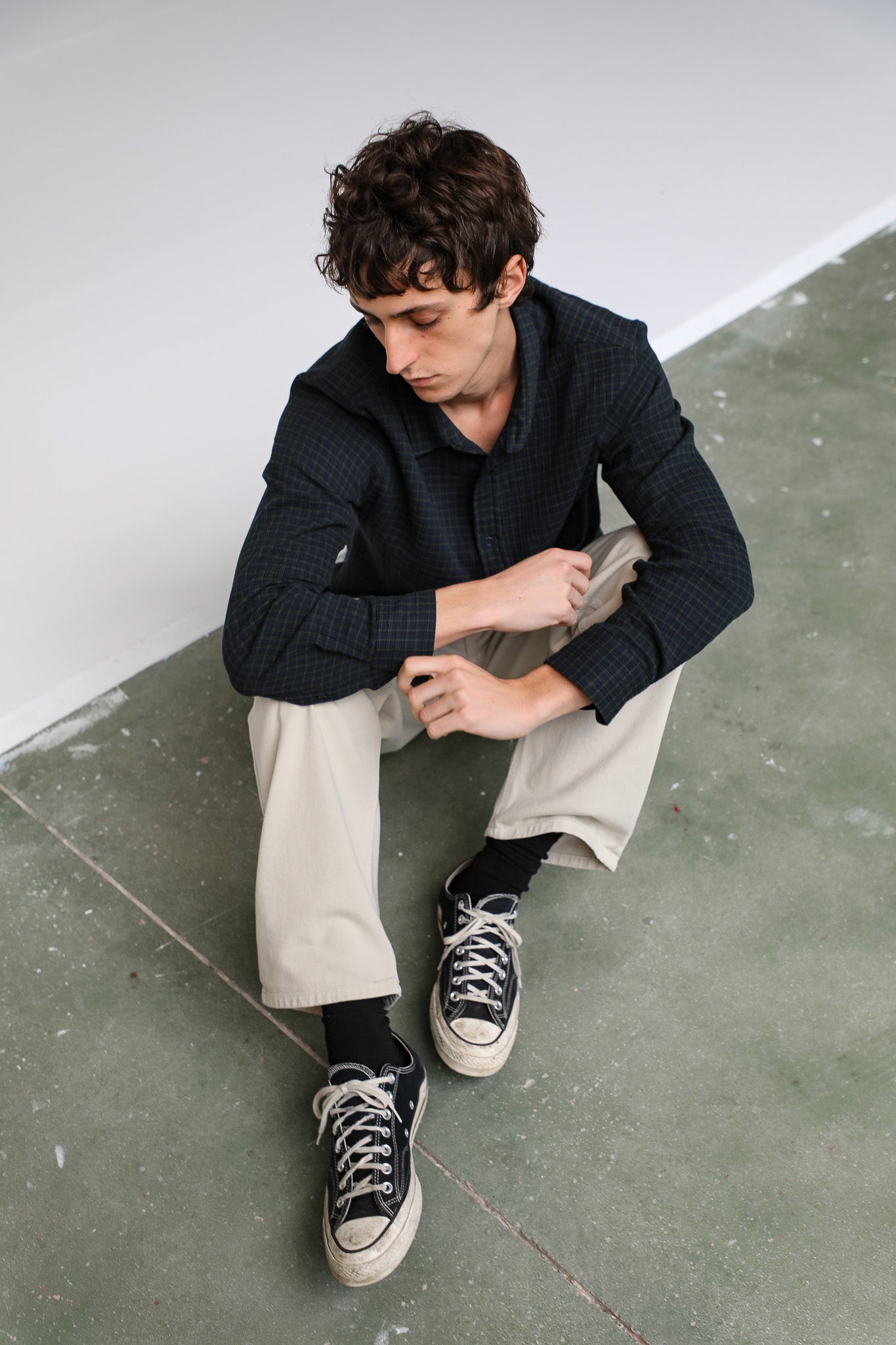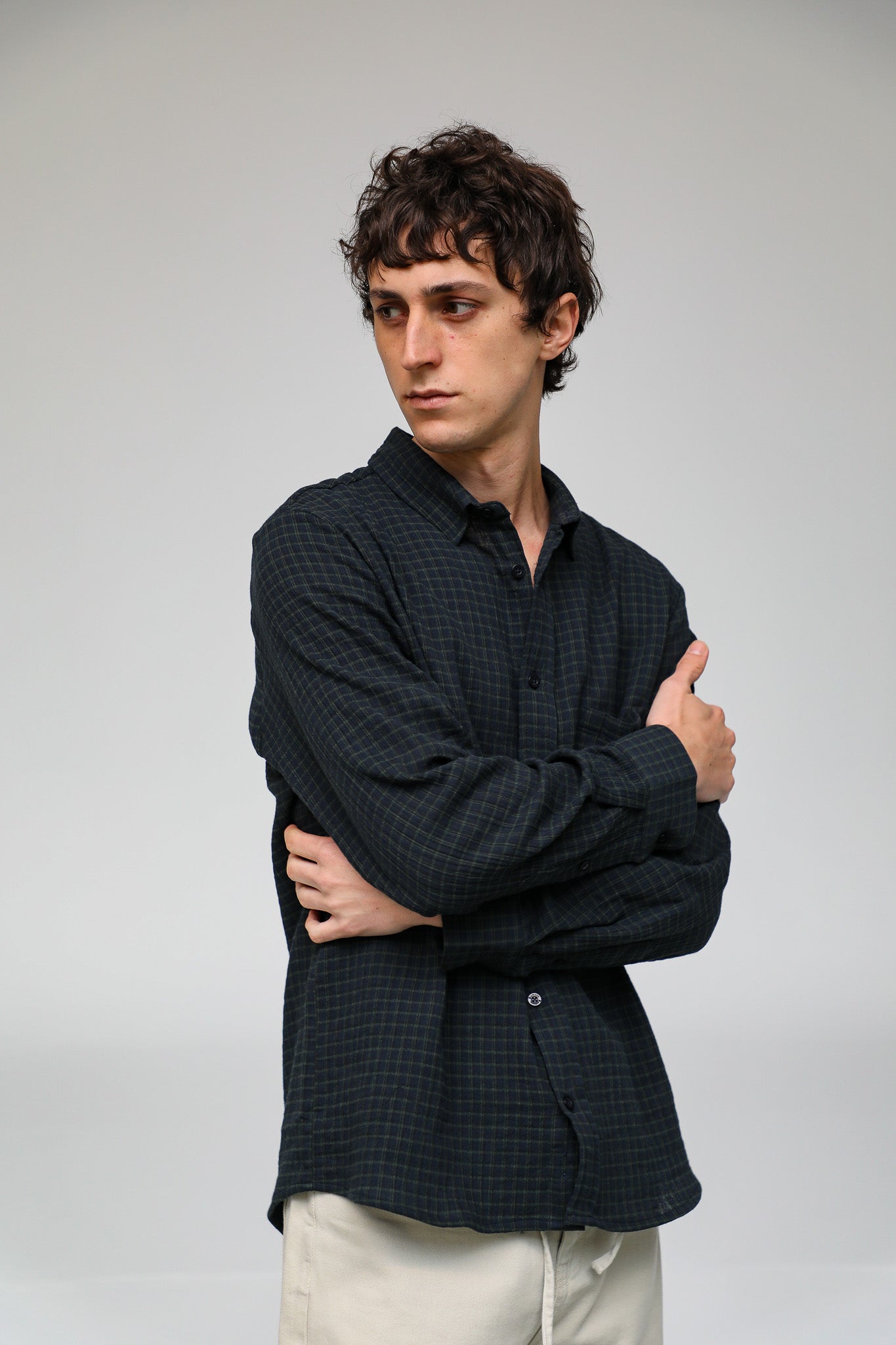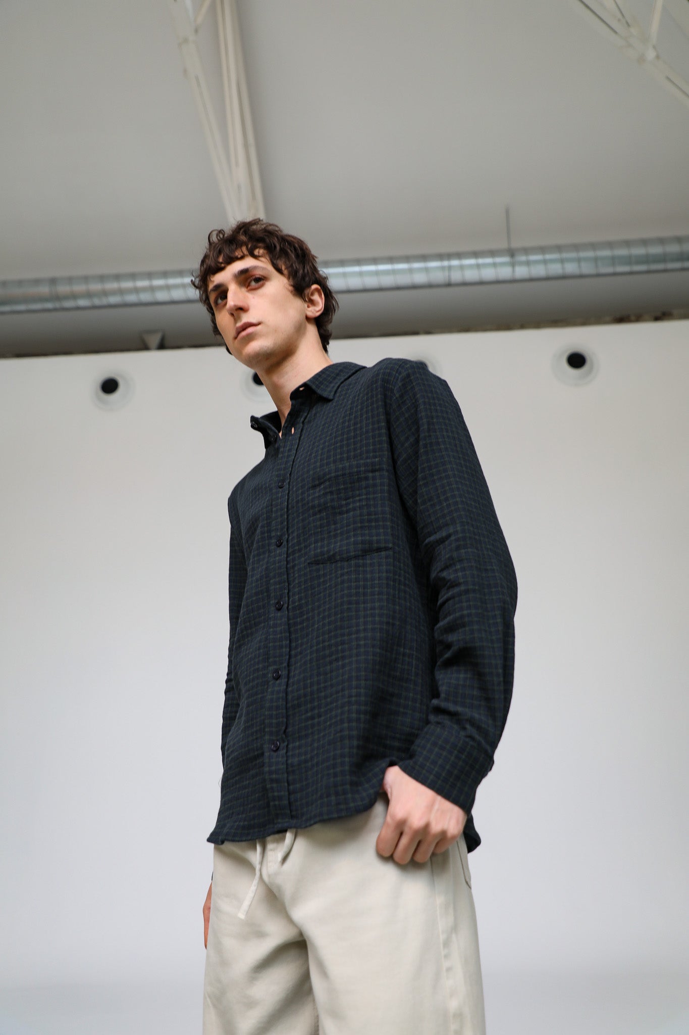 A regular-fit button-down in dark navy and green square check. It has a classic straight silhouette and a standard collar.