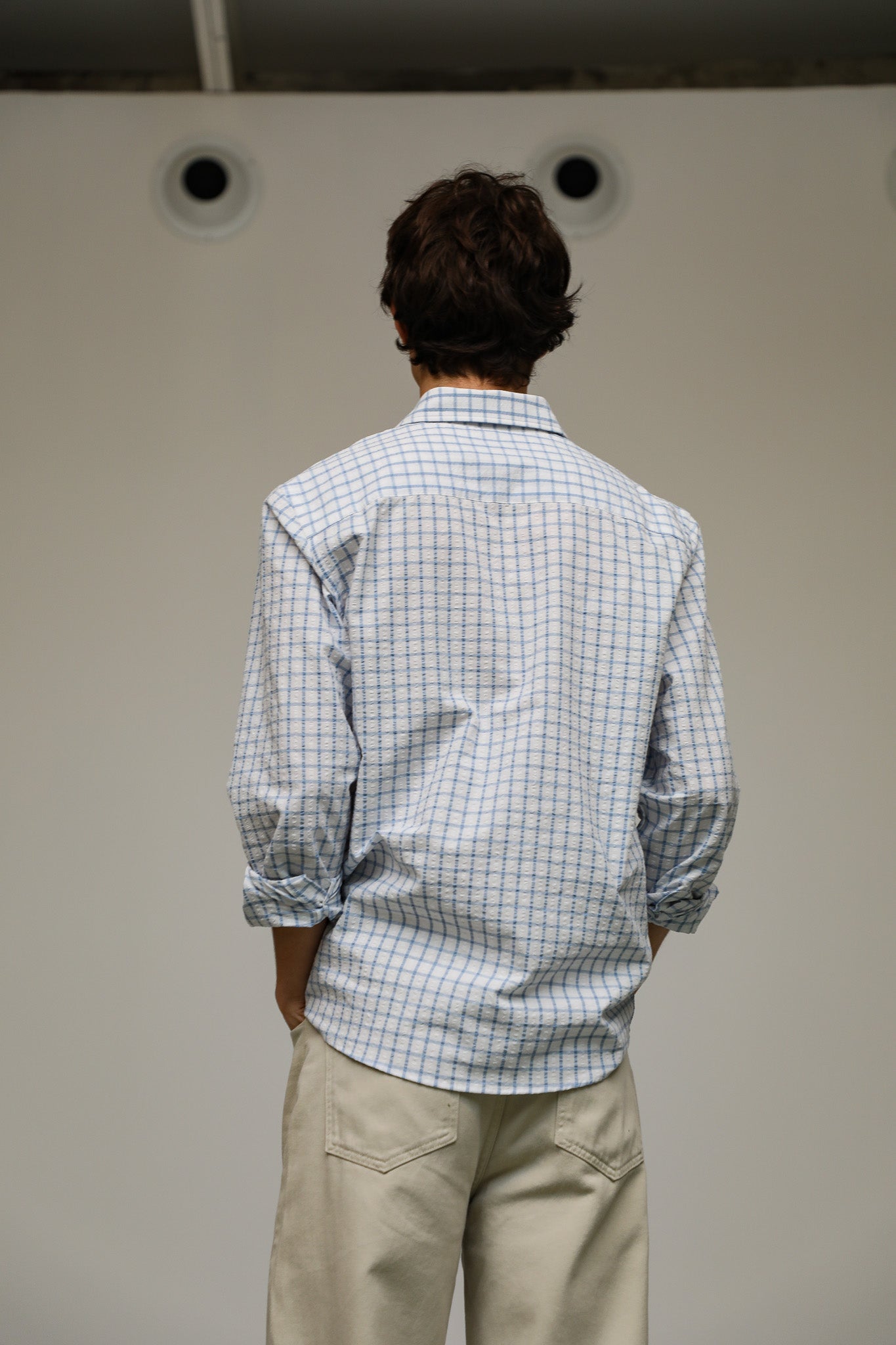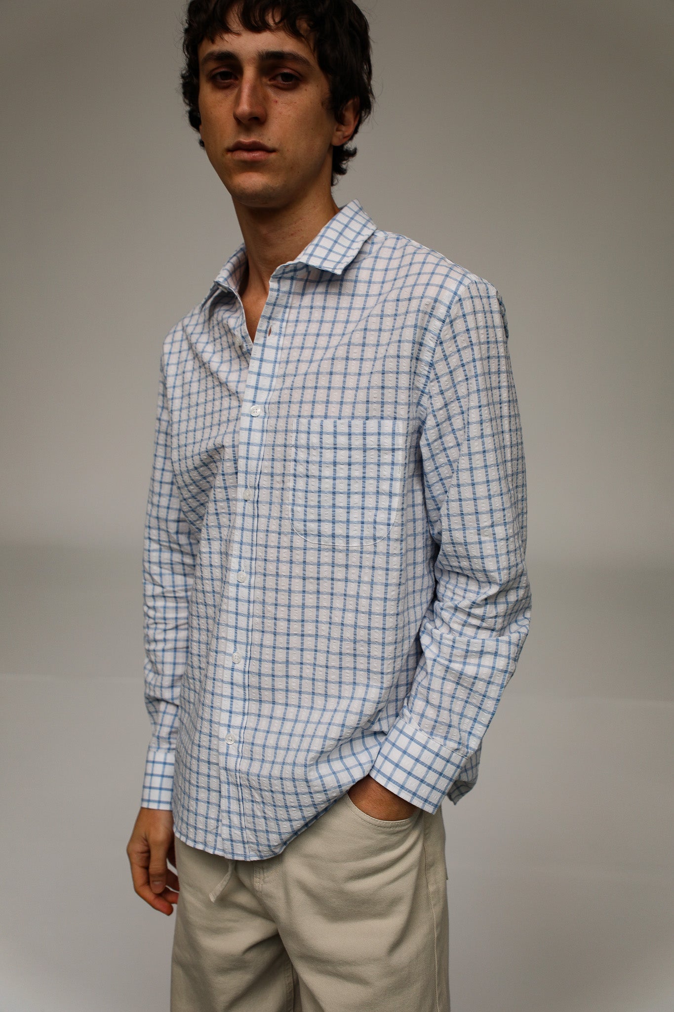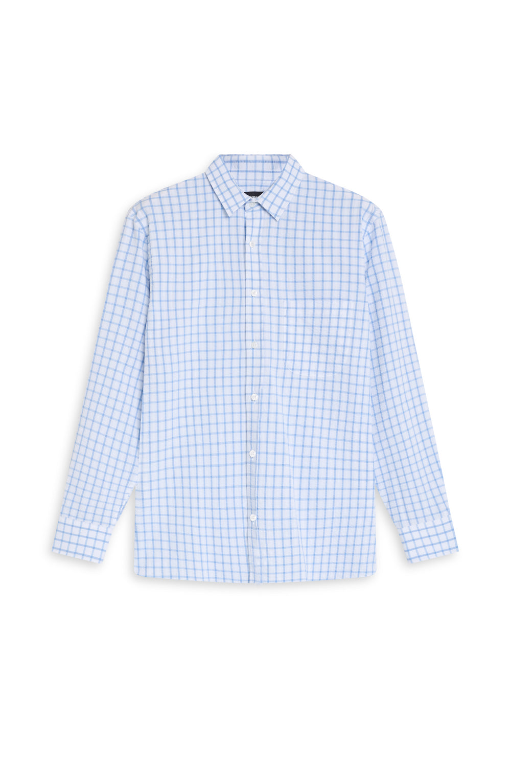 A regular-fit white shirt featuring a blue square pattern. It has a standard button-down front and a classic, straight silhouette.