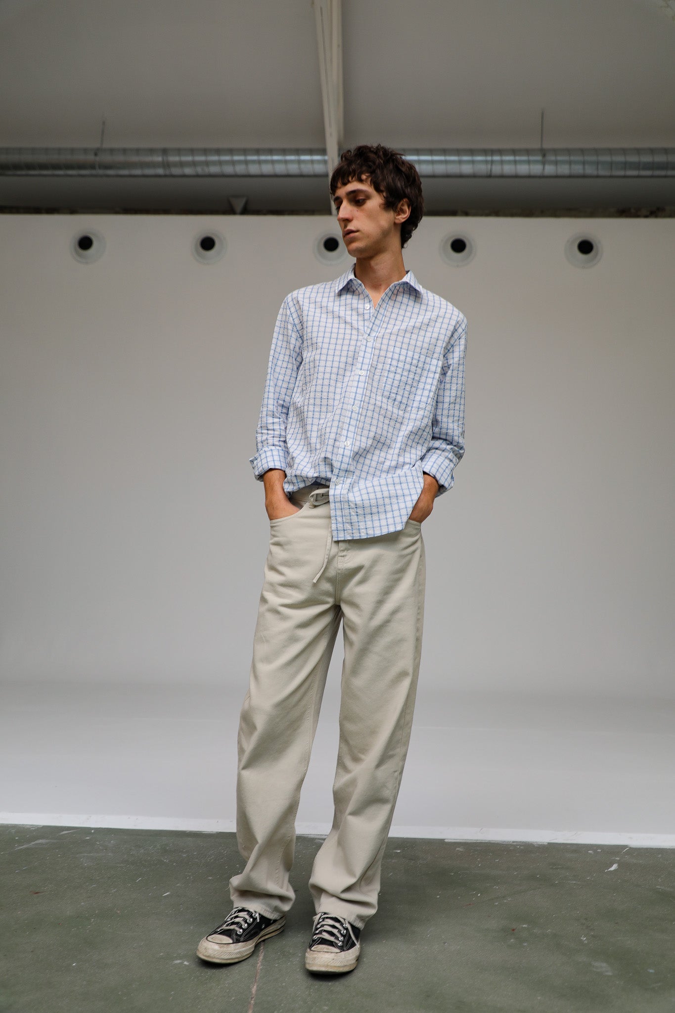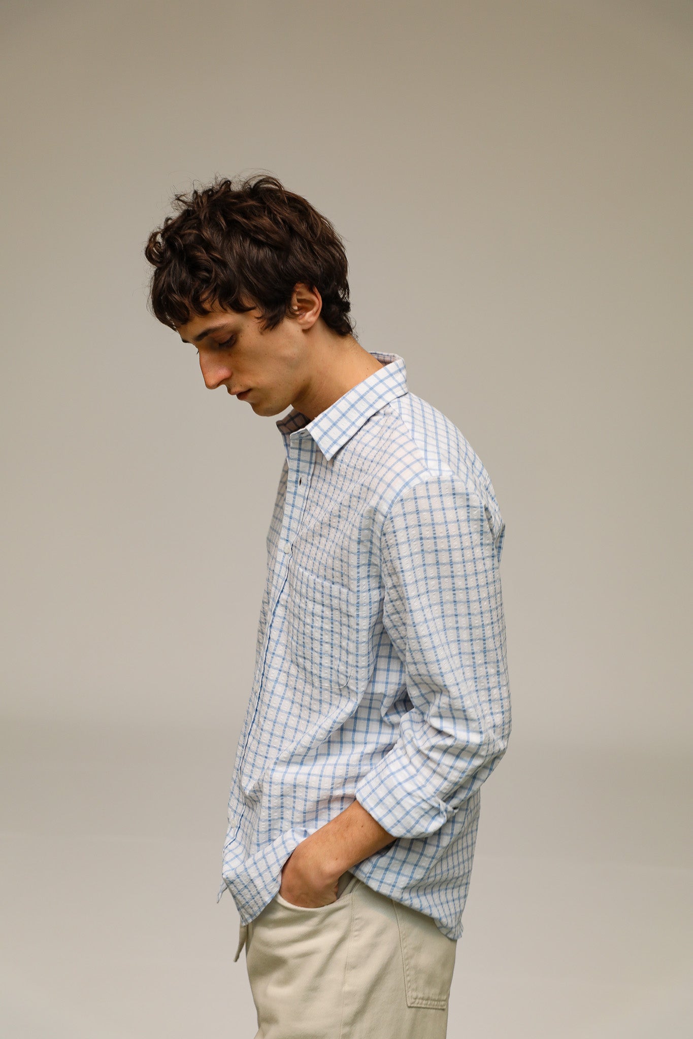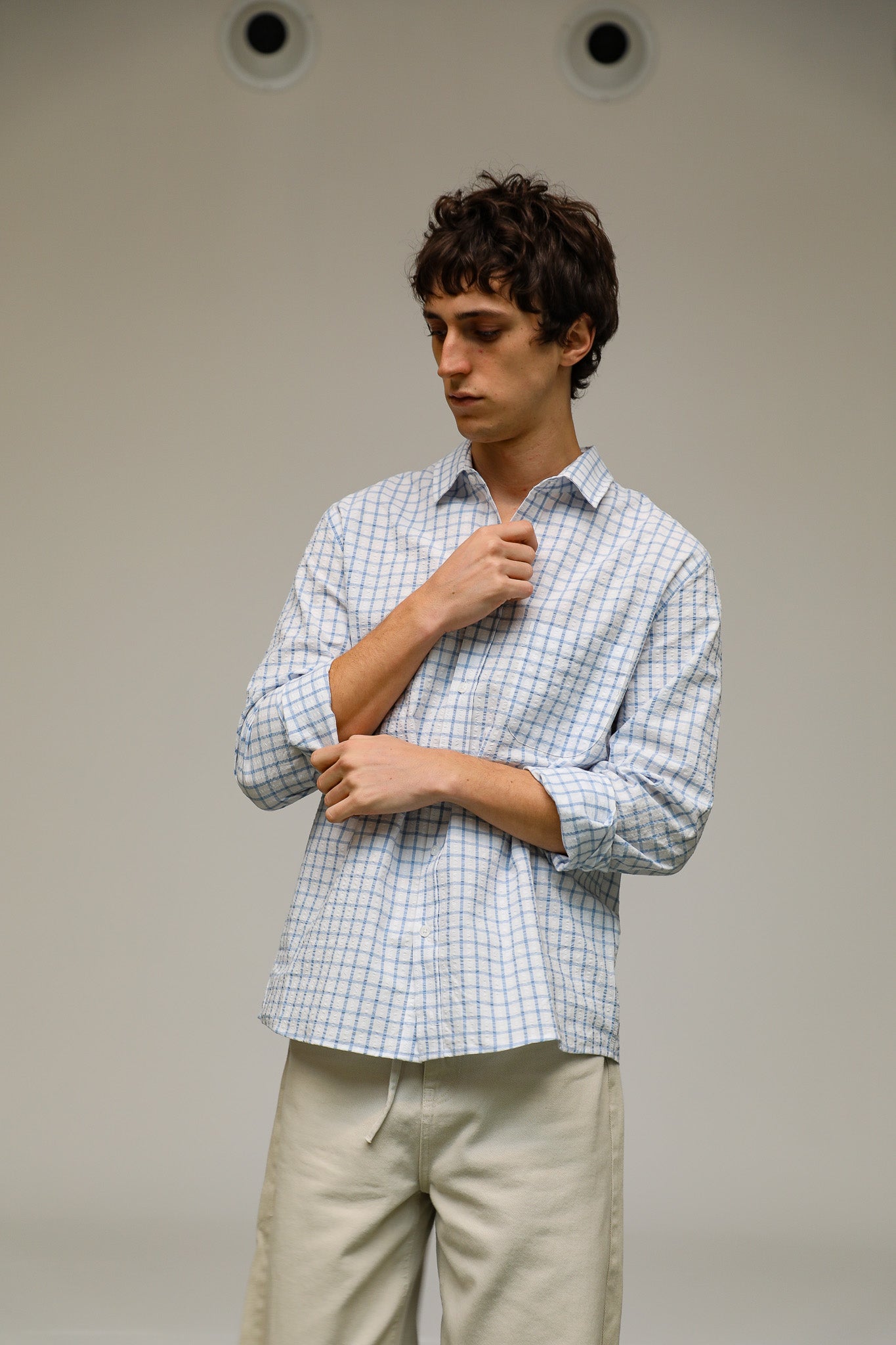 A regular-fit white shirt featuring a blue square pattern. It has a standard button-down front and a classic, straight silhouette.