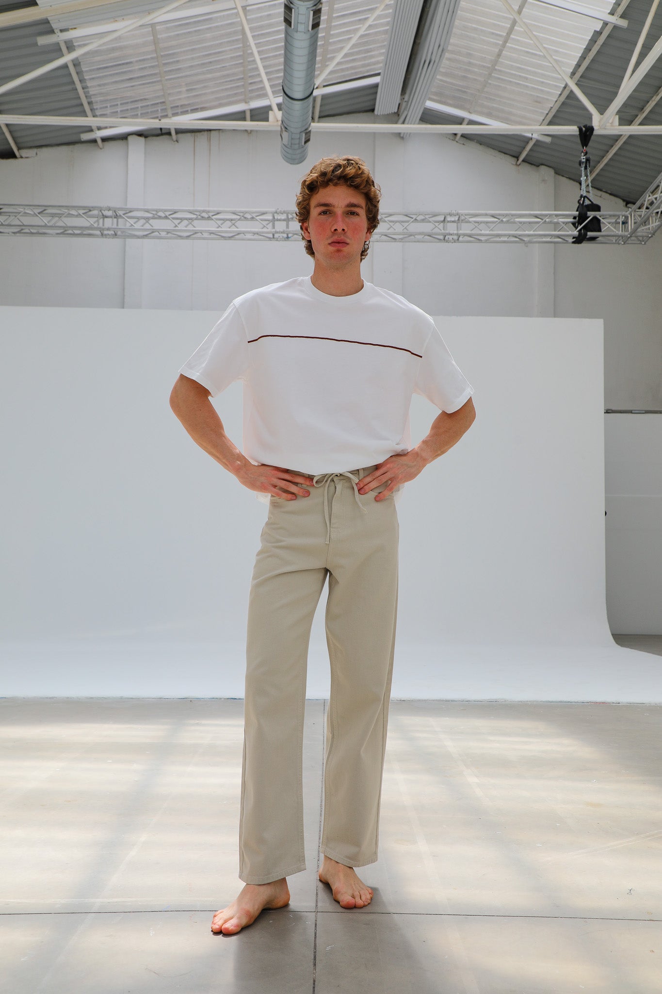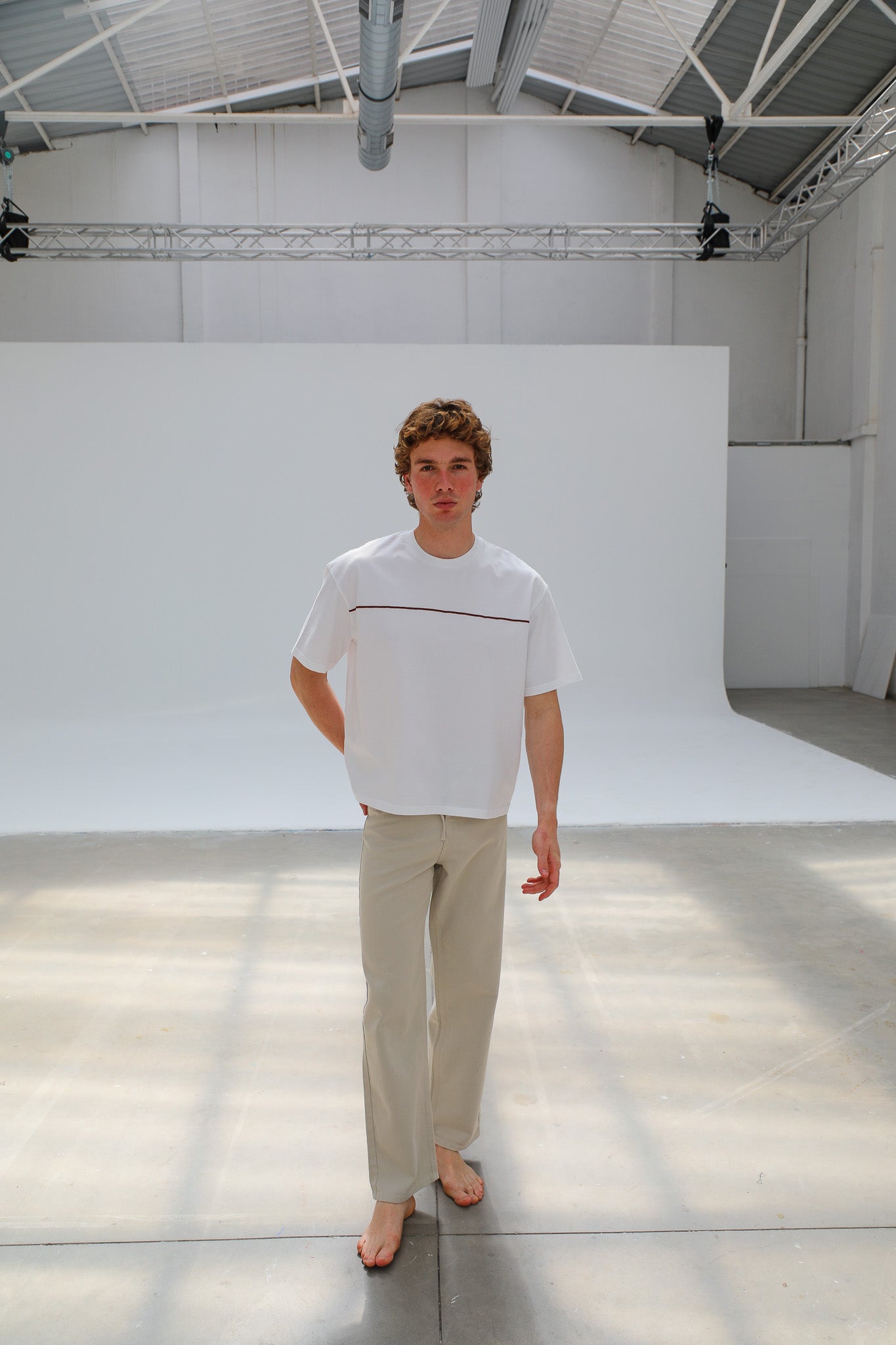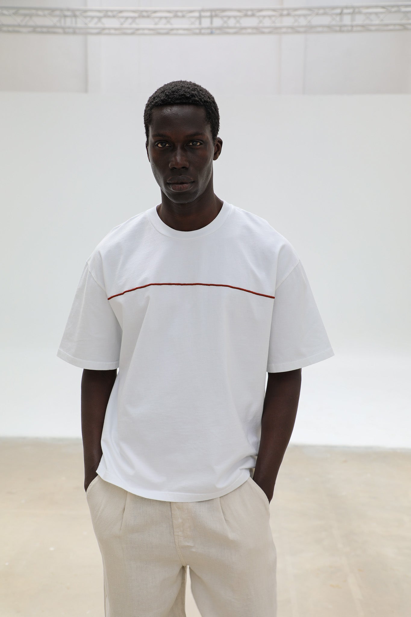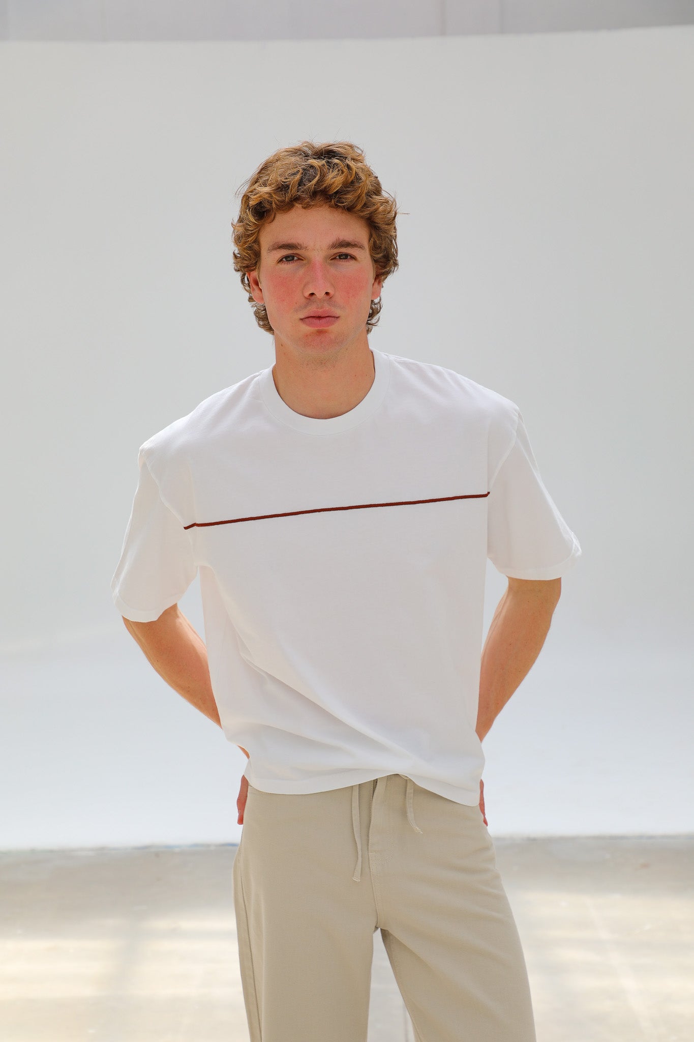 Our exclusive white t-shirt, featuring a cool embroidered red line detail across chest and a washed finish for a timeless look.