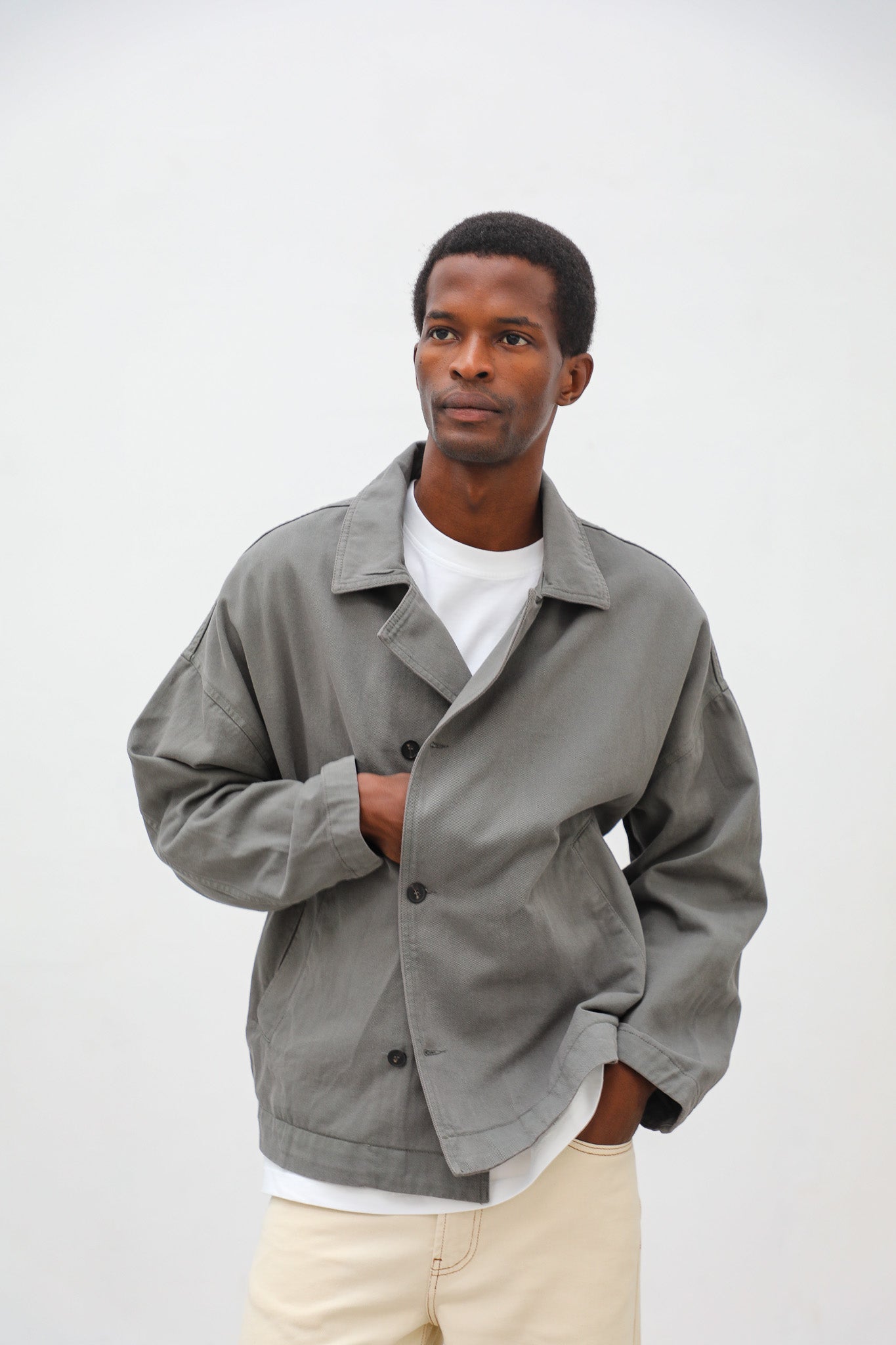 Green jacket featuring an asymmetric button closure and a modern, boxy fit.