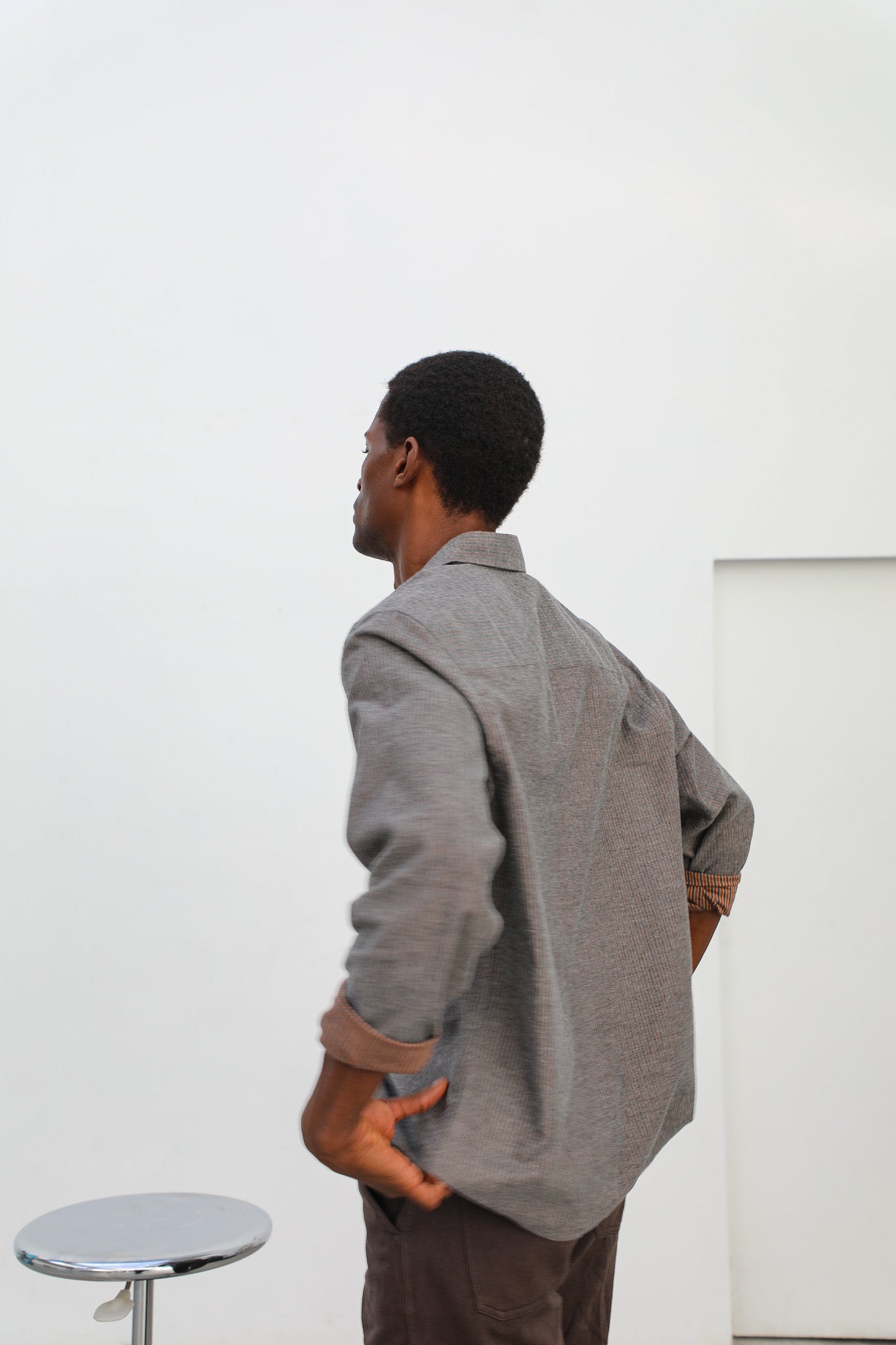 Brown and grey button-down shirt featuring a striped pattern and cropped fit.