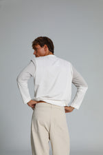 Blue long sleeve contrast T-shirt featuring a light blue color block that extends from the shoulder to the elbow.