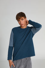White long sleeve contrast T-shirt featuring a grey color block that extends from the shoulder to the elbow.