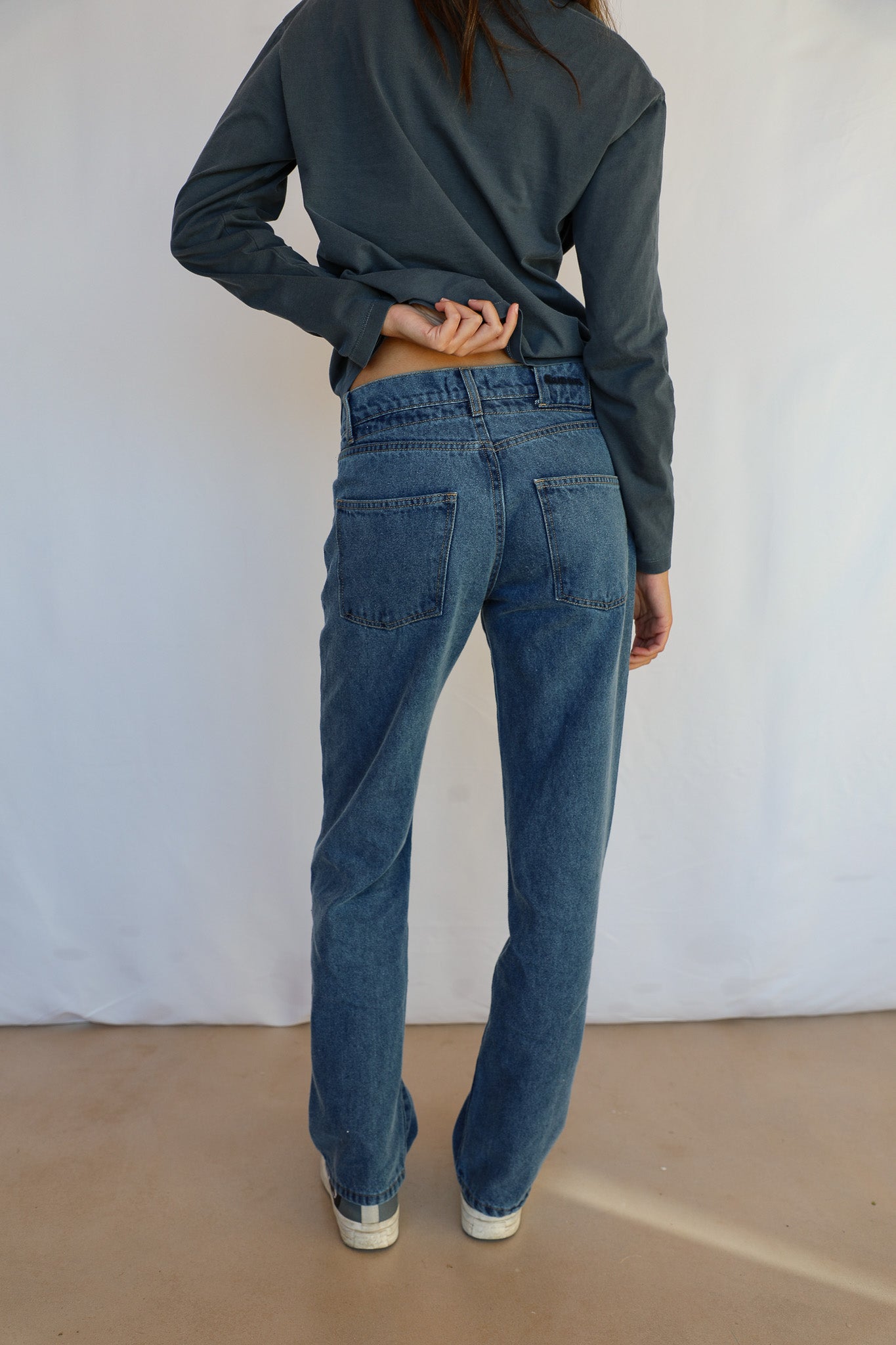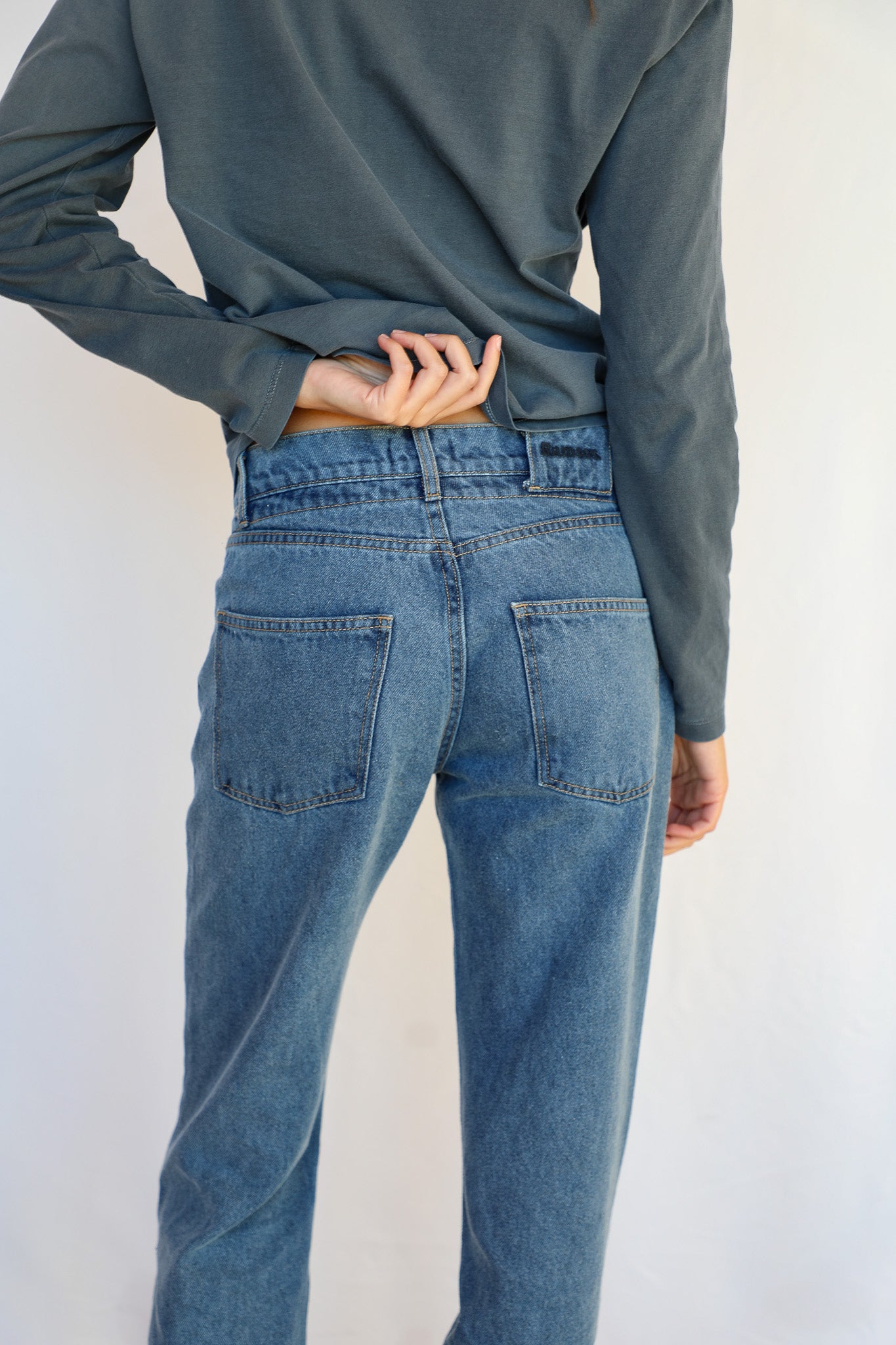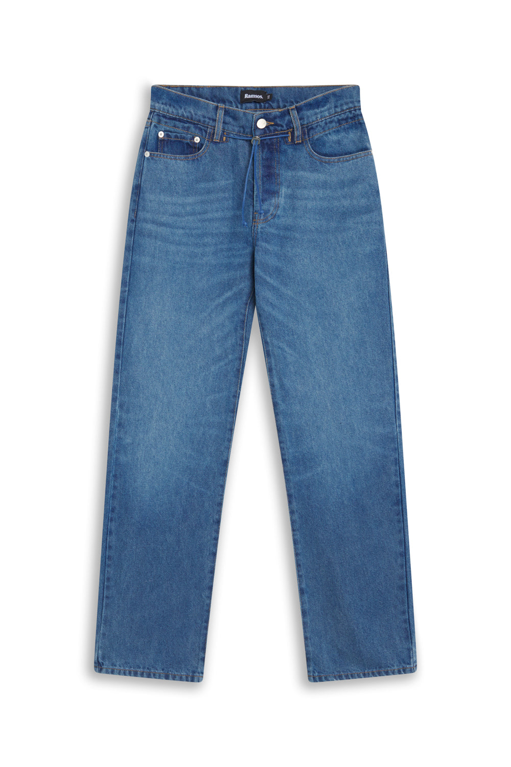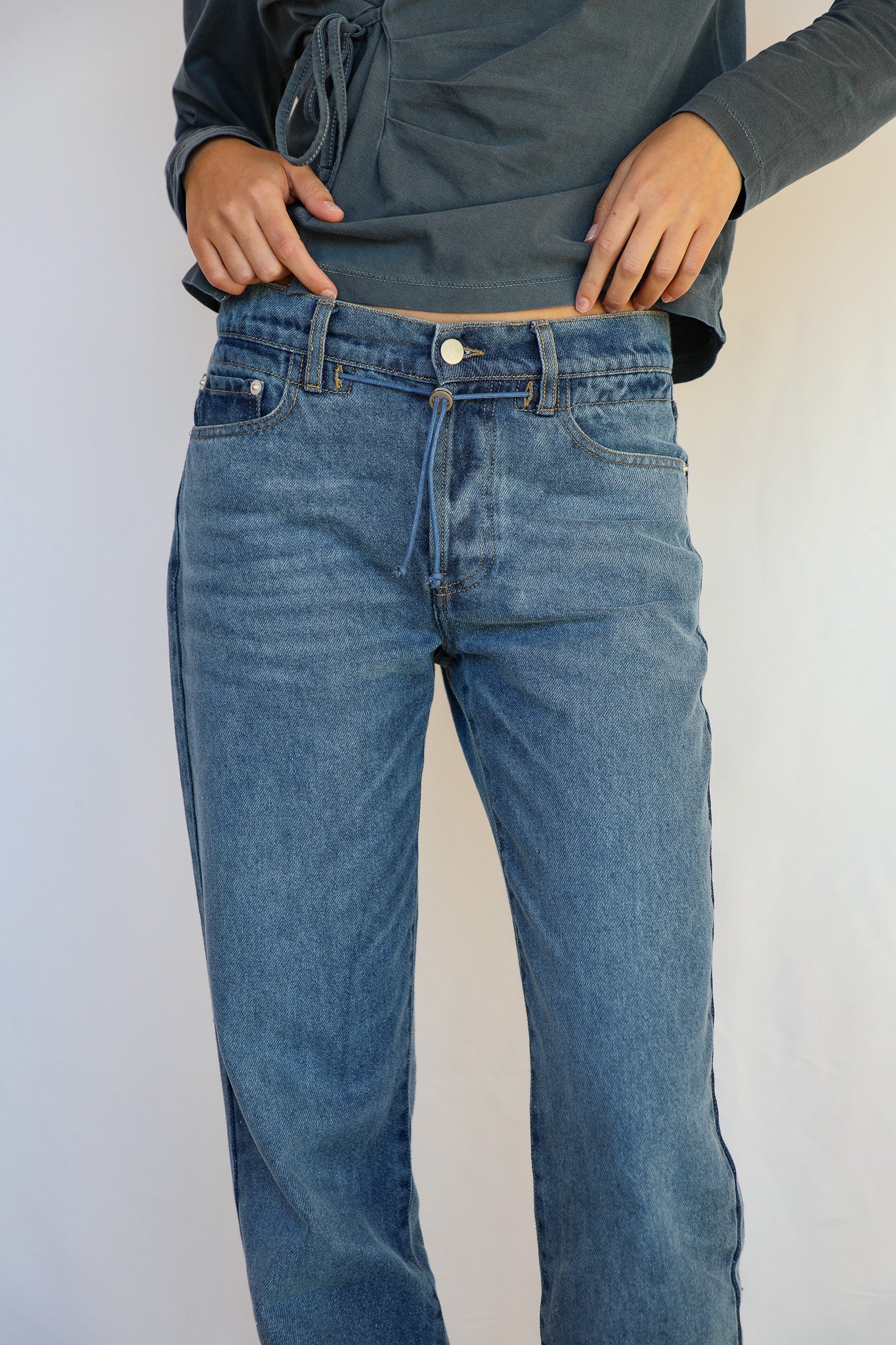 Denim jeans featuring an elastic, adjustable detail integrated into the waist button closure.