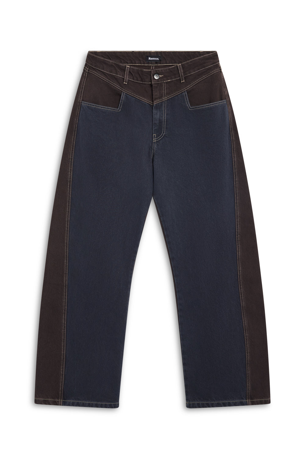 Wide-fit two-tone jeans, featuring denim blue at the back and brown at the front, finished with contrast pockets.