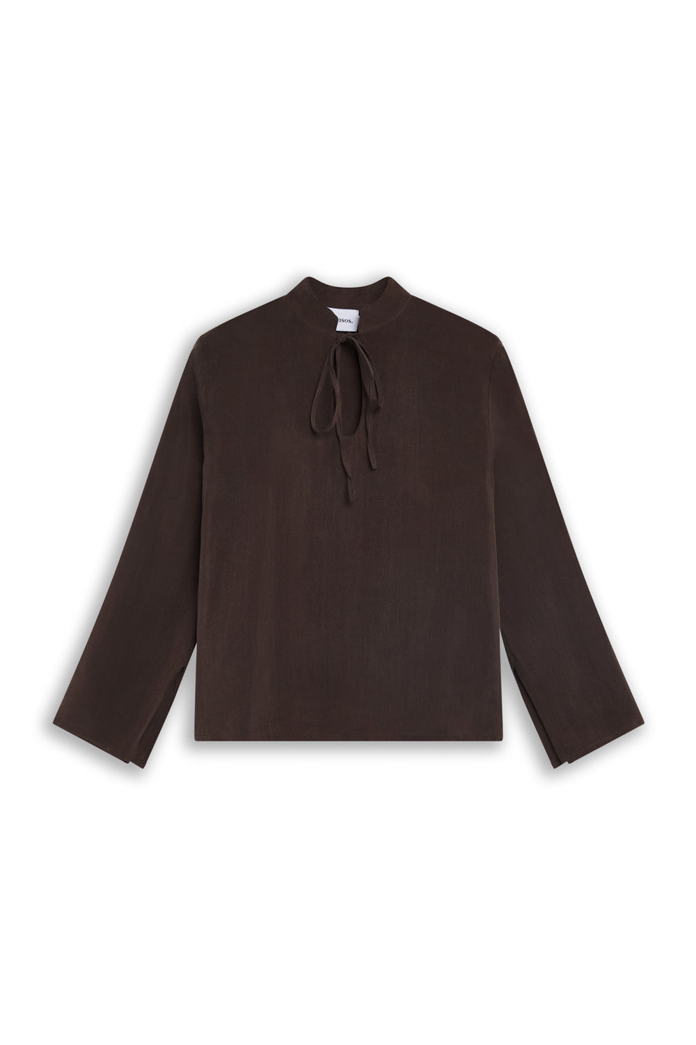 Long-sleeve brown cupro blouse featuring a lifted neckline with a keyhole and tie detail at the chest, along with open, draped sleeves for an elegant, flowing silhouette.