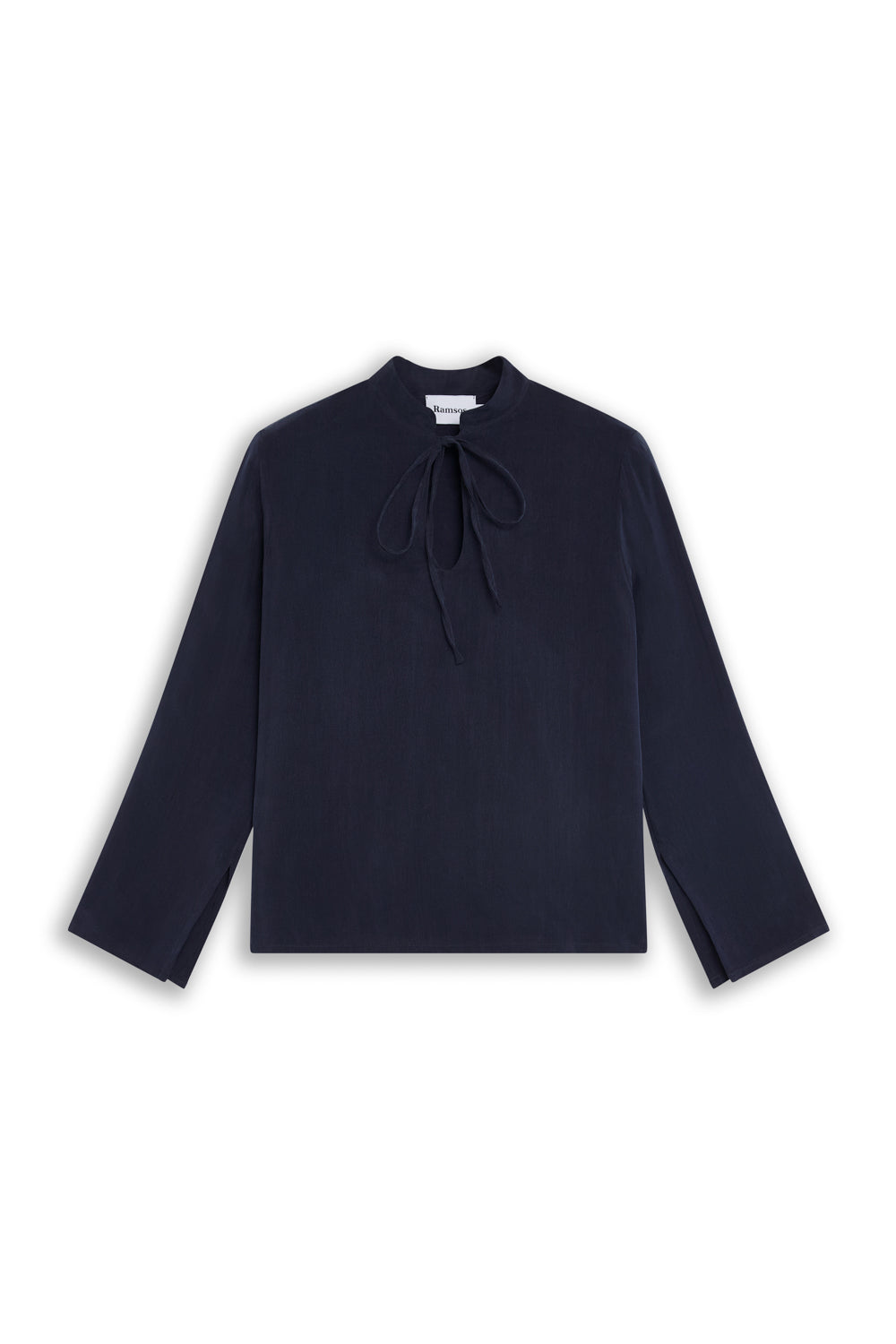 Long-sleeve cupro blouse in burgundy, featuring a V-neckline and a front slit that opens down to the belly button for a bold, elegant touch. Complete the look with the Flow Cupro Pants Burgundy.