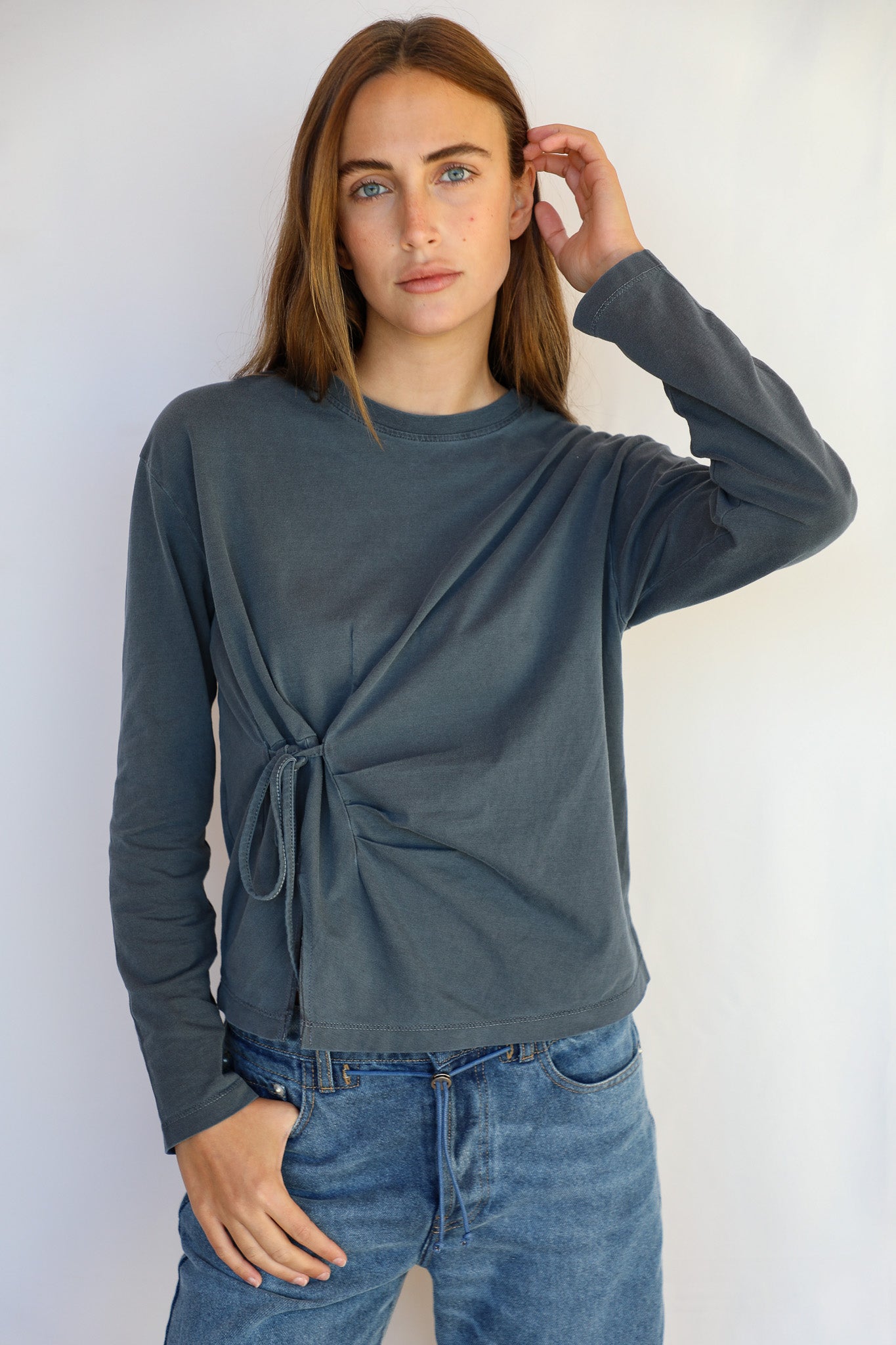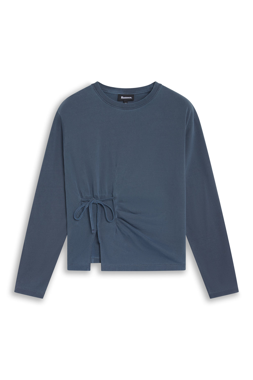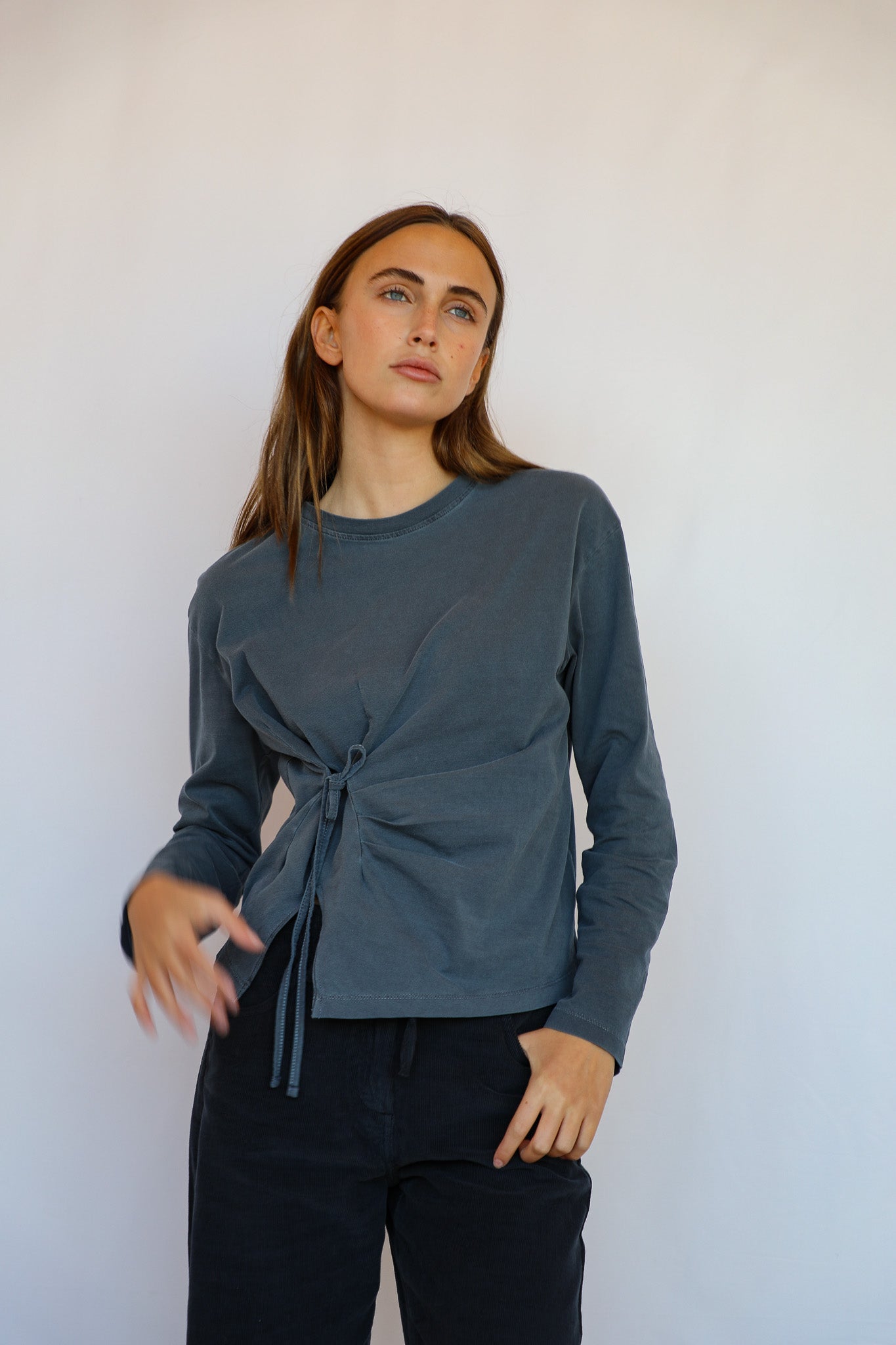 Long sleeve t-shirt in navy blue, with a side tie and a round neck.