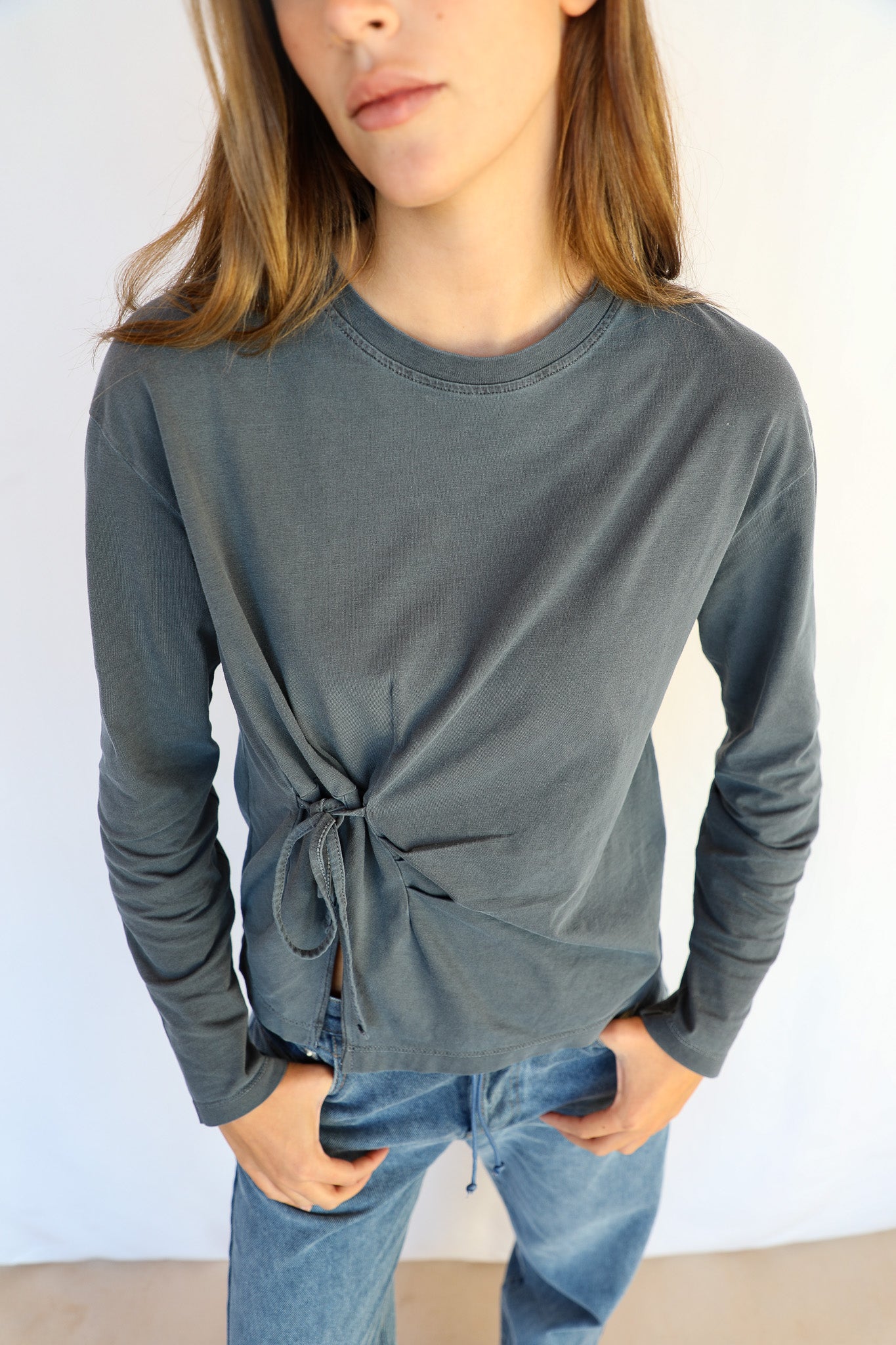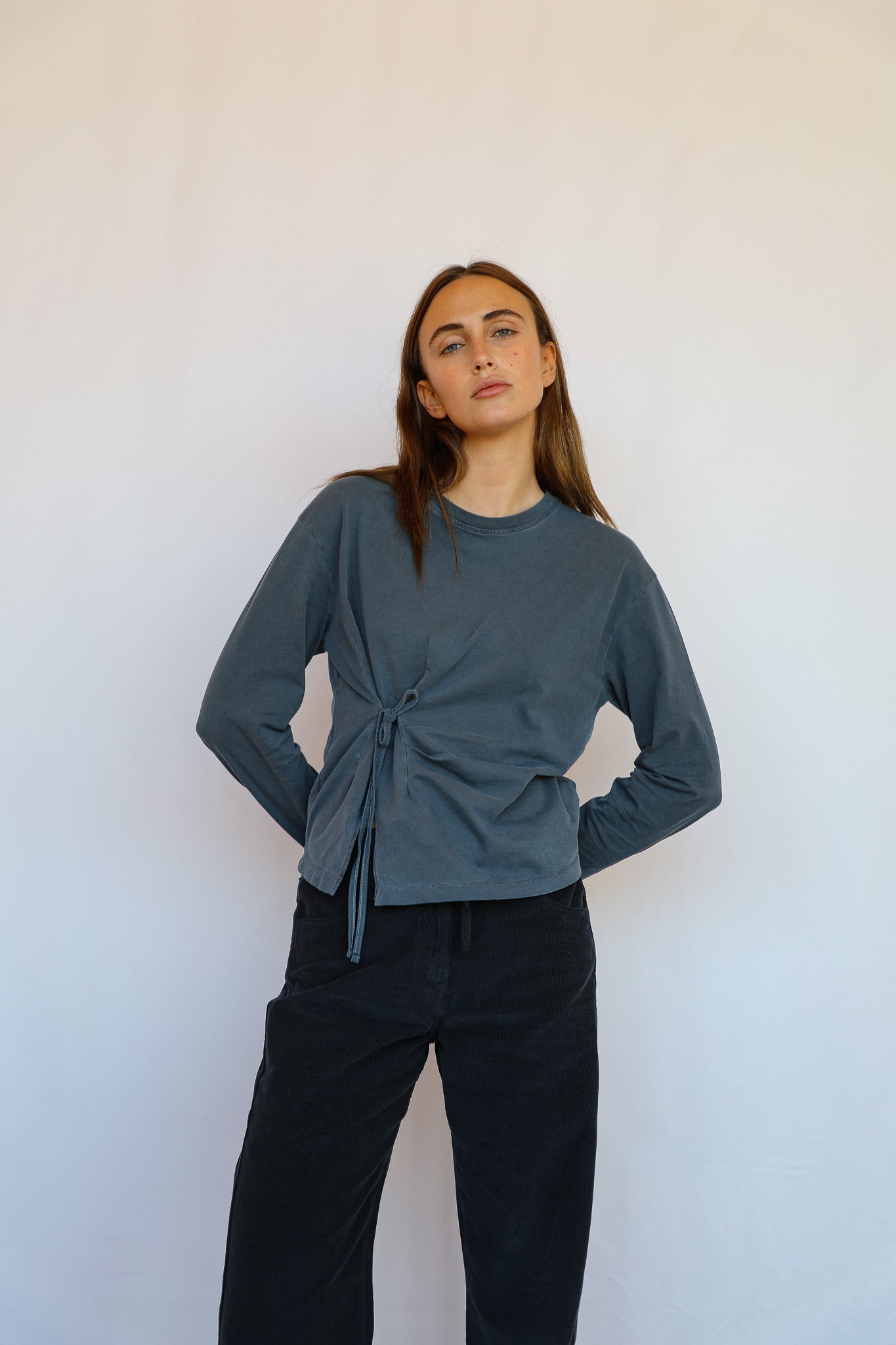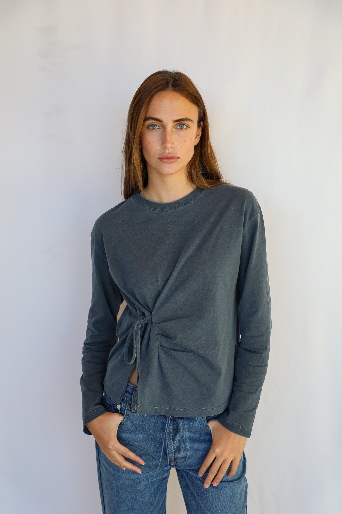 Long sleeve t-shirt in navy blue, with a side tie and a round neck.
