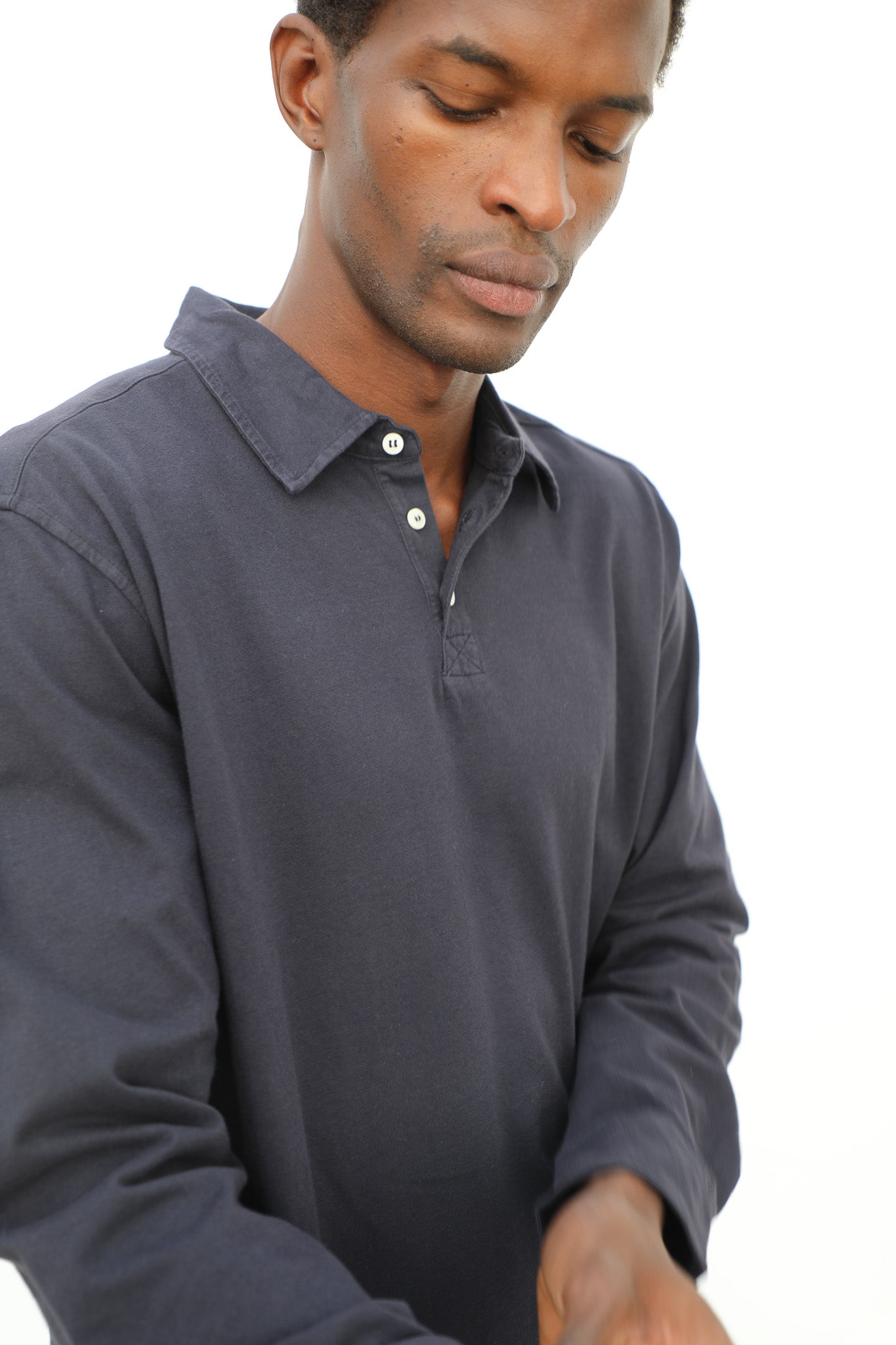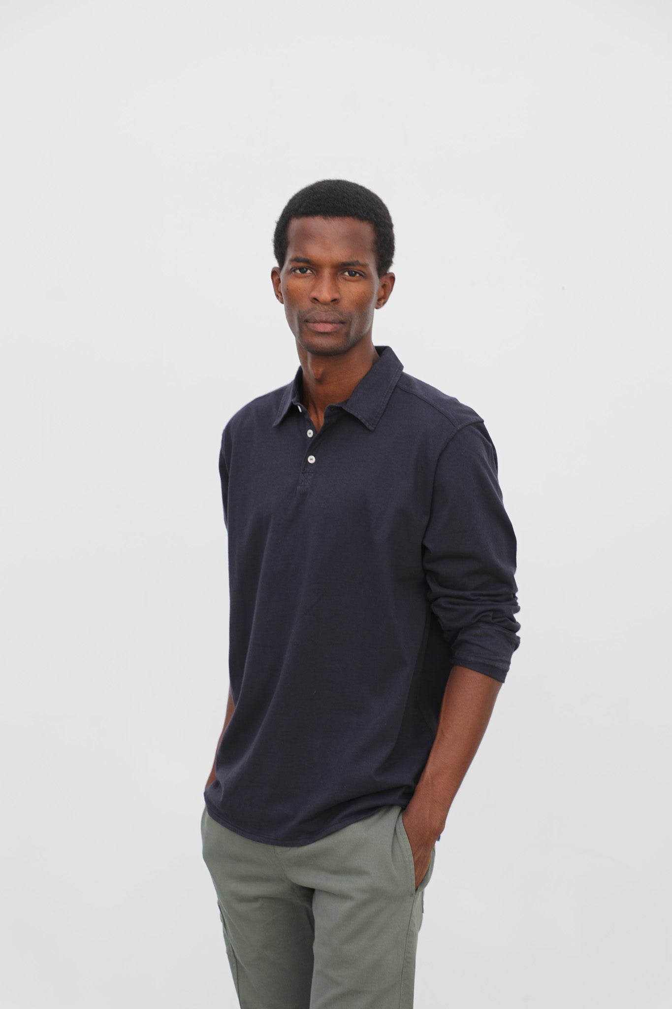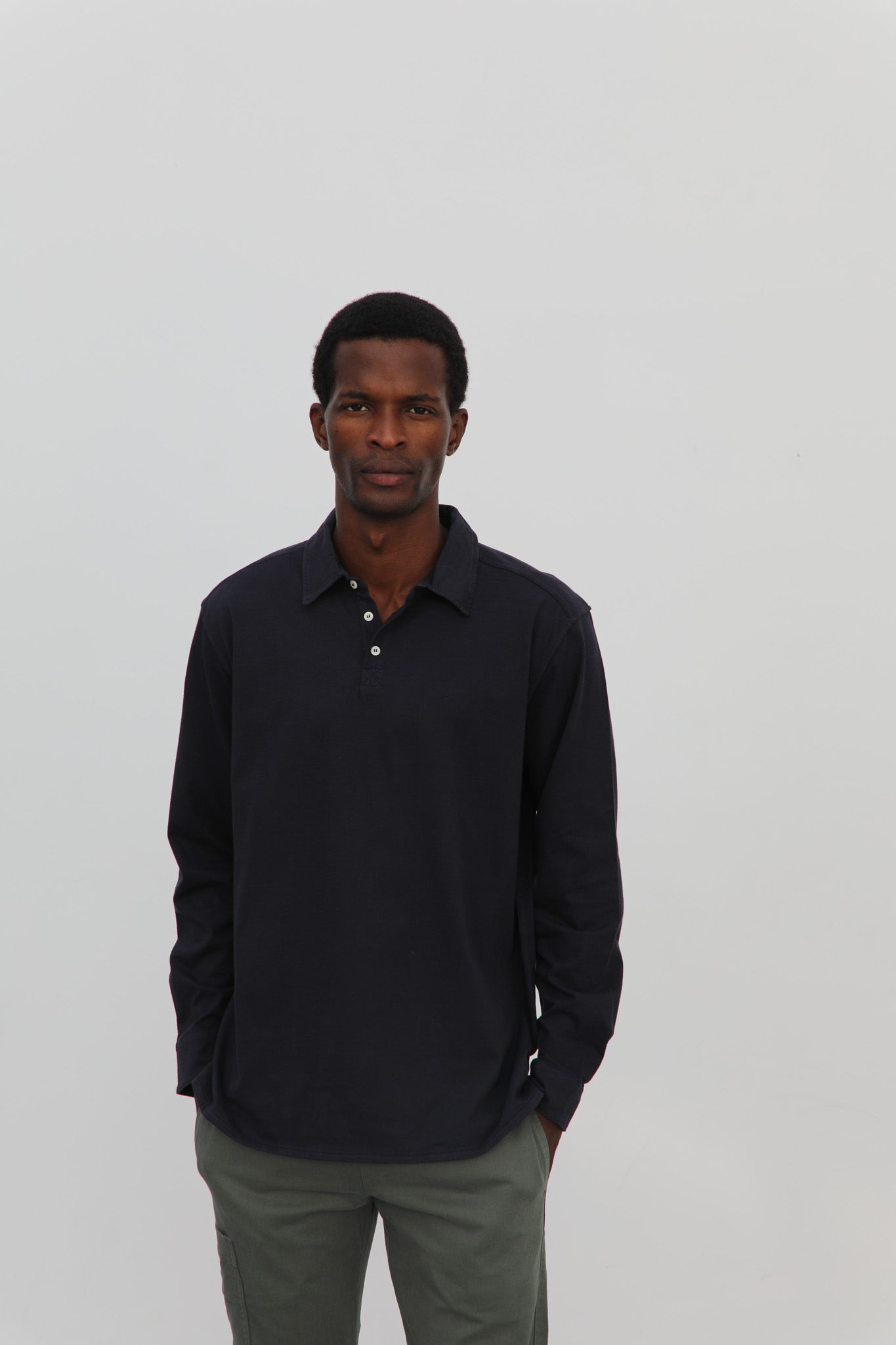 Dark navy soft long sleeve polo with buttons, made from 100% organic cotton for comfort and breathability. The buttoned design offers a timeless and versatile style, suitable for both casual and smart-casual occasions.