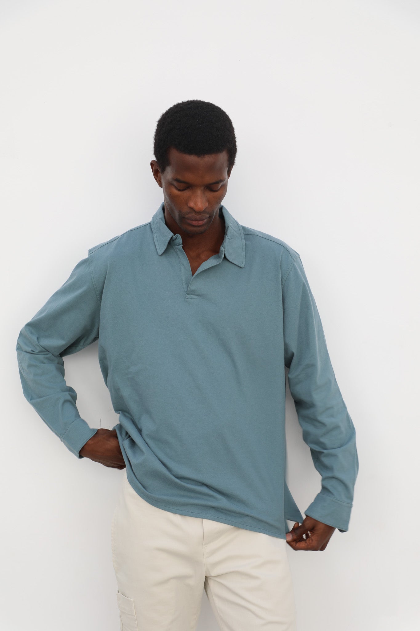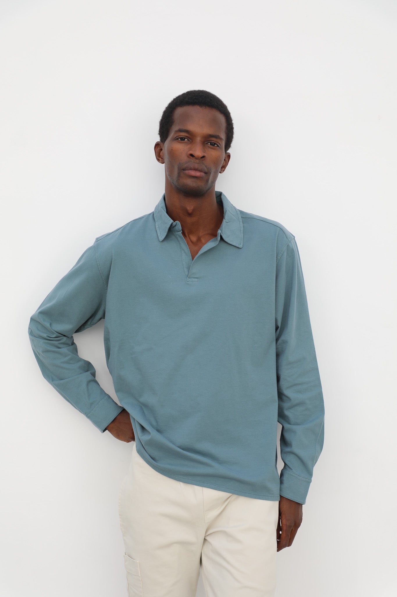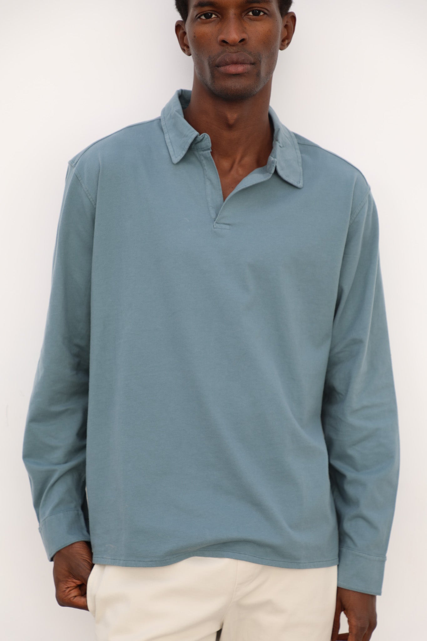 Blue soft long sleeve polo shirt without buttons, made from 100% organic cotton for a breathable and comfortable fit. Its simple and sleek design makes it a versatile choice for casual or smart-casual occasions.