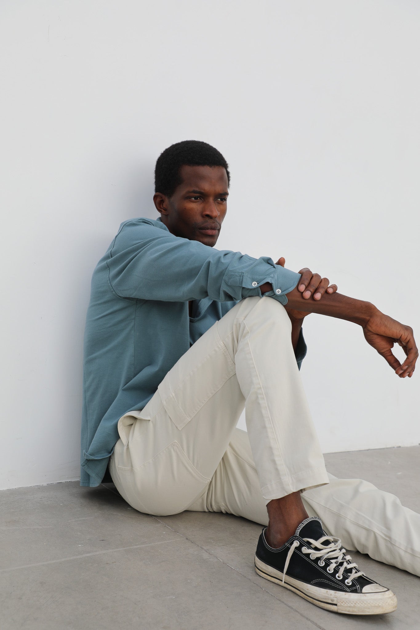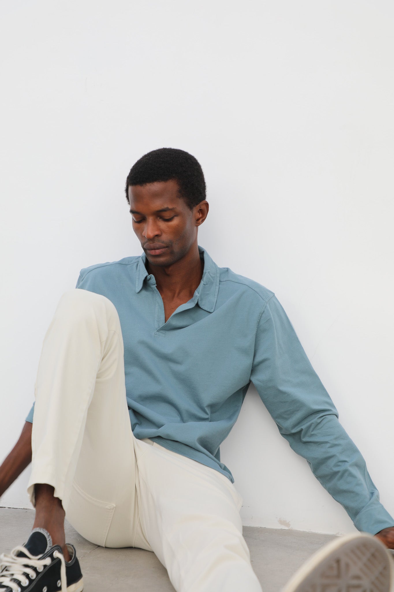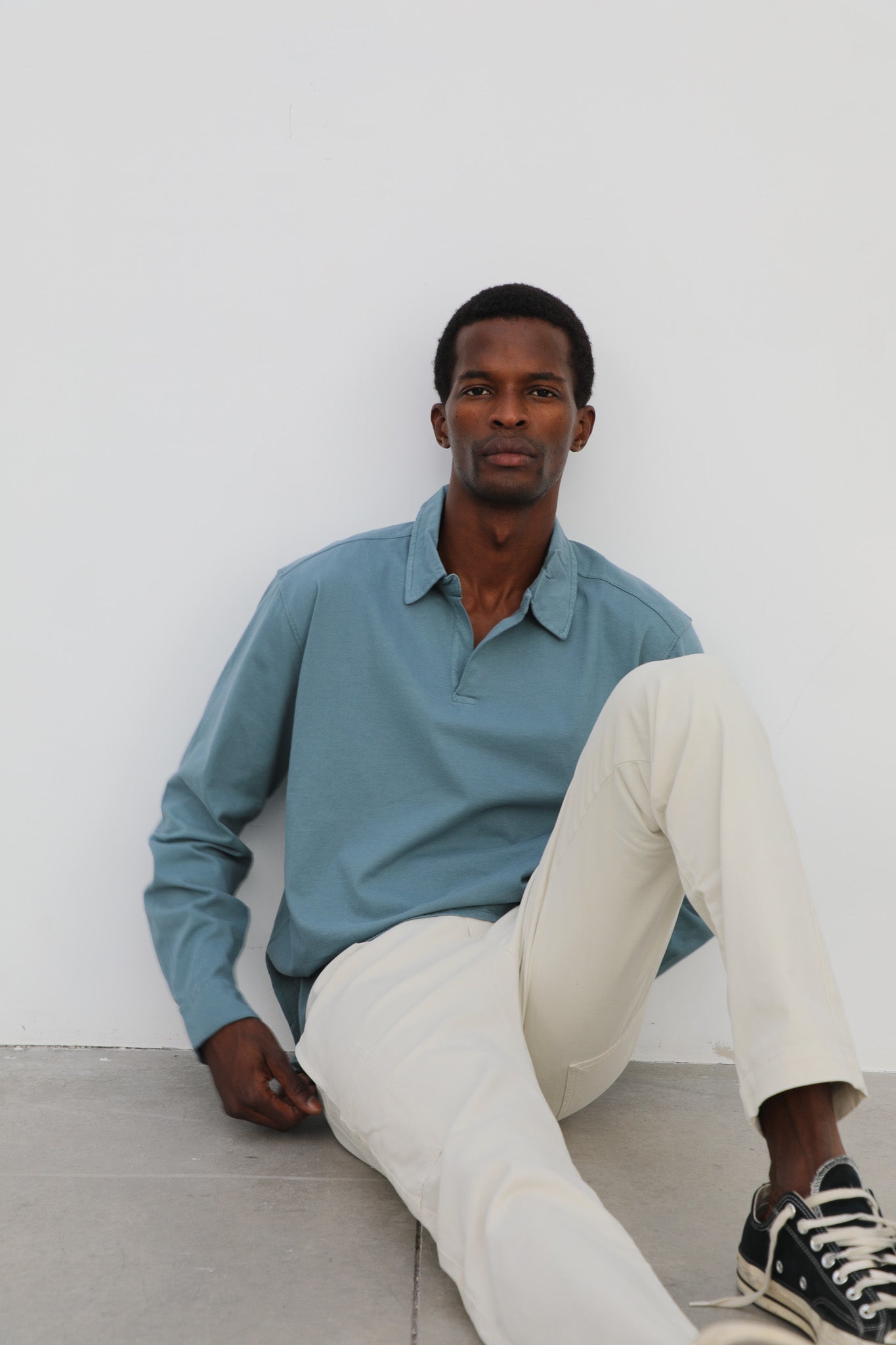 Blue soft long sleeve polo shirt without buttons, made from 100% organic cotton for a breathable and comfortable fit. Its simple and sleek design makes it a versatile choice for casual or smart-casual occasions.