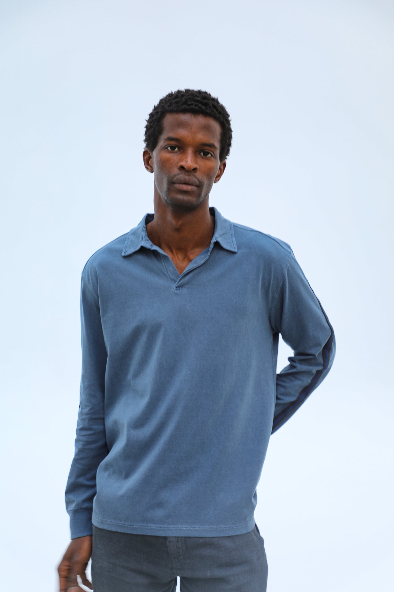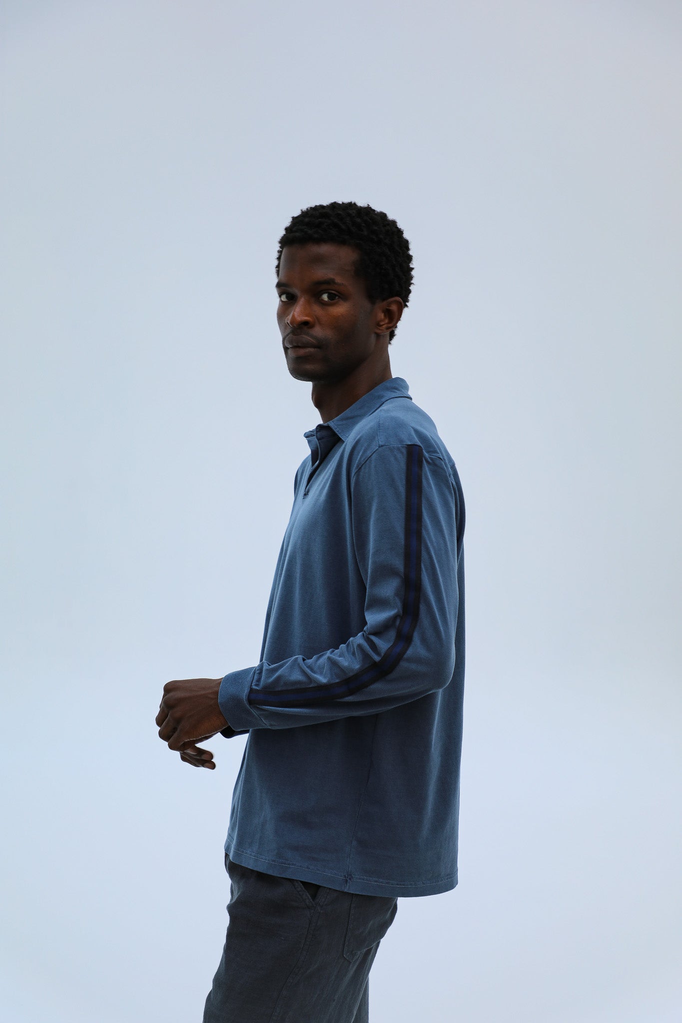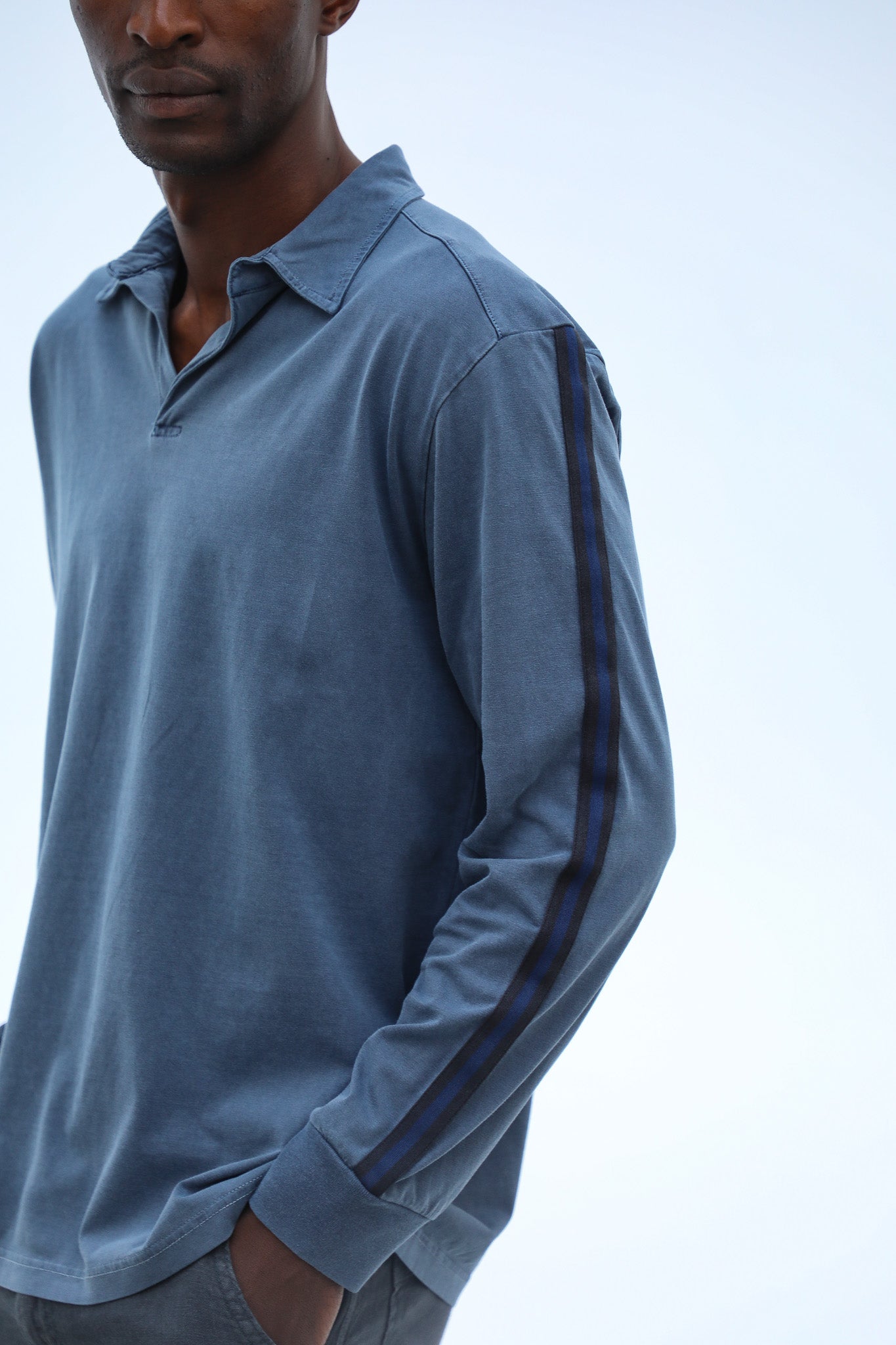 Men's polo in with stripe detail, featuring a clean, buttonless design.