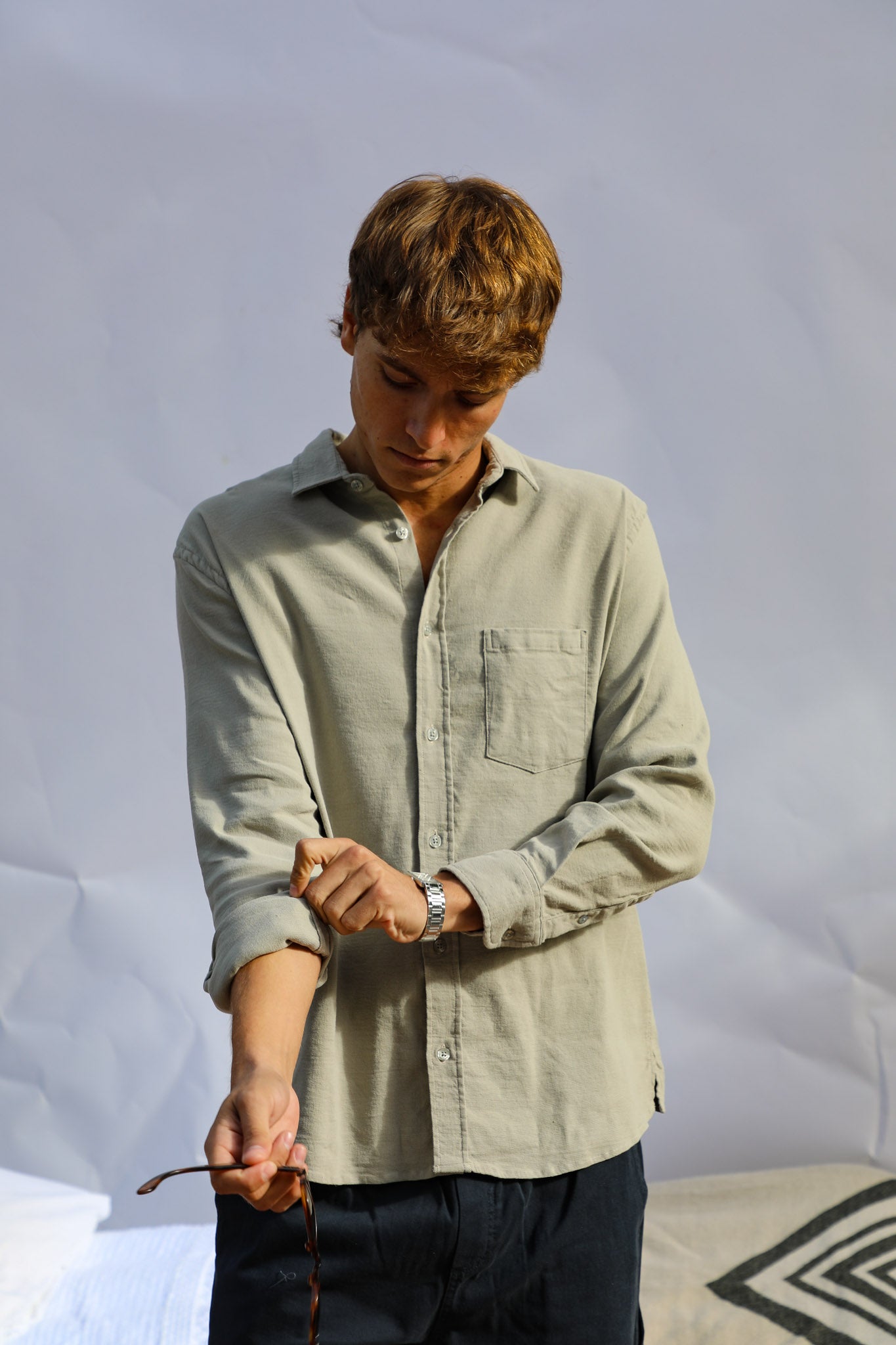Discover our exclusive button-up shirt in a versatile khaki tone, designed with a slight elastic feel for enhanced comfort and fit. Made from organic cotton, this shirt combines breathability with a refined style, perfect for a relaxed yet polished look.