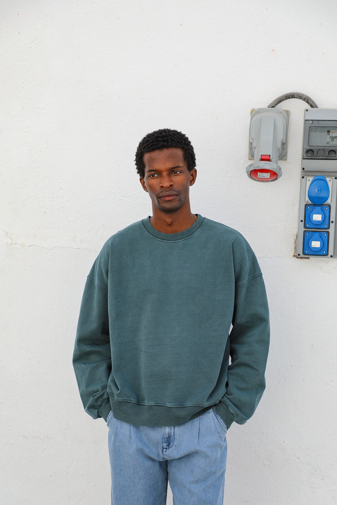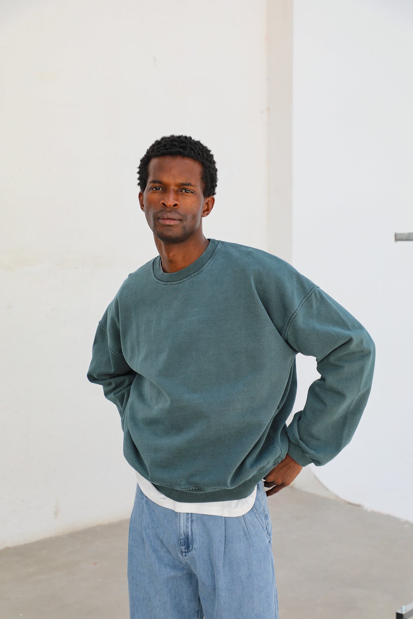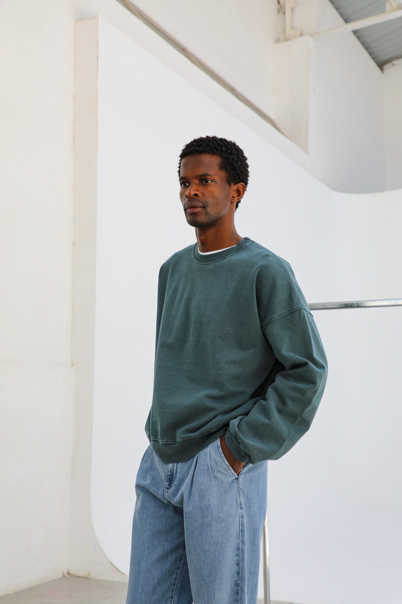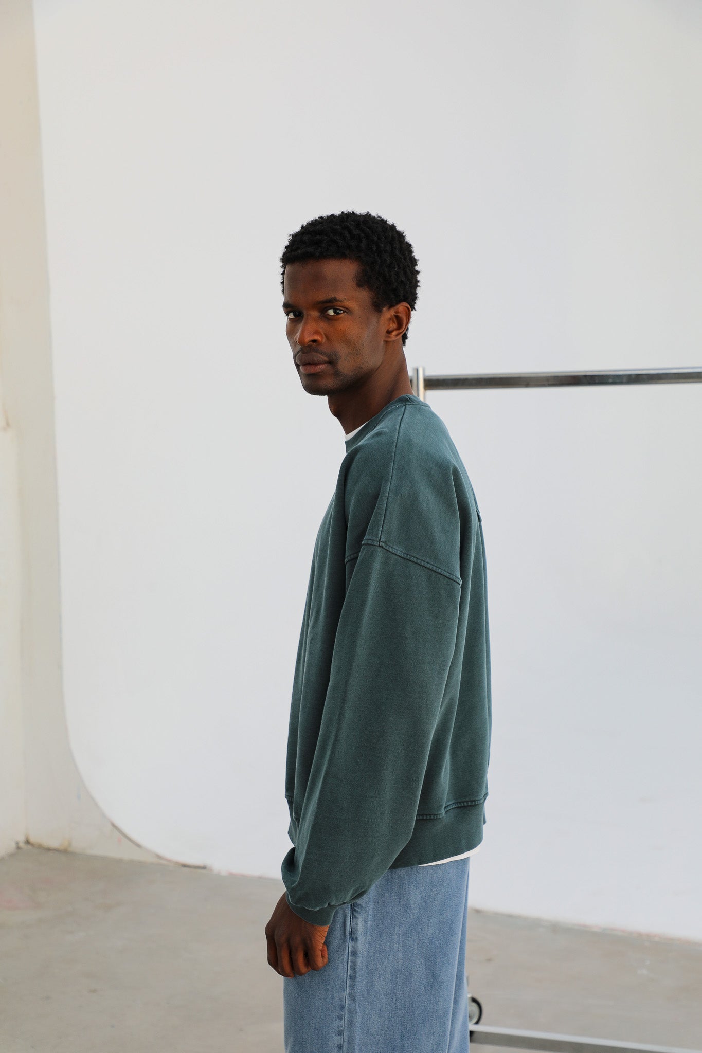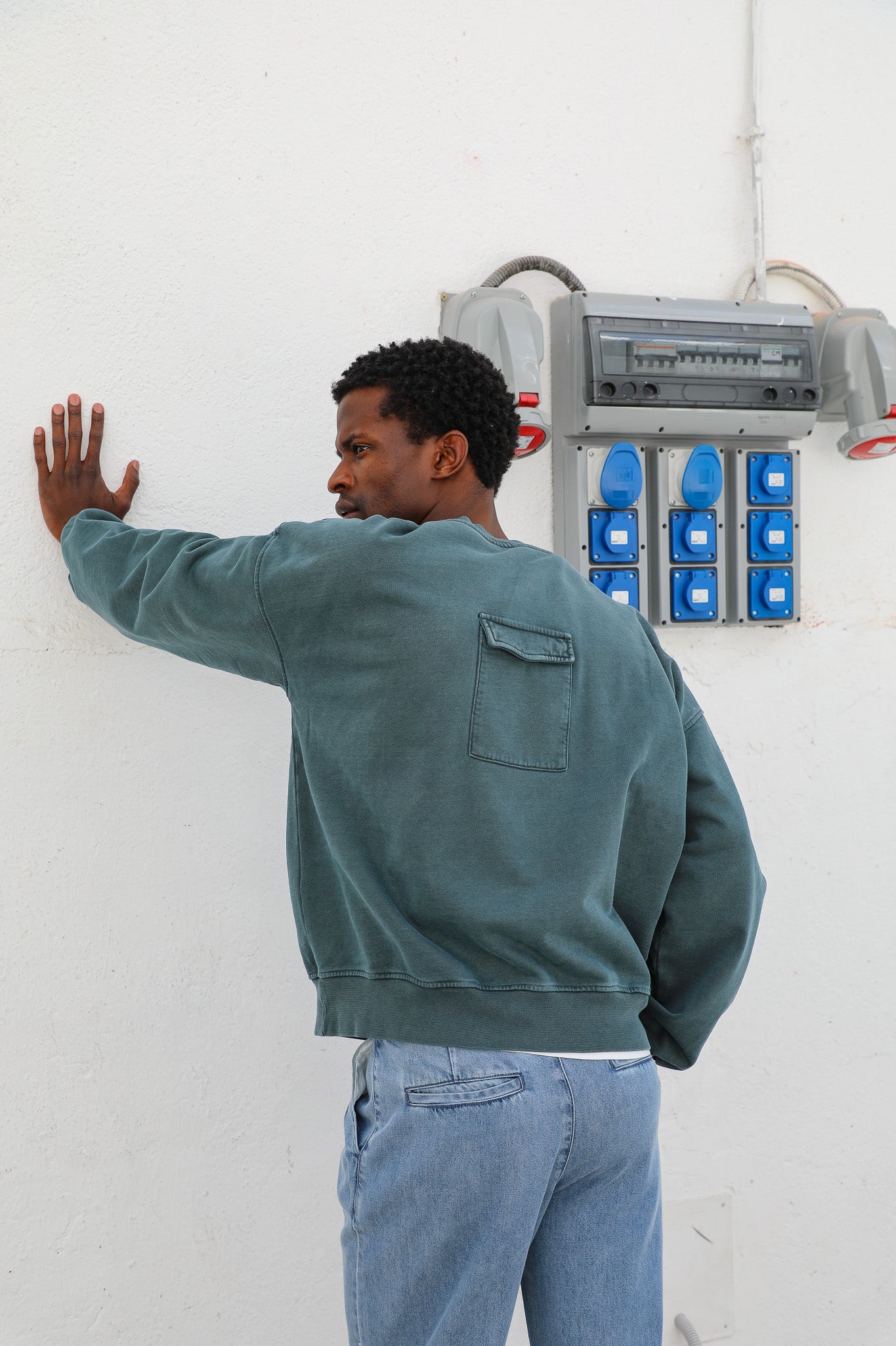Green long-sleeve sweatshirt featuring a classic round neckline and a unique pocket detail on the back.