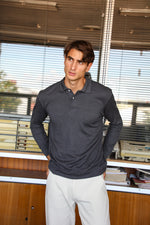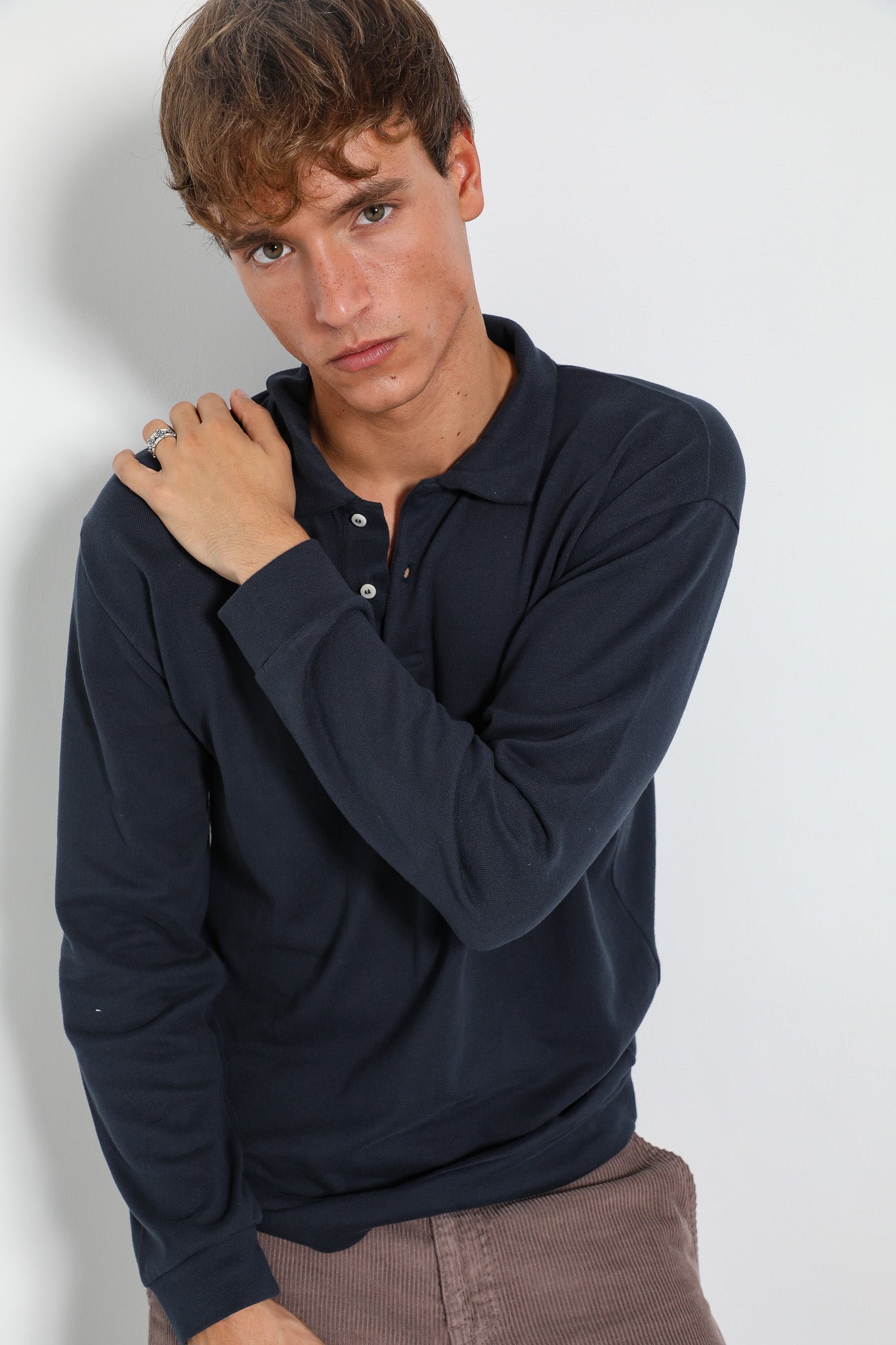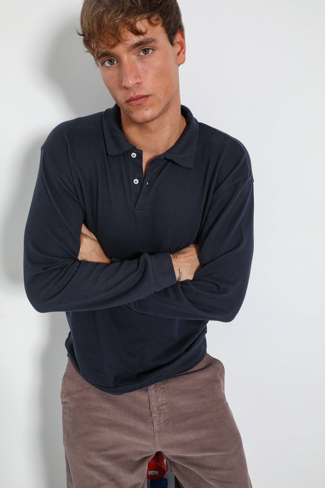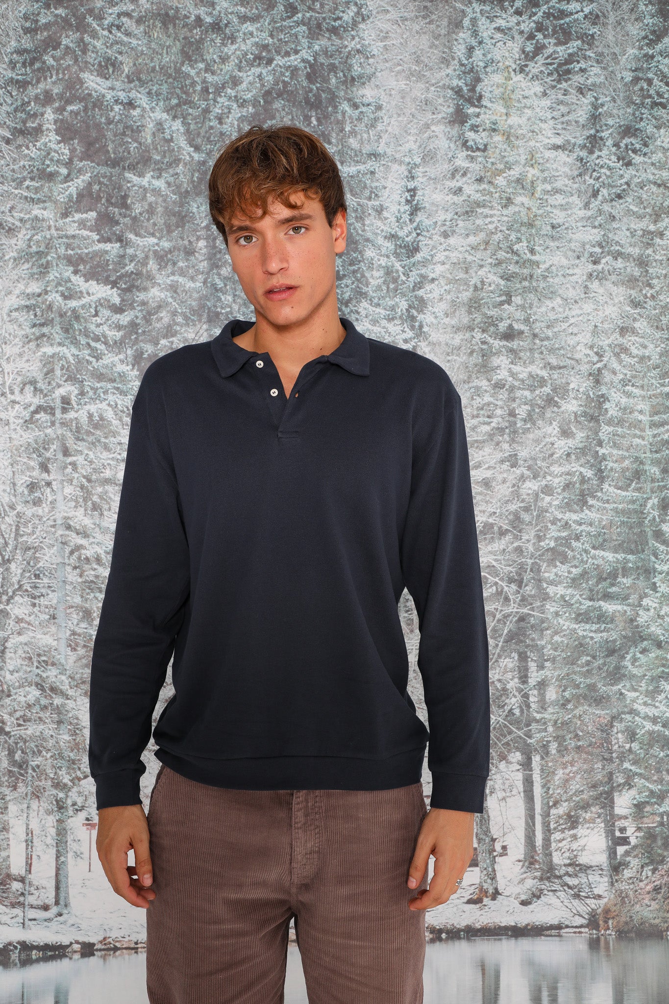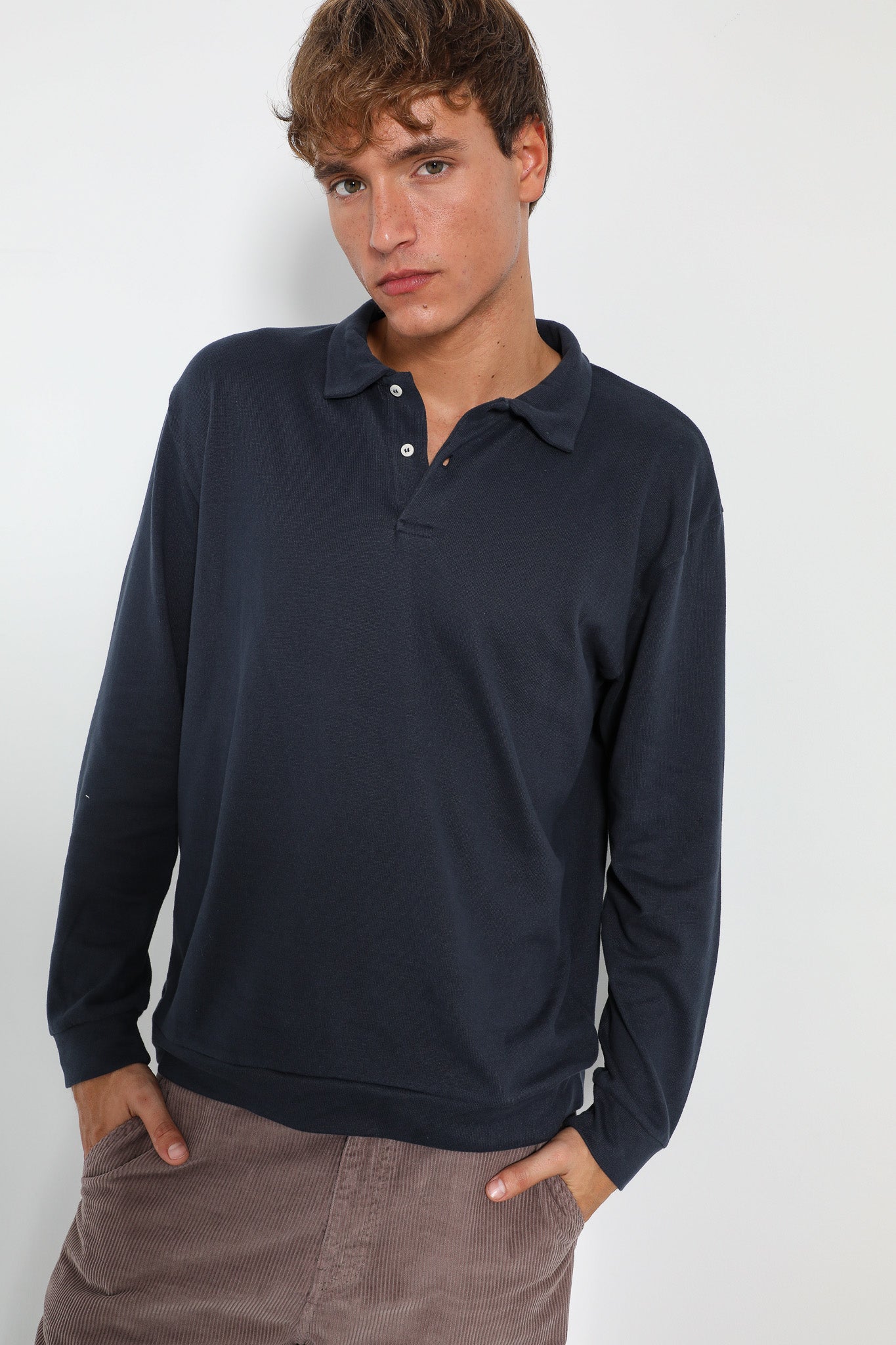 Navy long-sleeve polo sweater with buttons.