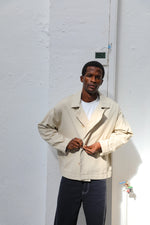 Green jacket featuring an asymmetric button closure and a modern, boxy fit.