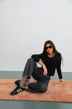 Black long sleeve t-shirt with contrast brown fabric around neck and wrists, a round neck and straight finish.