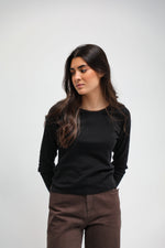 Black long sleeve t-shirt with contrast white fabric around neck and wrists, a round neck and straight finish.
