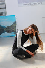 Three tone t-shirt in a combination of tones of blue and white, a round neck and short length finish.