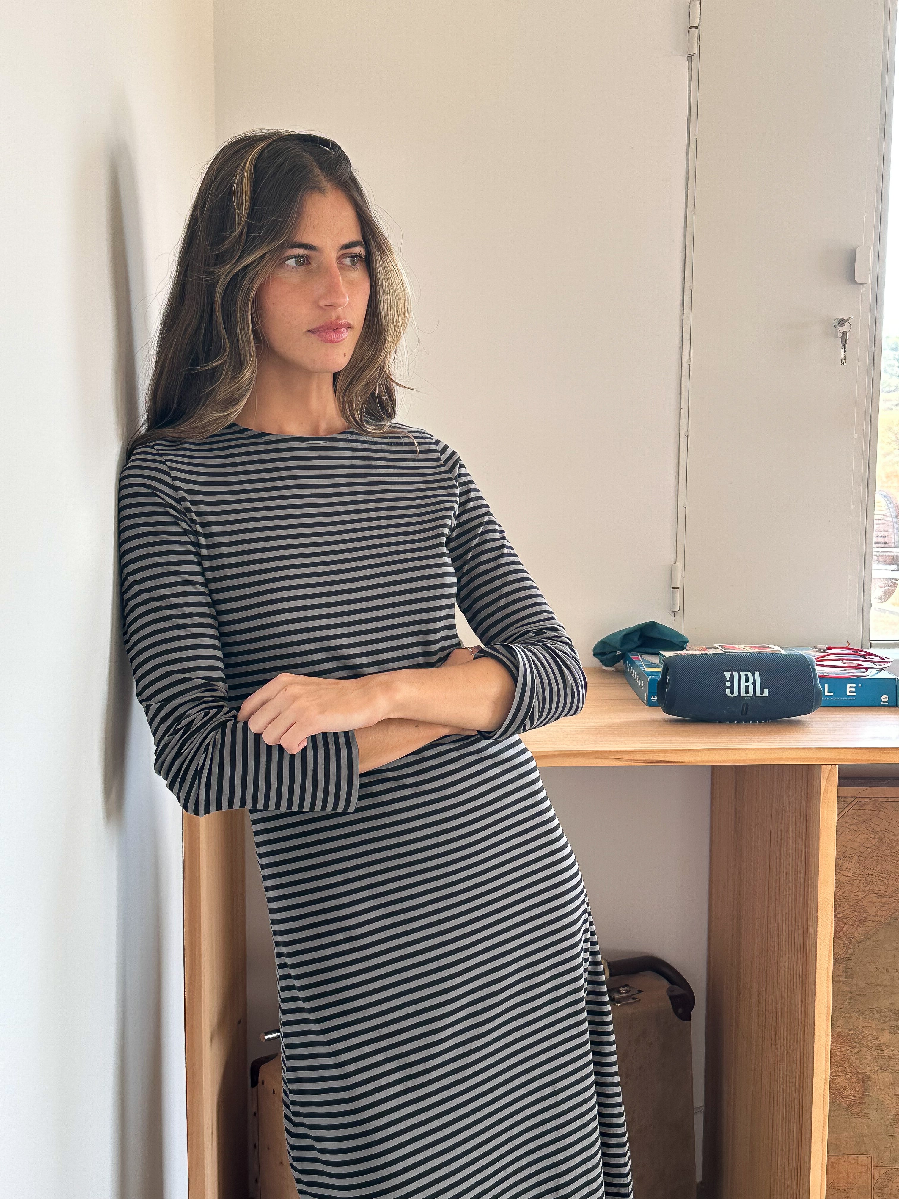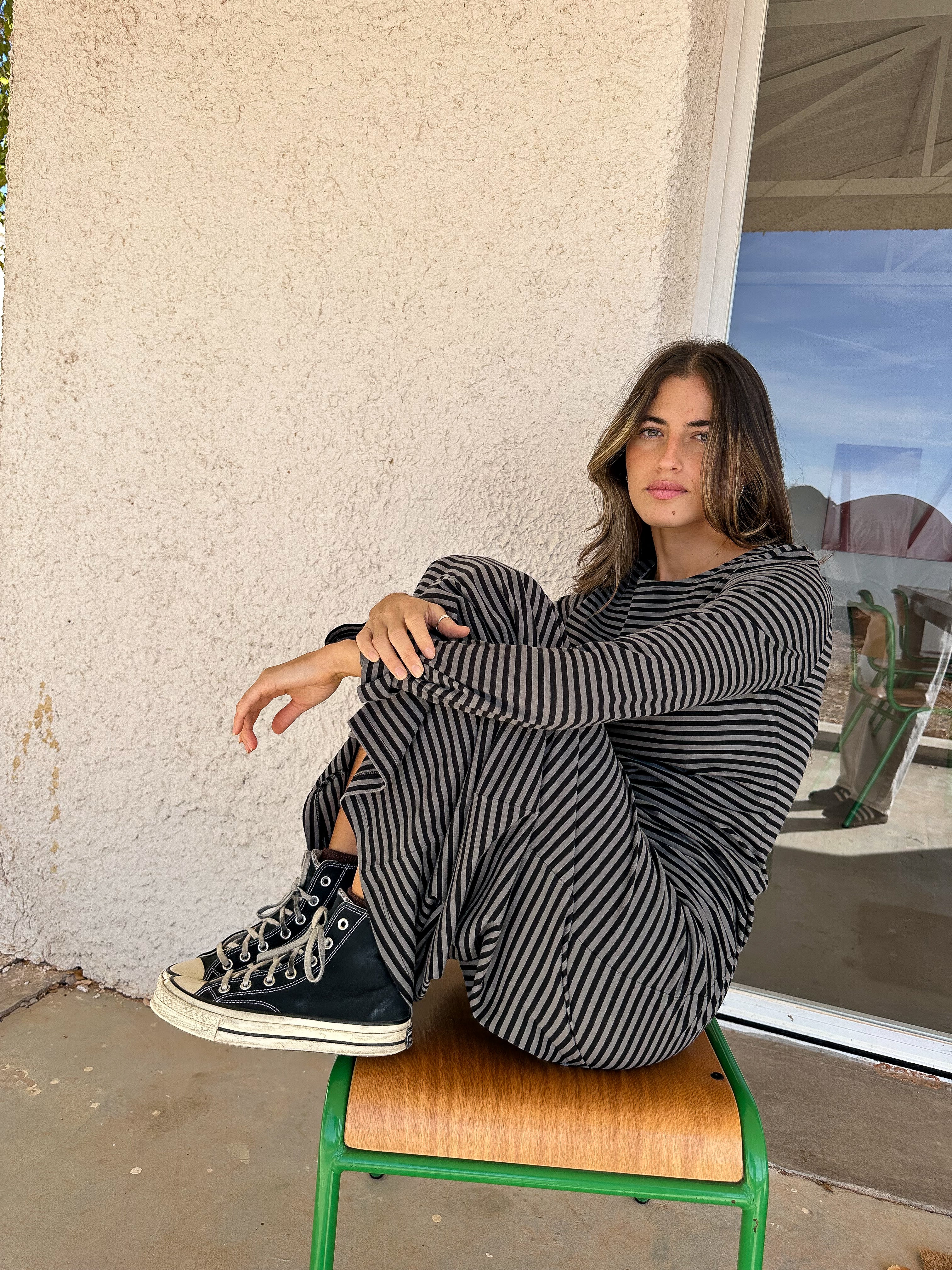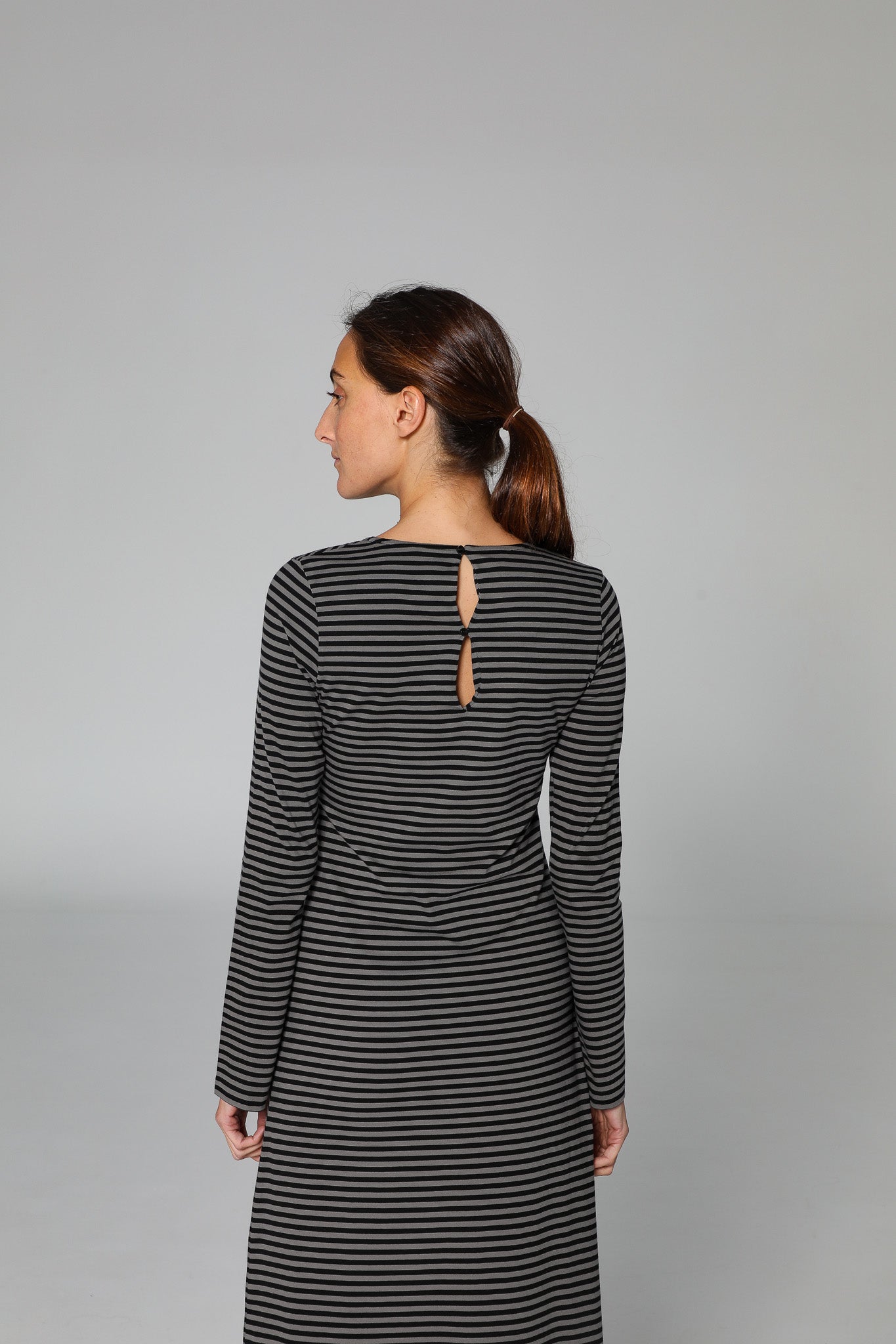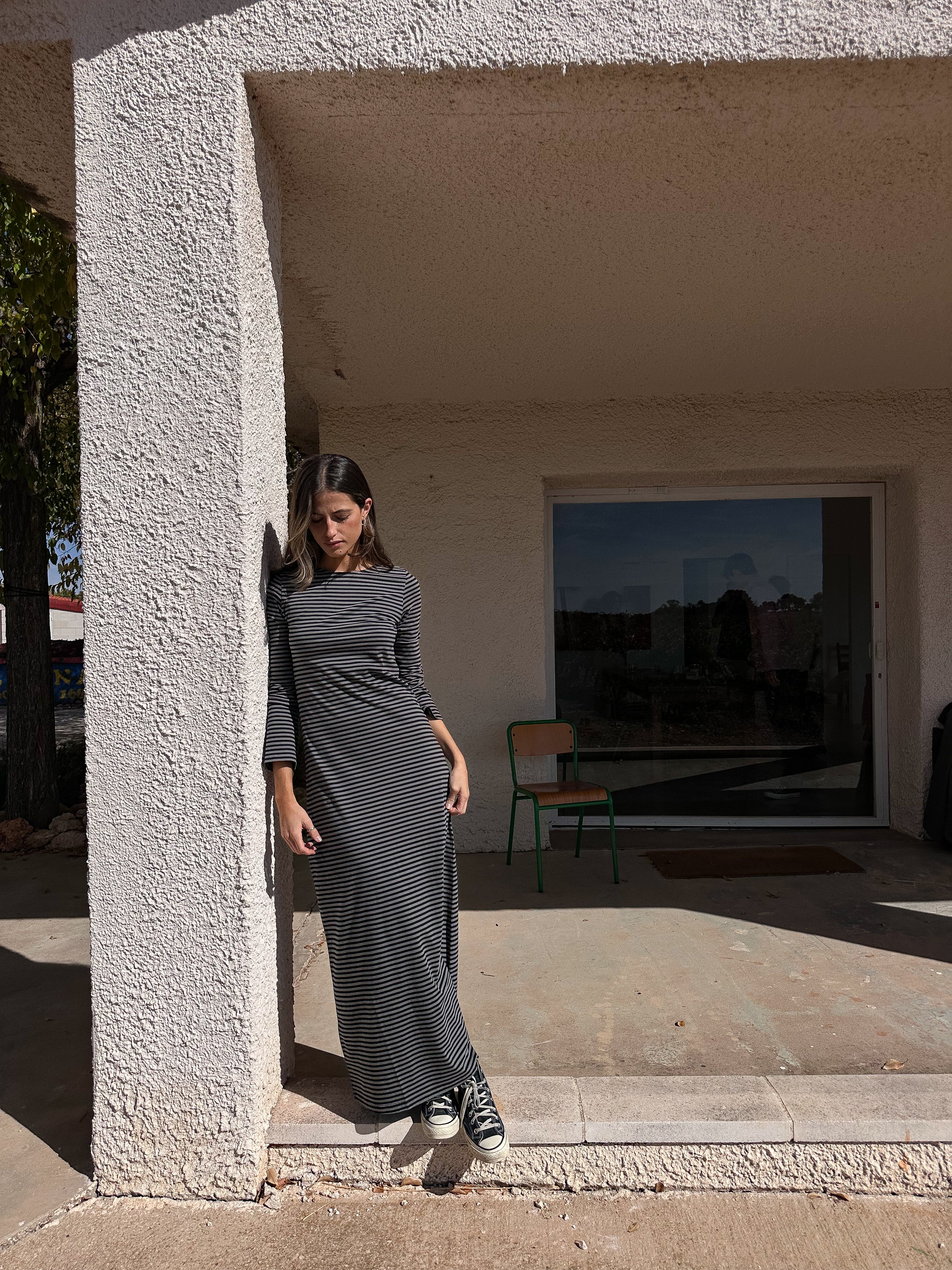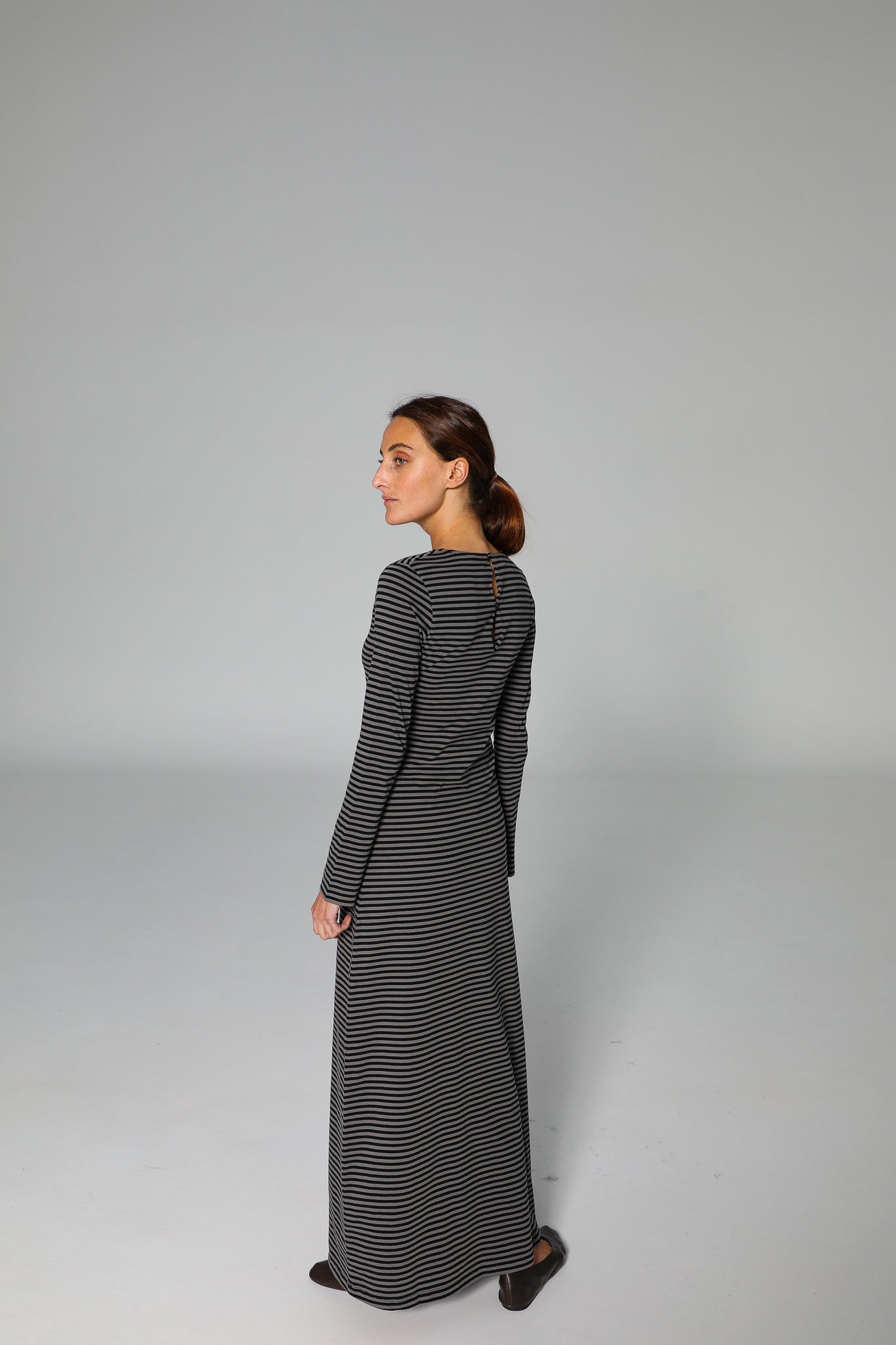 Long, soft dress with black and grey stripes. The flowing design adds a touch of elegance, perfect for both casual and dressy occasions.