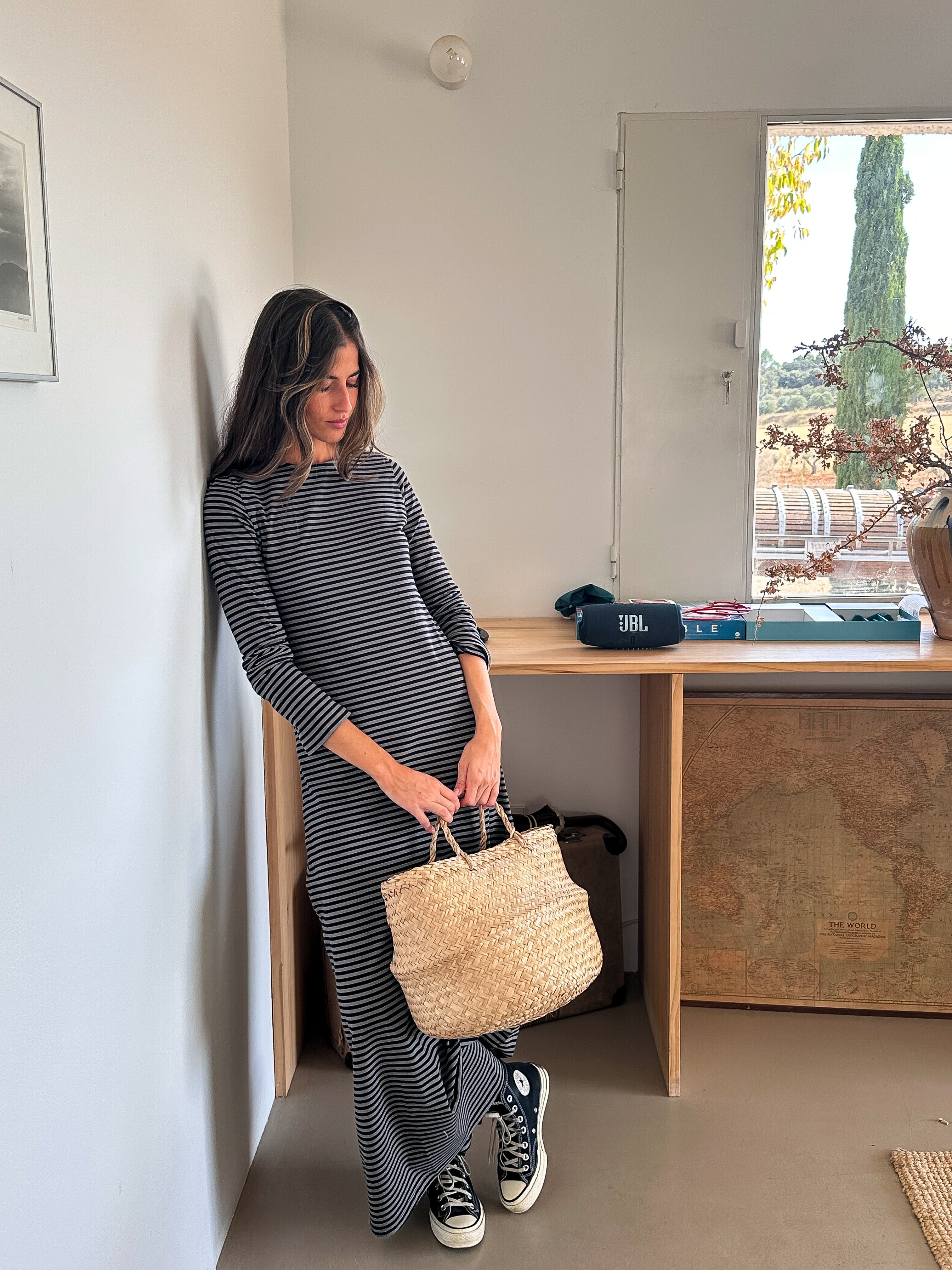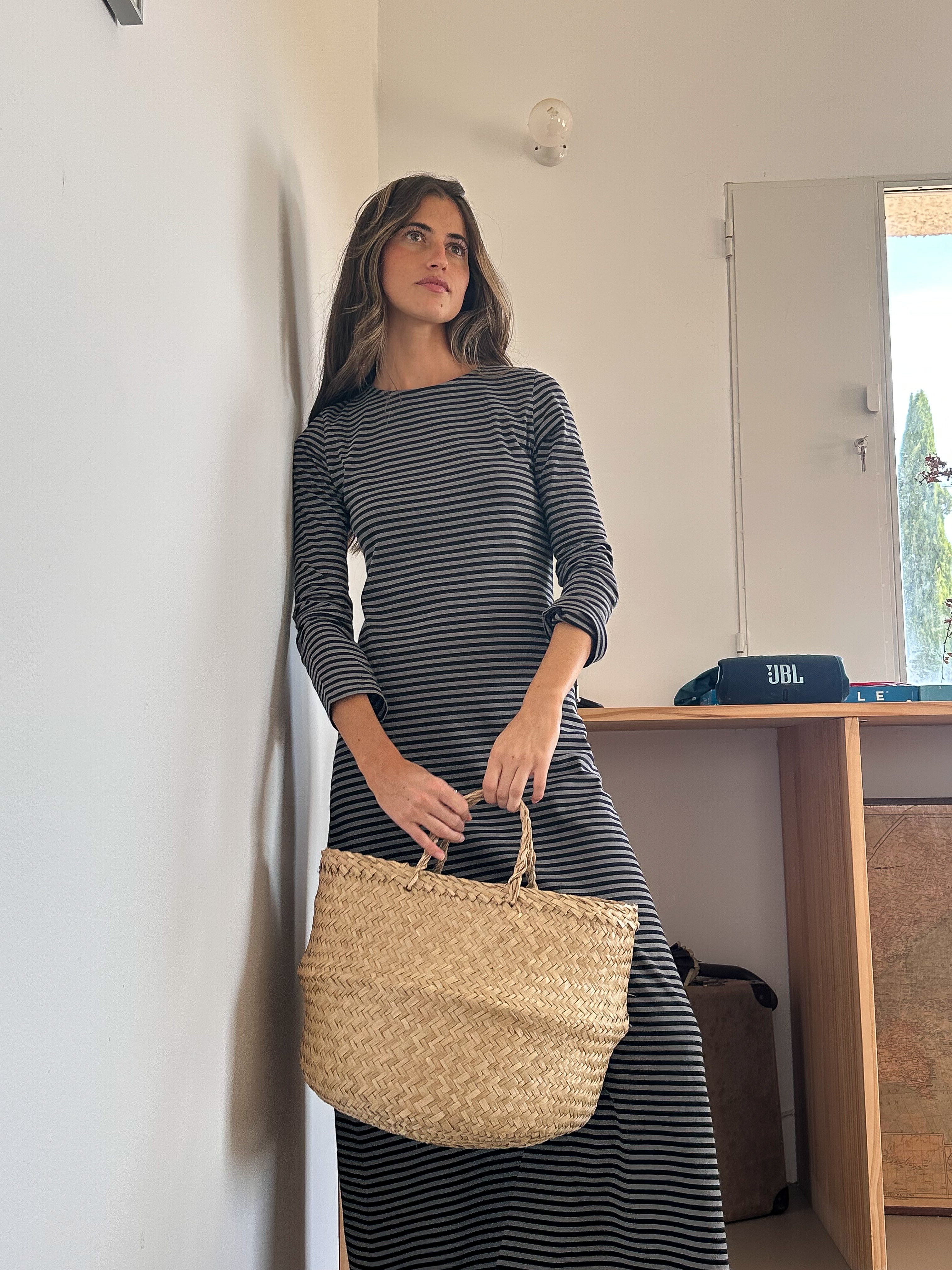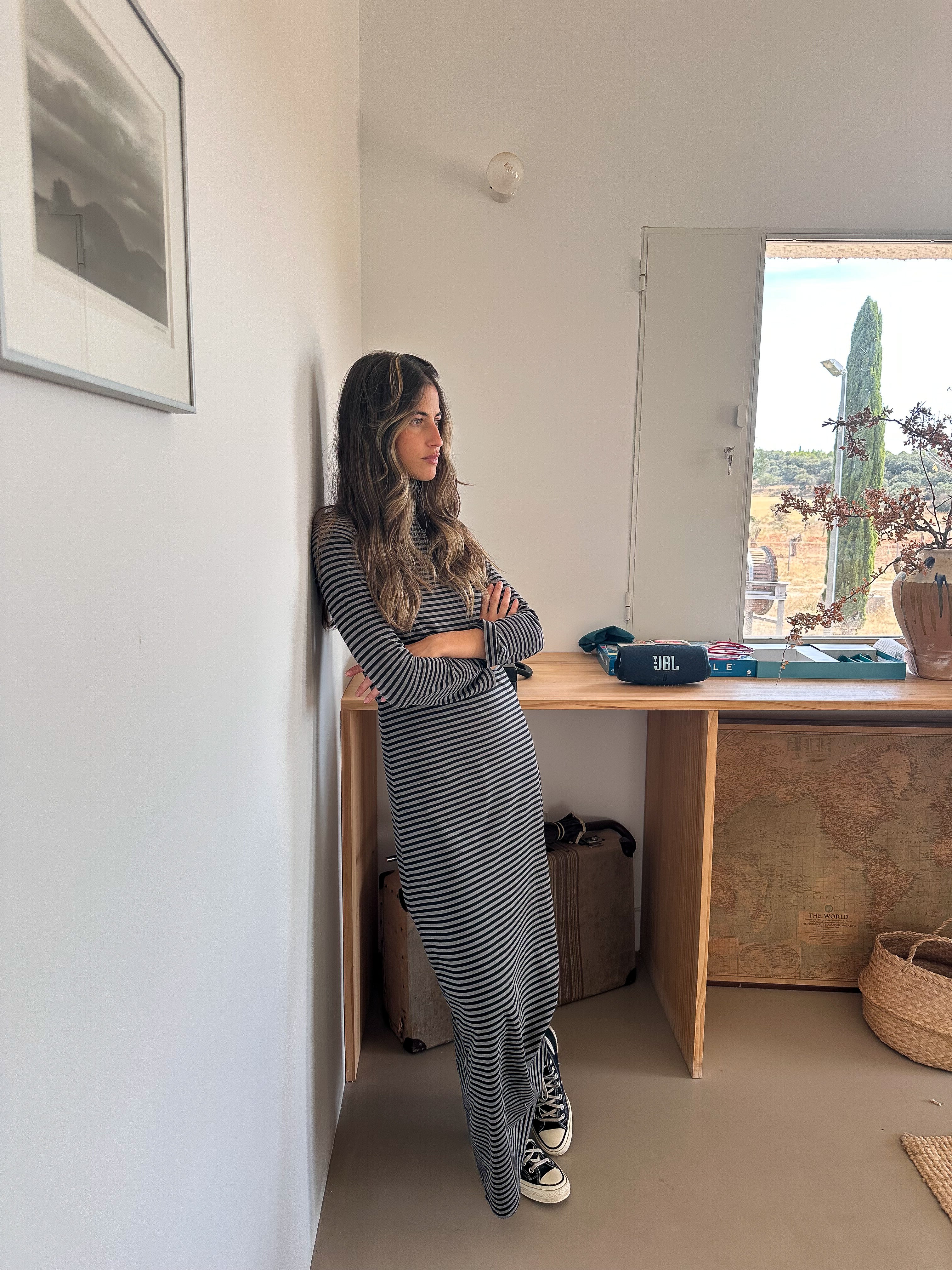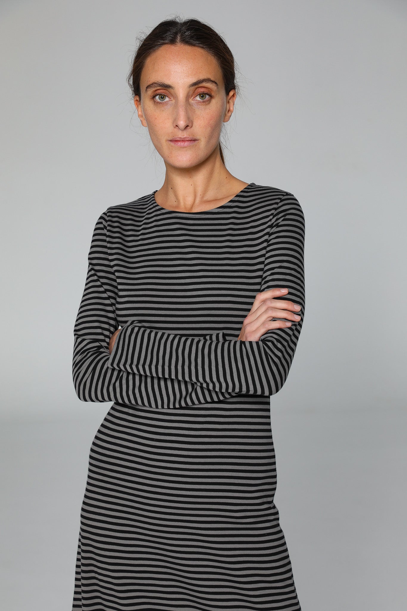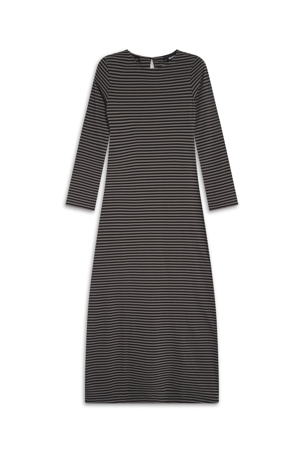 Long, soft dress with black and grey stripes. The flowing design adds a touch of elegance, perfect for both casual and dressy occasions.