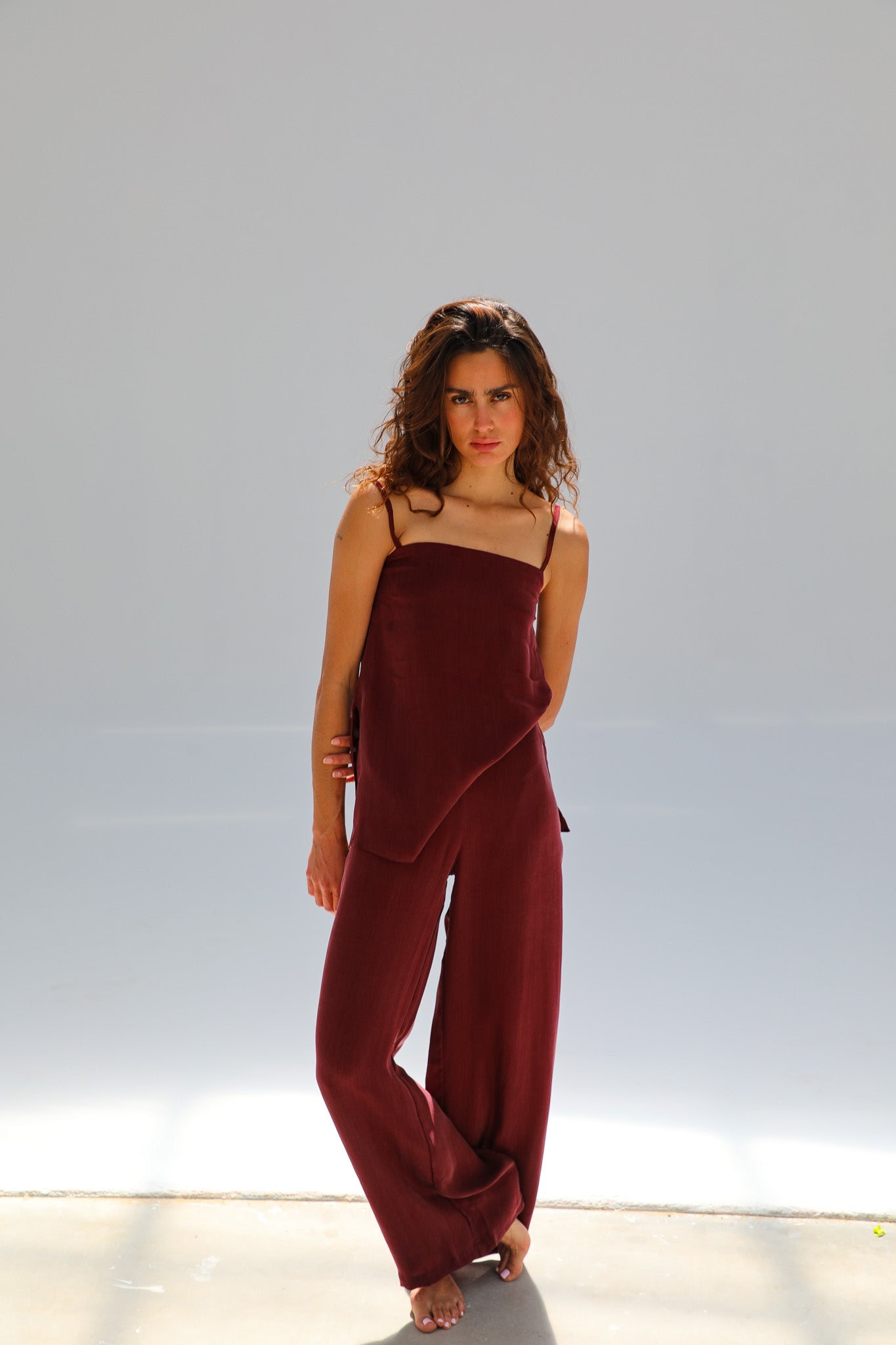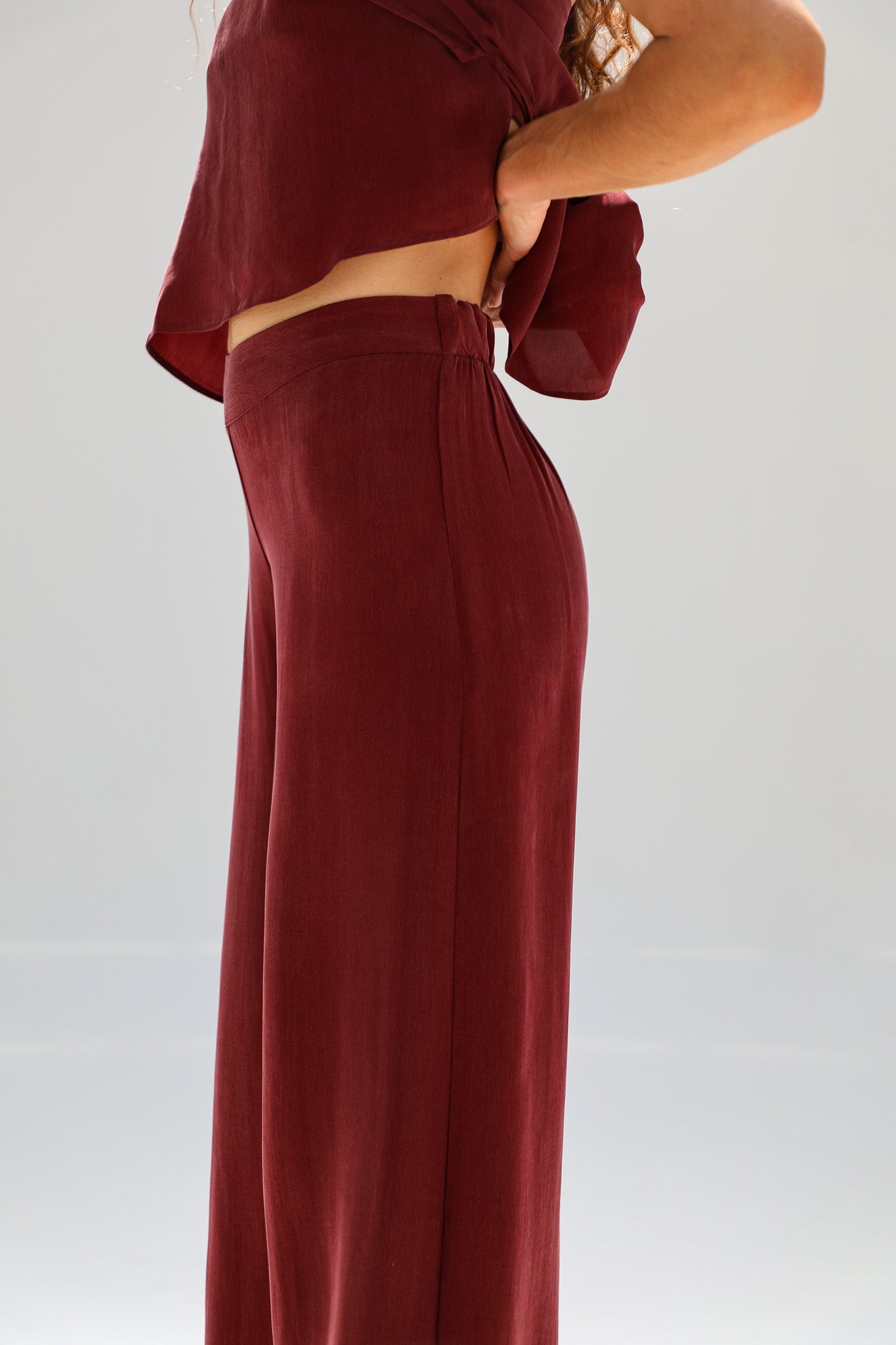 High-waisted wide-leg pants in burgundy cupro-silk, featuring a fluid drape and a discreet side zip closure. Complete the look with both the Laces Cupro Top Burgundy or the Thin Straps Cupro Top Burgundy.