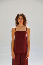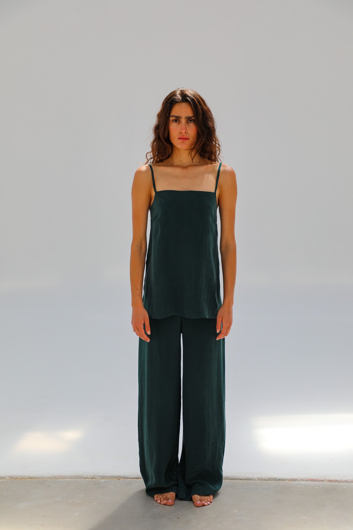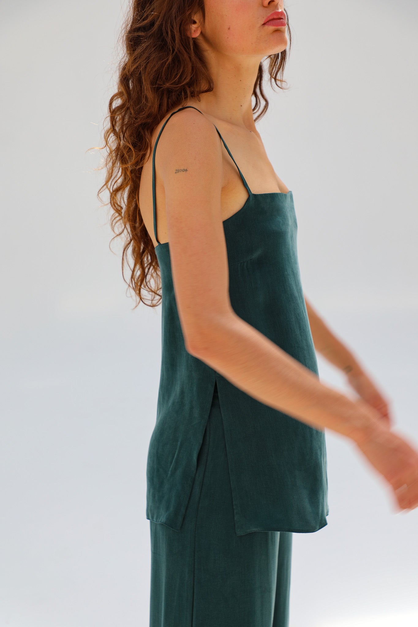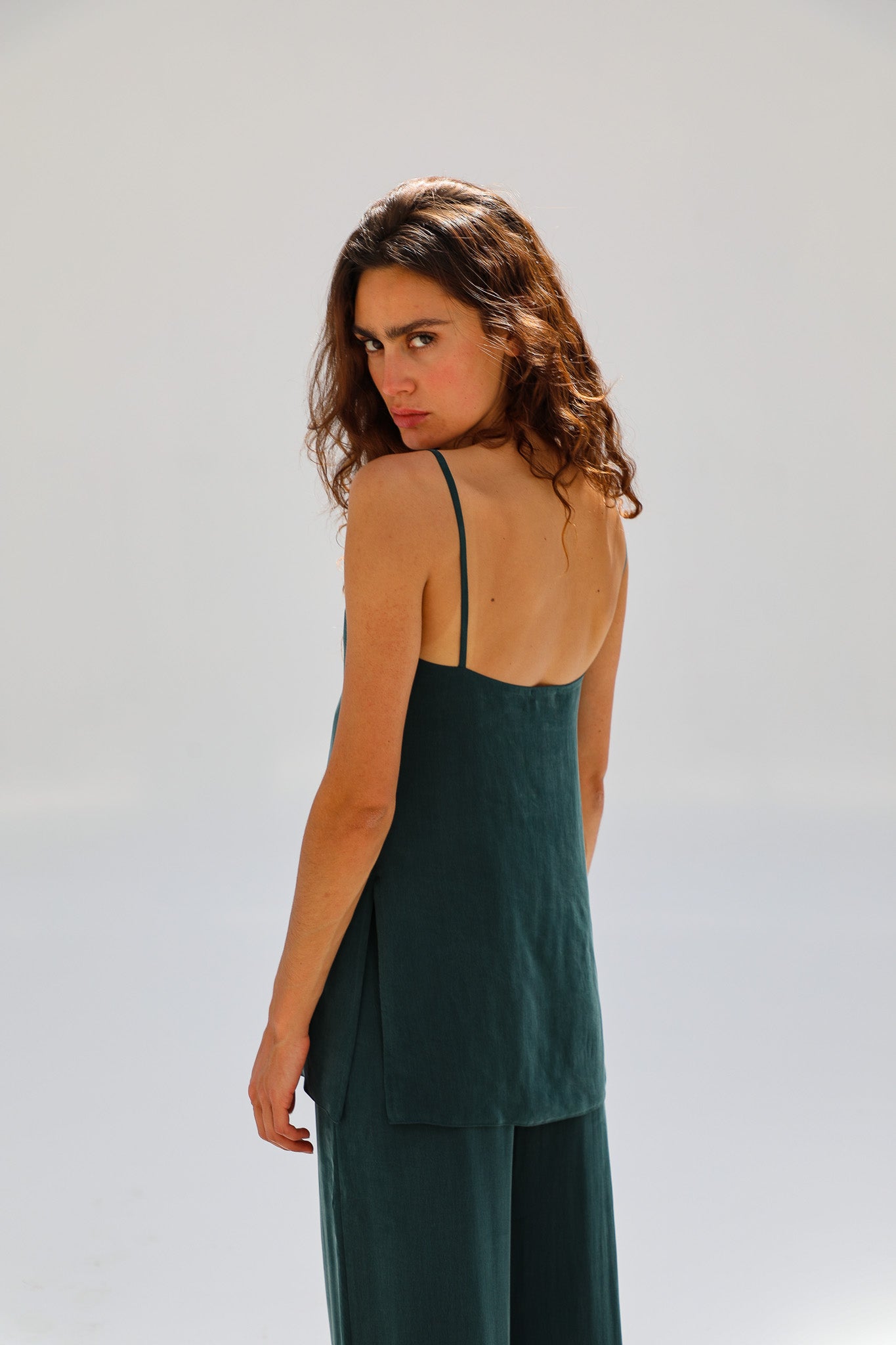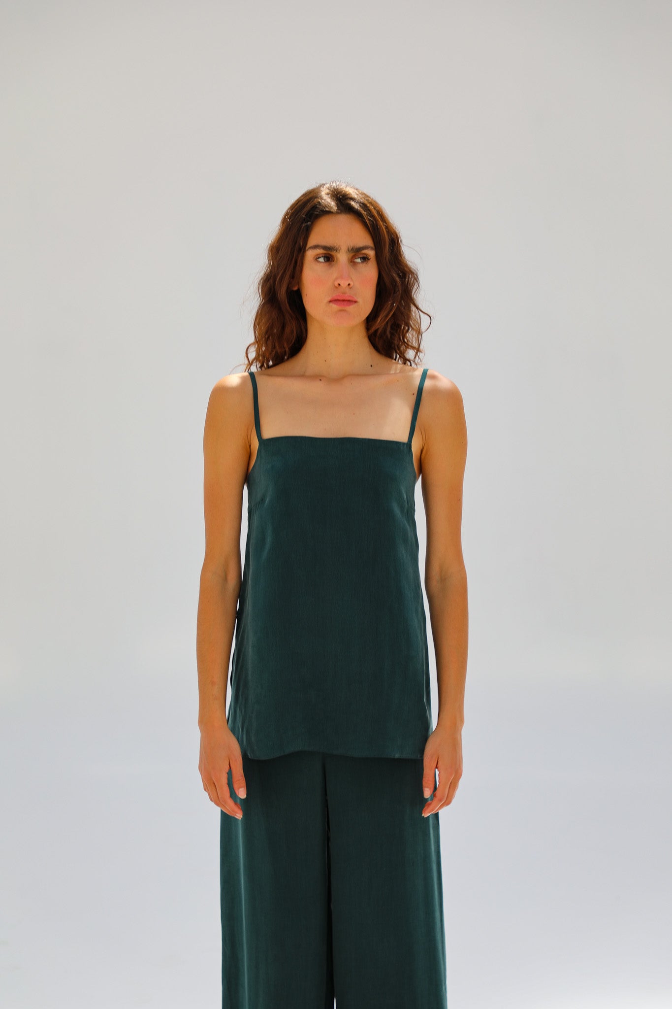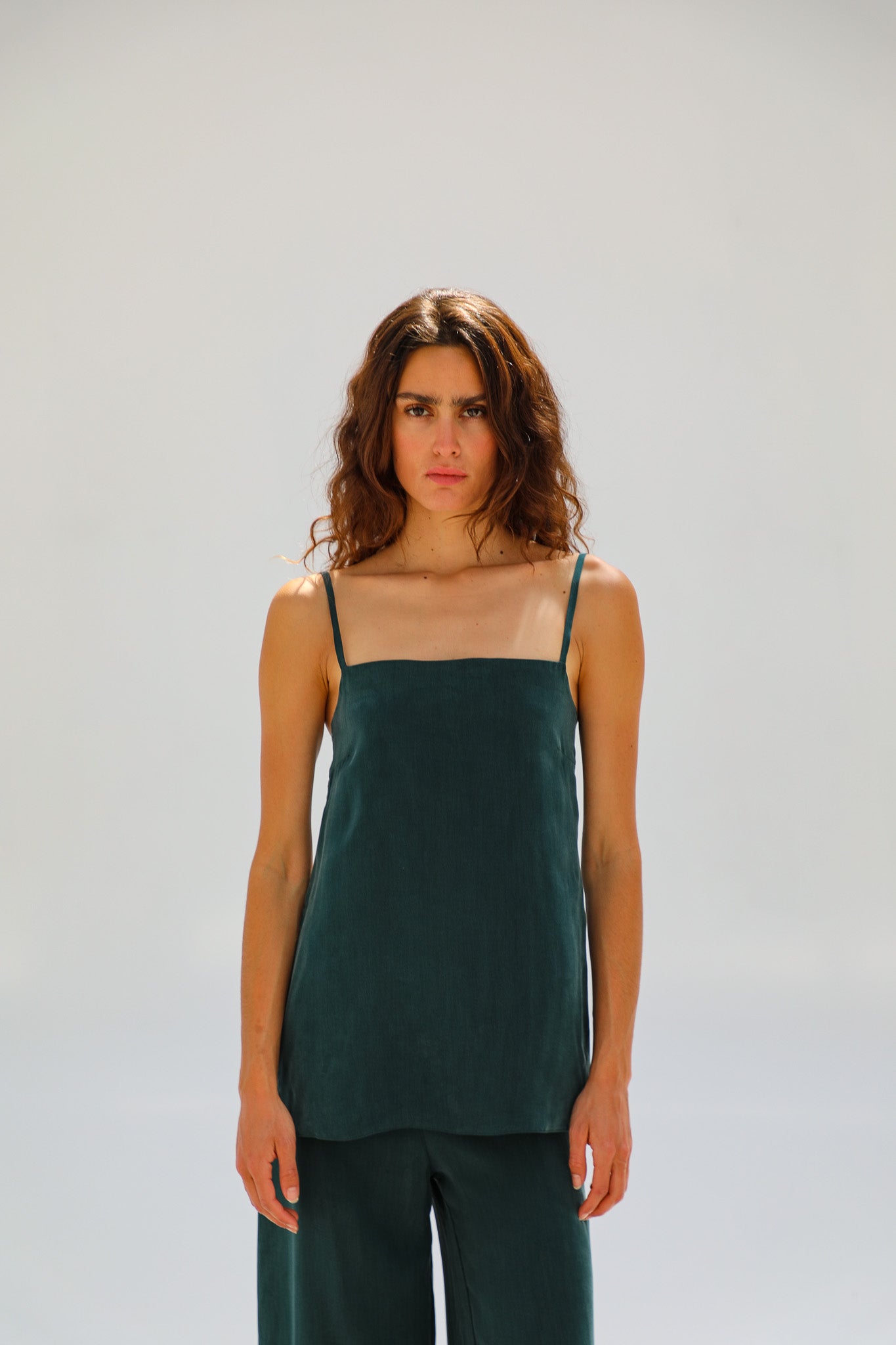 Green cupro-silk top with thin straps, a clean square neckline, and subtle side slits at the hem for an elegant, modern silhouette. Complete the look with the Flow Cupro Silk Pants Green.