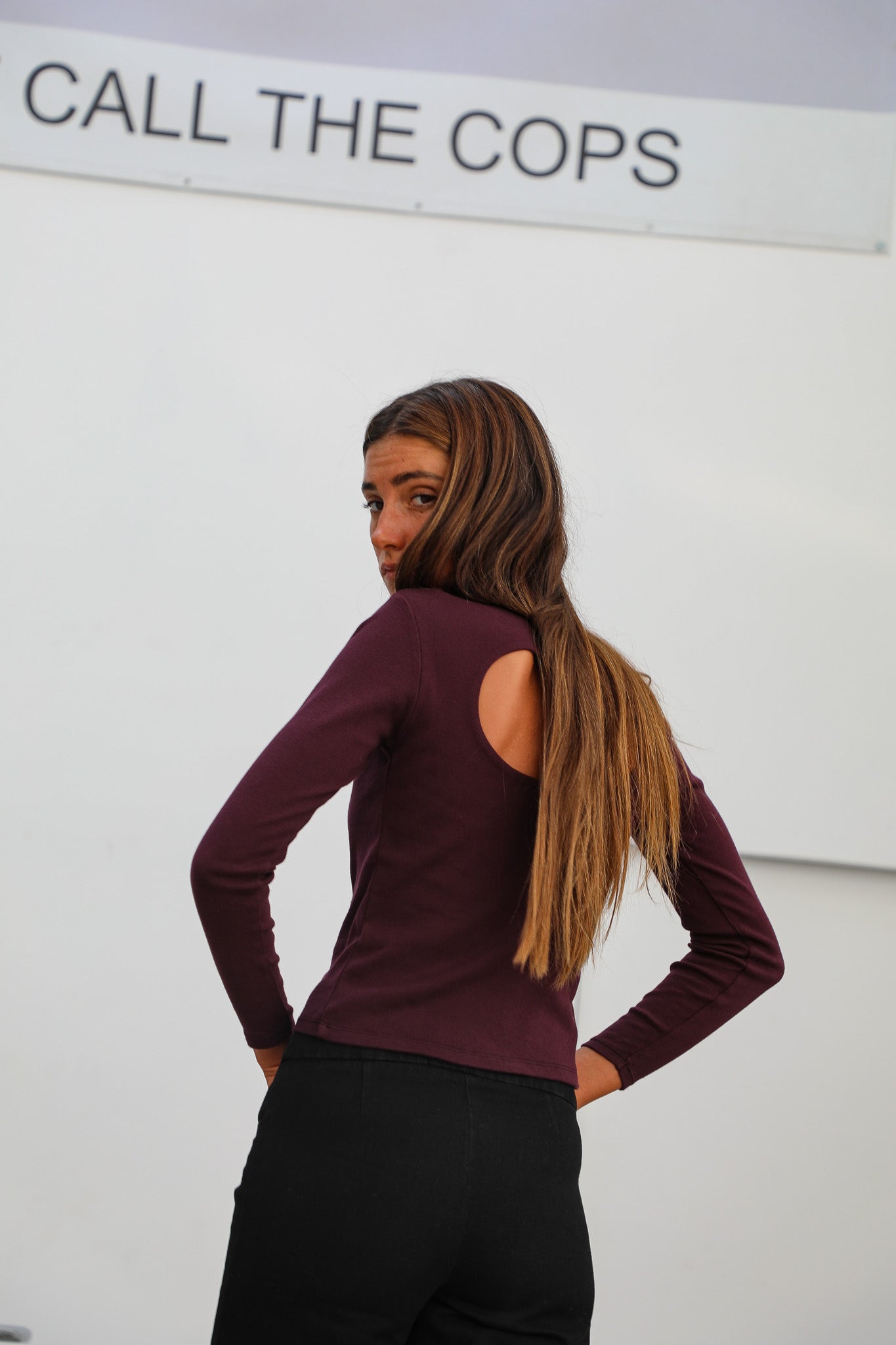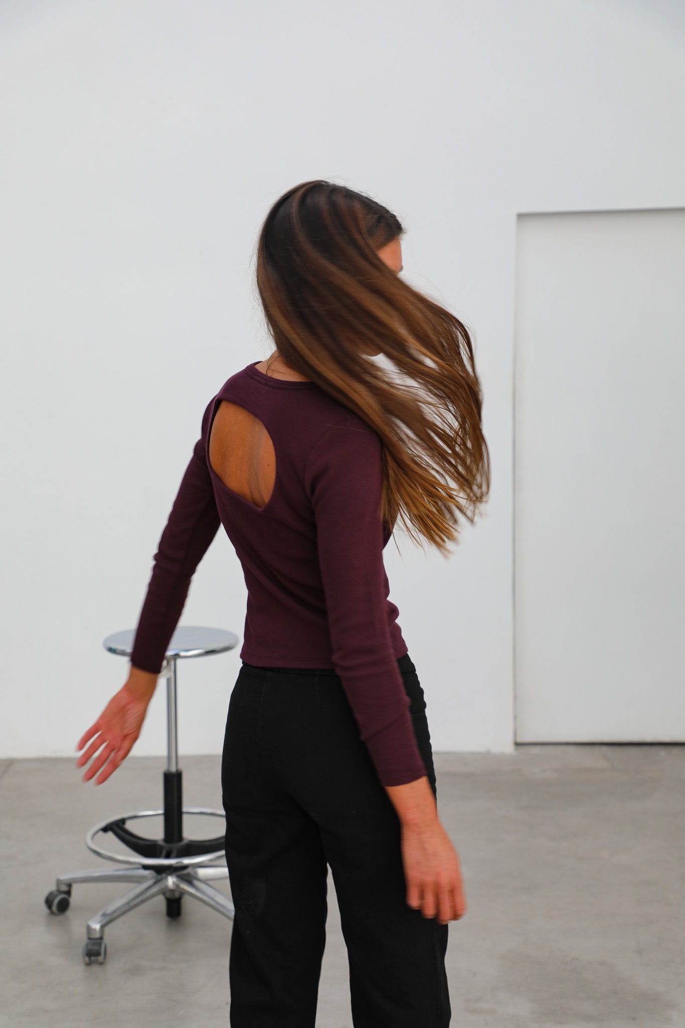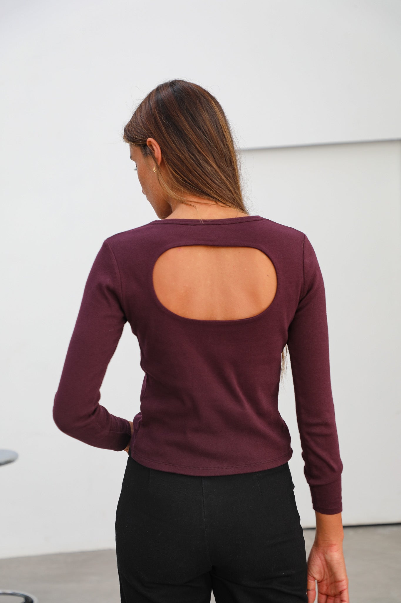 Burgundy long sleeve t-shirt featuring a unique open back detail.
