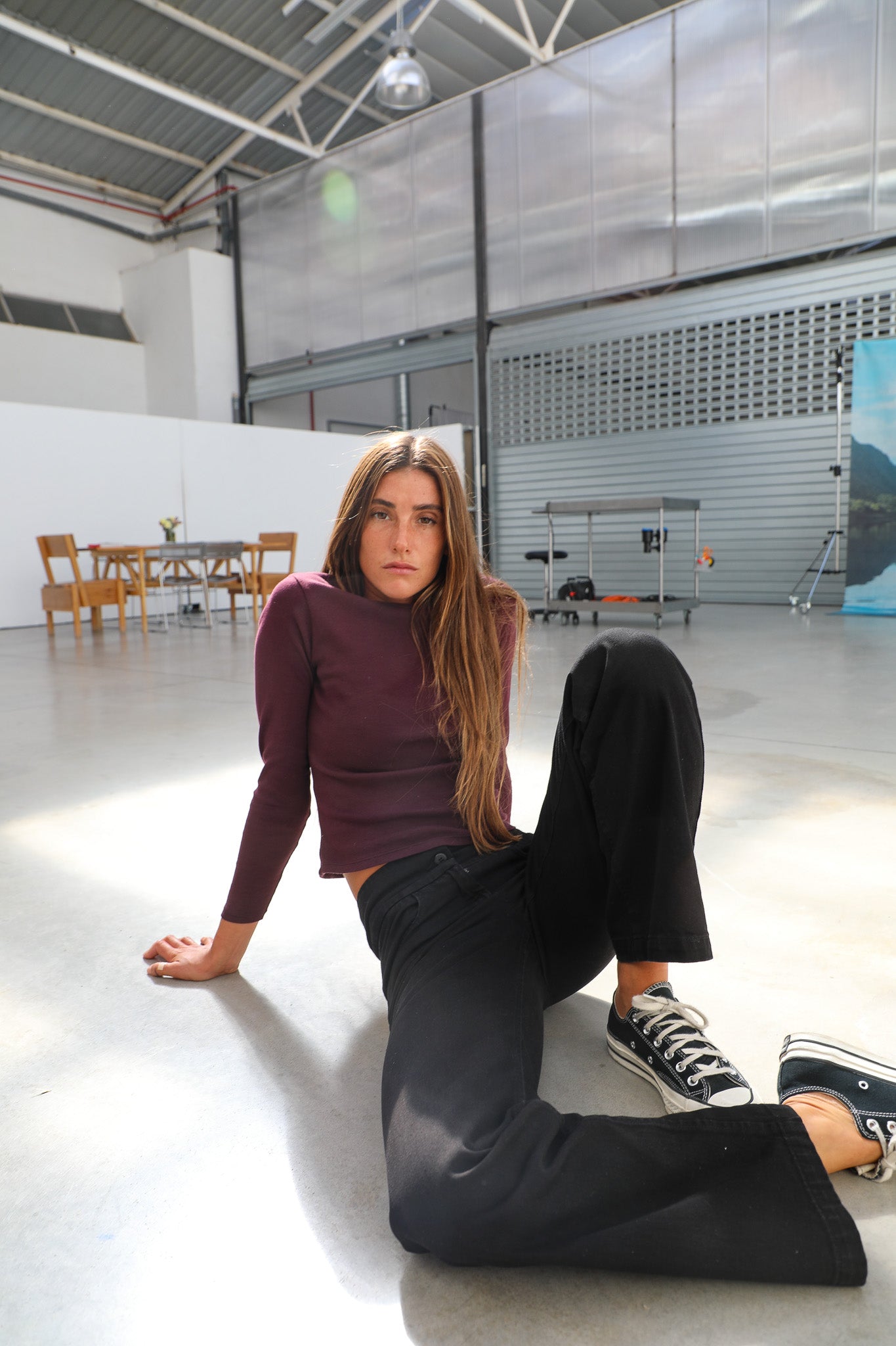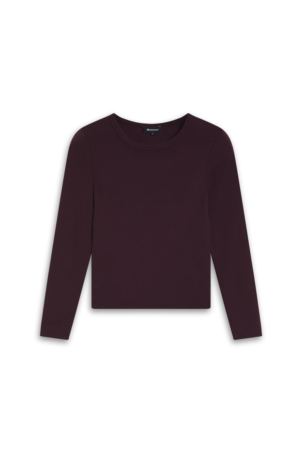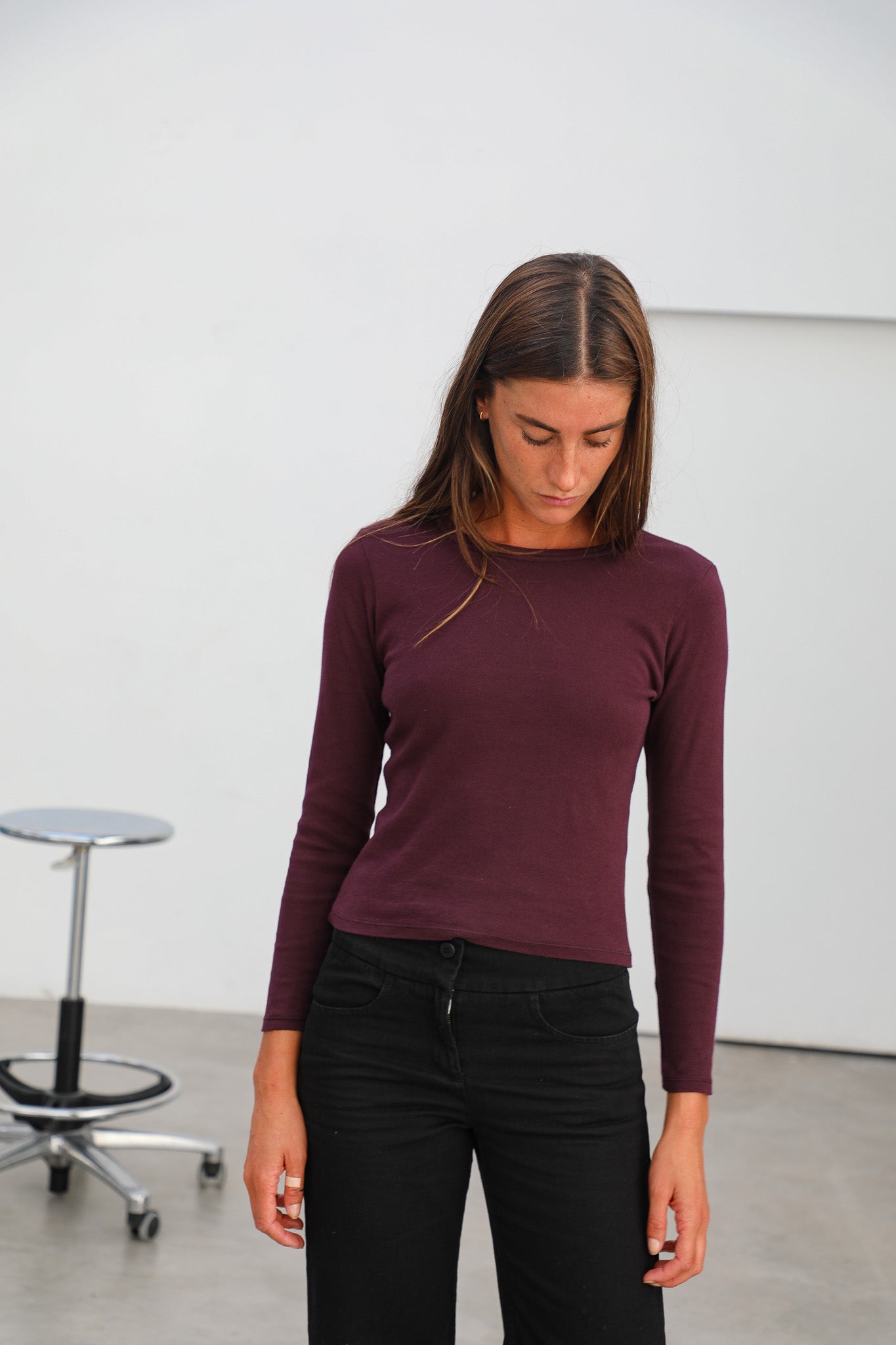 Burgundy long sleeve t-shirt featuring a unique open back detail.