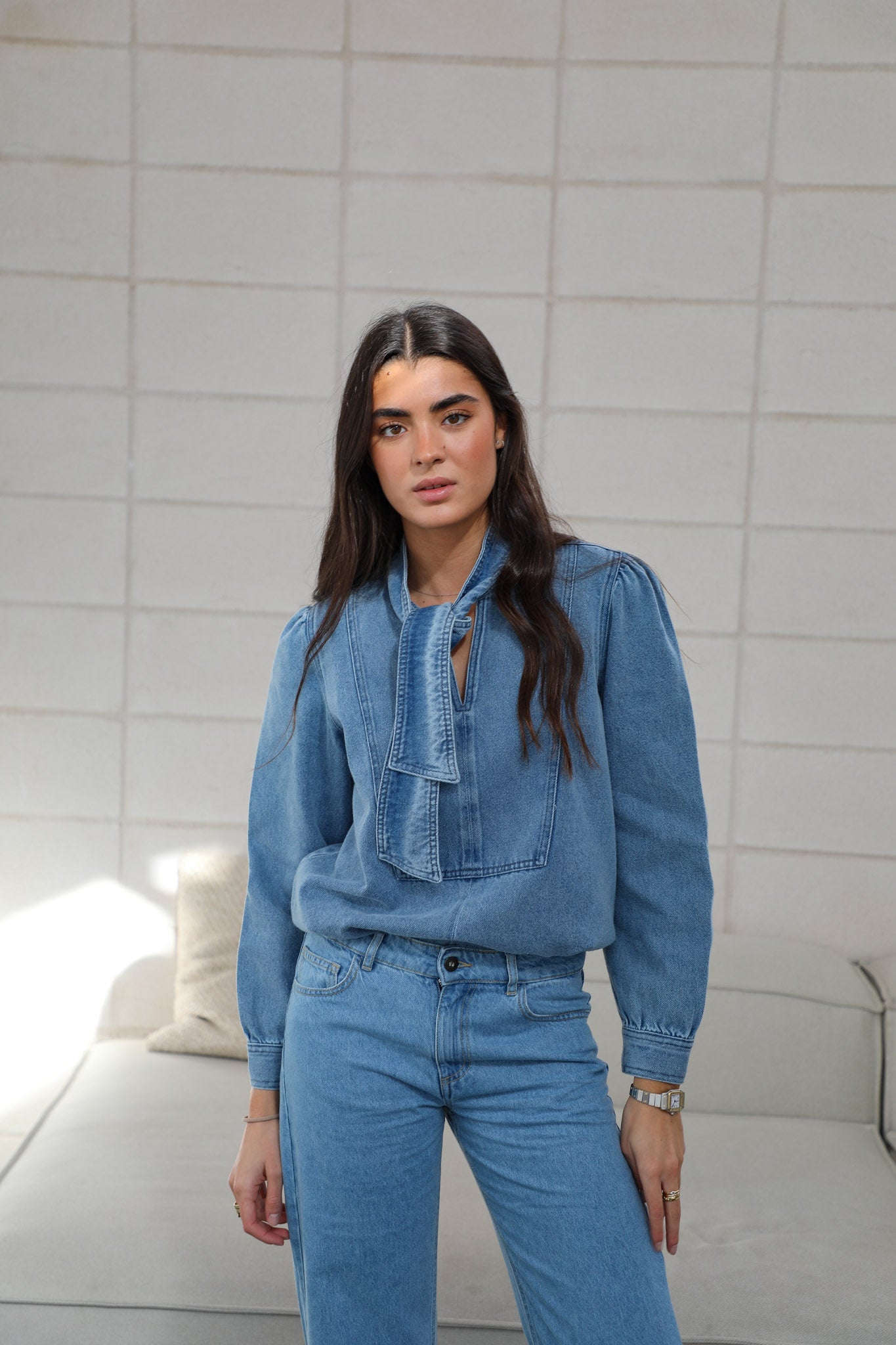 Denim blouse featuring an elegant tie detail around the neck, adding a touch of sophistication to the casual denim fabric. The versatile design makes it perfect for both casual and more polished looks.