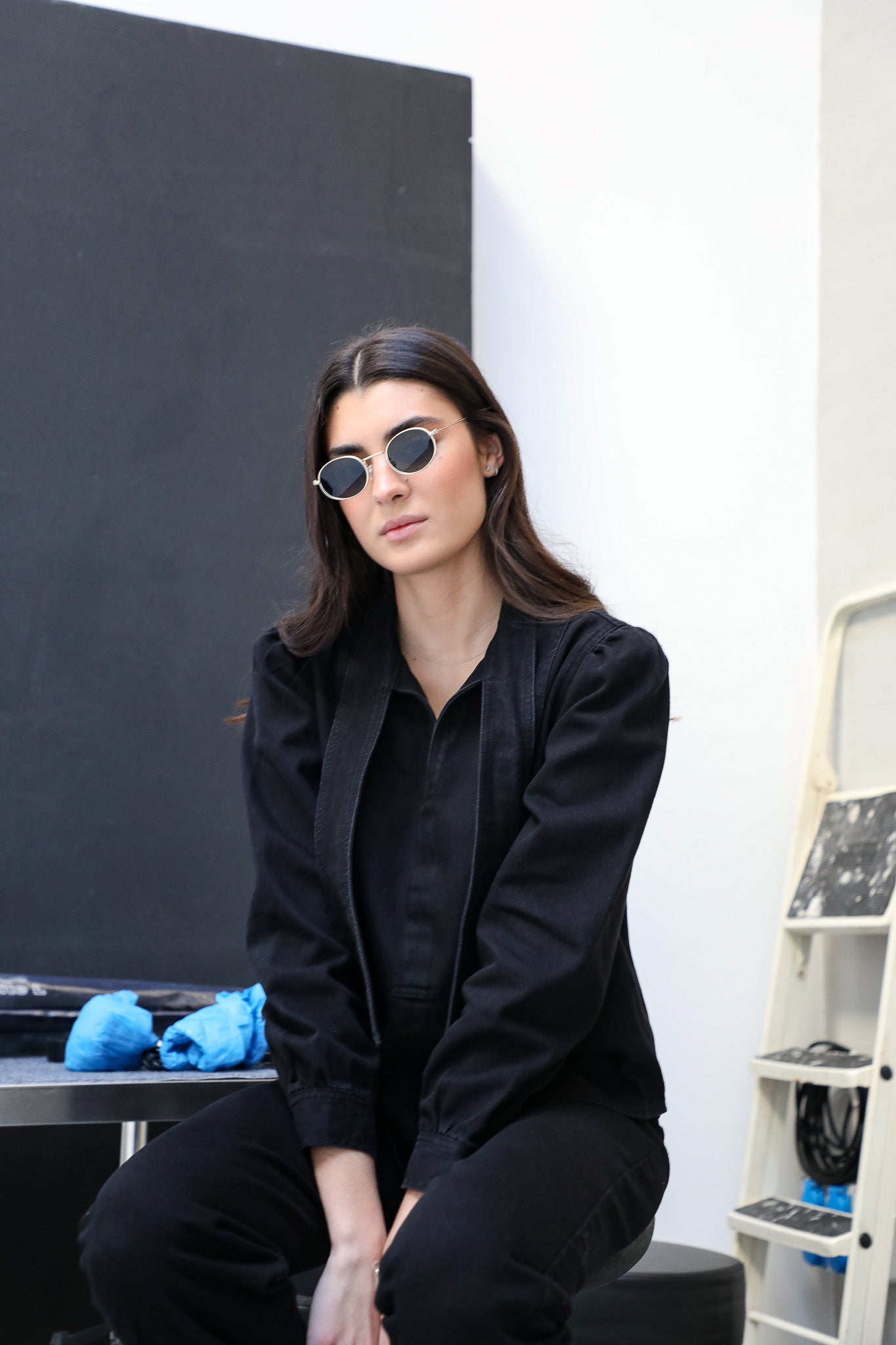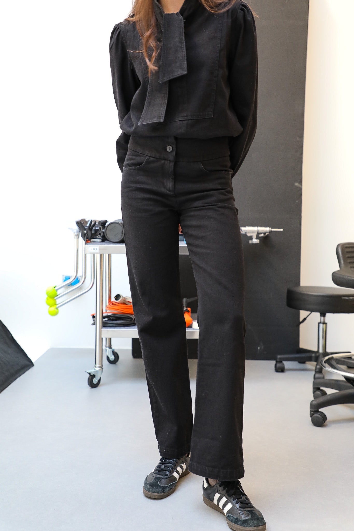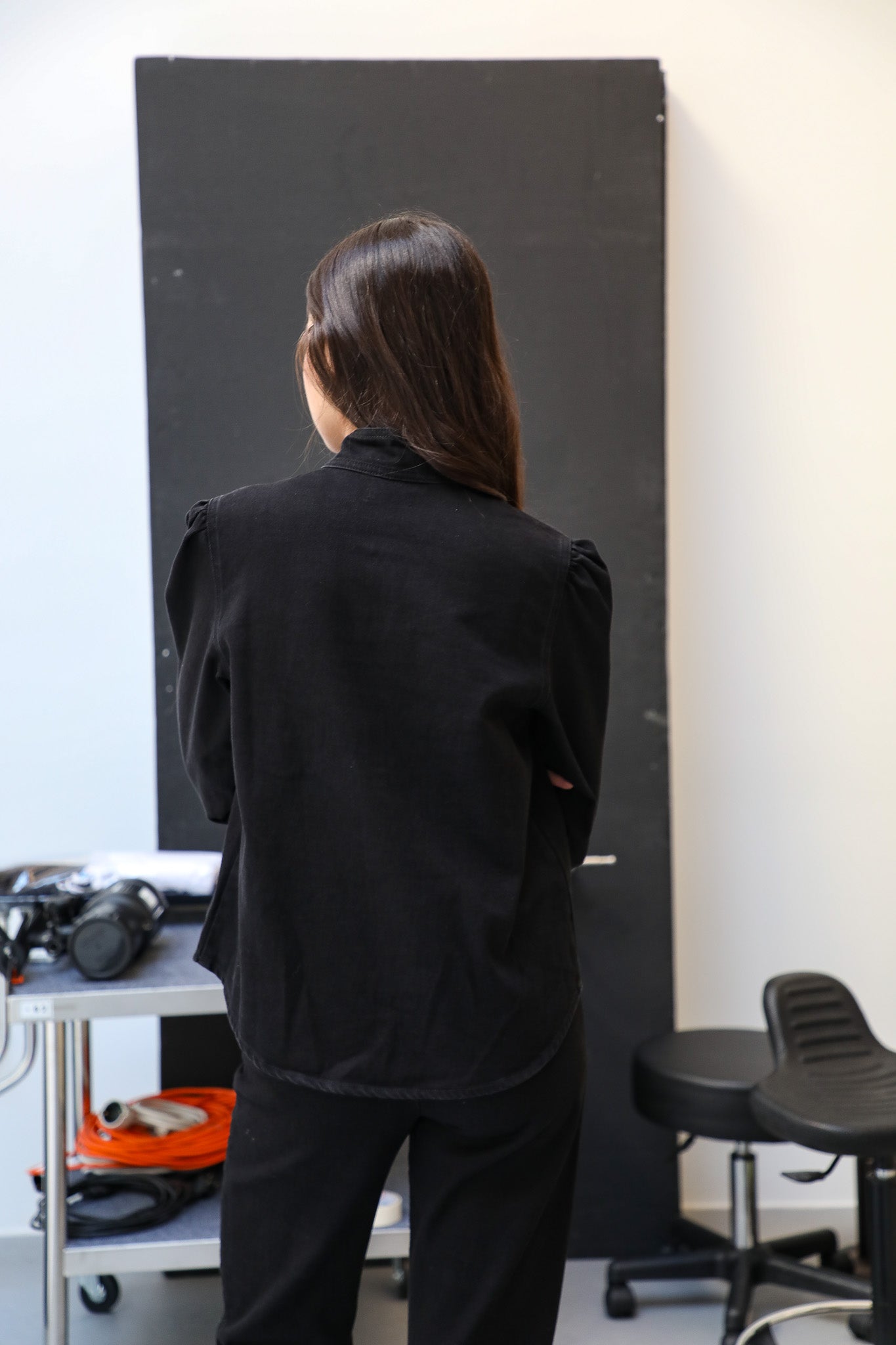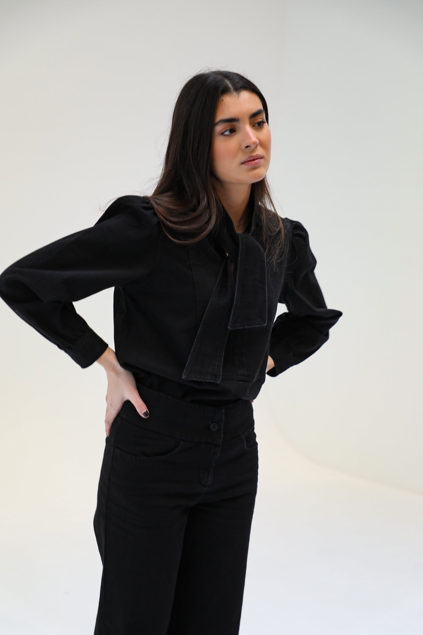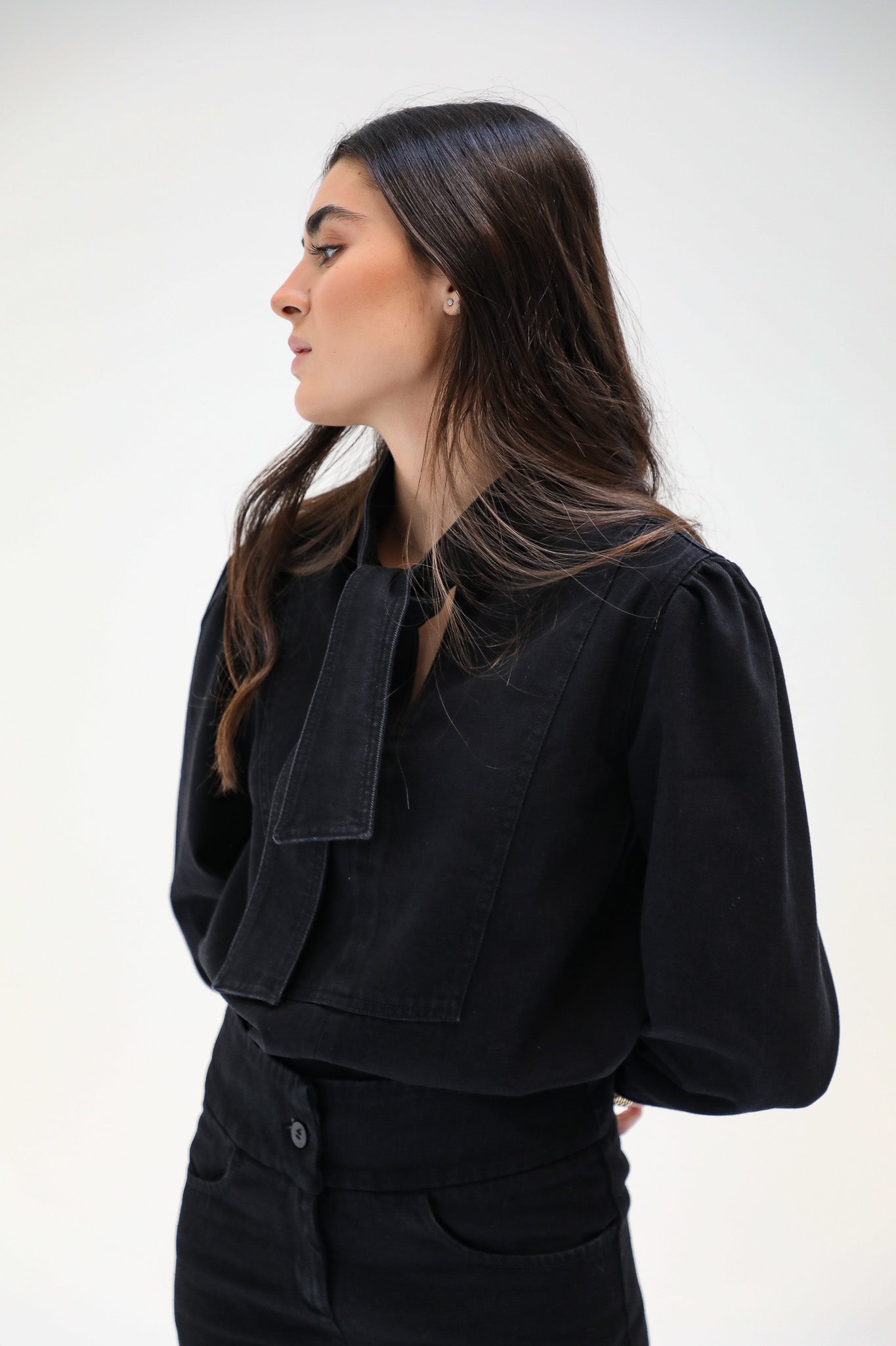 Denim blouse with a lace detail around the neck and a puffer shoulder detail to give volumen and elegance to the garment.