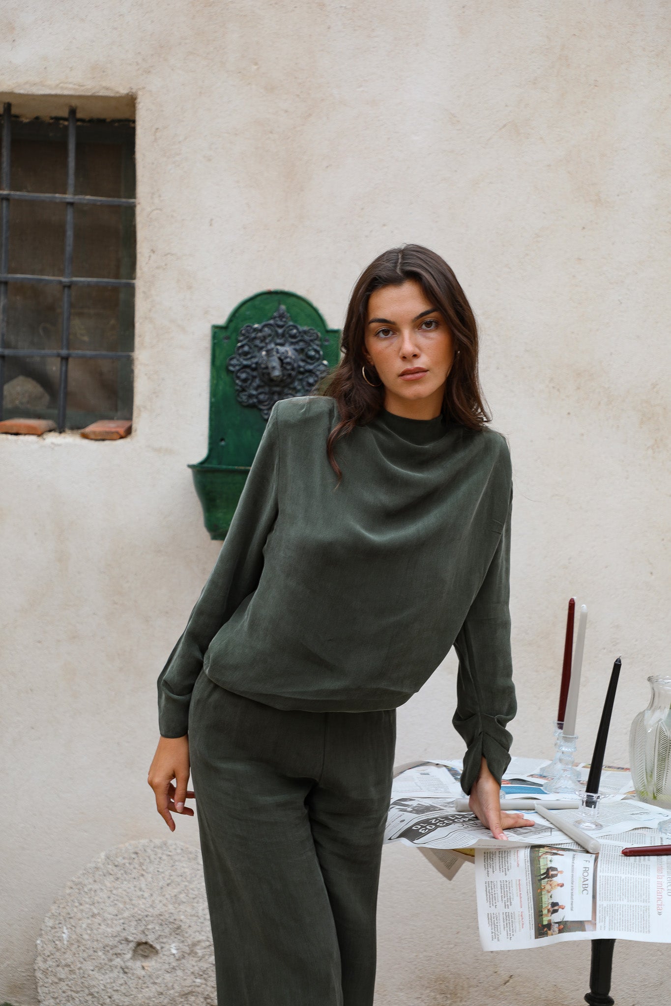 This sophisticated olive green cupro blouse features a closed draped neckline and structured shoulder pads, adding a modern touch to your wardrobe. The sleeves are accented with gathered detailing, bringing refinement to this timeless piece. Perfect for transitioning from day to night, this blouse pairs beautifully with tailored trousers or elegant skirts.